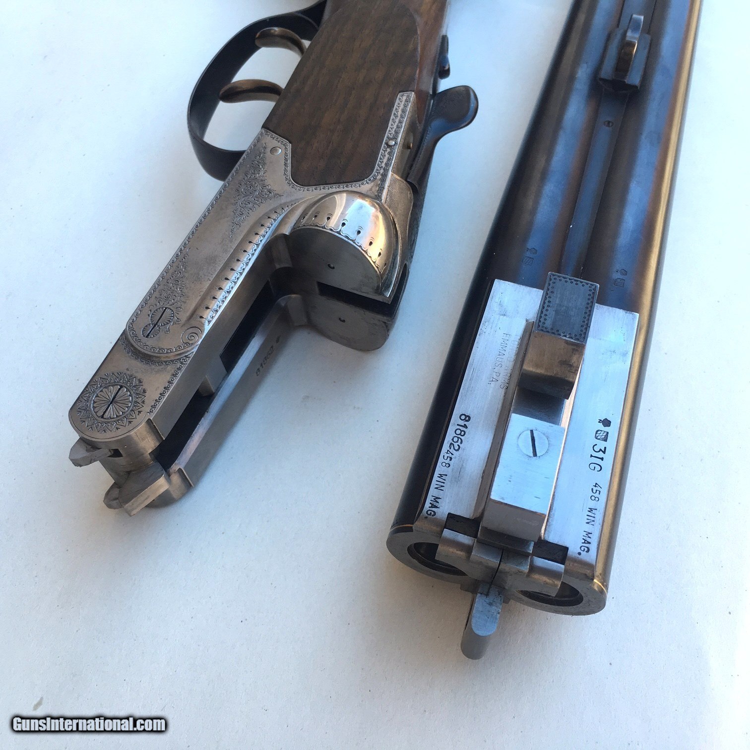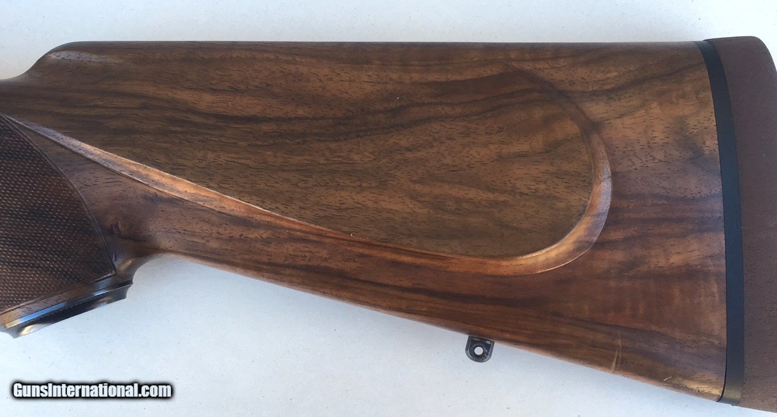 Description: Sale pending #81862. Heym 88 450 NE. Originally a 458 Win Mag that I rechambered in 450 3 ¼’ NE about 16 years ago. It has 25” barrels, disconnect ejectors, one standing V with a silver line and three folding . A 1/10” silver bead in the front. A set off claw mounts with a Leupold 1 to 5. The bores are like new, so is the bluing. With the scope and the shop load ( 480 Woodleigh and 68Gr of IMR 3031) it will shoot well ( picture of 55 yard target) The action is coin finished with 40% fine scroll coverage, in 95% condition. Massive Greener third fastener, cocking indicators, and articulated front trigger. The jointing is as tight as the day the rifle left the factory. Long tang going to a border engraved steel grip cap. The stock measures 14 5/8” with a 1 “ Decelerator pad, drop is 1 5/8” and to 2 5/8” and cast off is 1/4” . The stock is in good condition with some hunting marks mainly by the sling swivel. It has a 10-ounces Mercury recoil reducer that brings the total weight to 10Lbs. 7oz without the scope, 11Lbs. 3oz. with the scope. Accurate rifle ready for the field. SOLD Rifle Caliber: .450 Nitro Express Manufacturer: Heym Model: 88 Serial Number: 81862 Barrel Length: 25 Ejectors: Disconnect ejectors Condition: Good condition Metal Condition: 95% Wood Condition: Good Bore Condition: Like new Action: Coin finished Triggers: Articulated front trigger Stock Drop: 1 5/8 Stock Heel: 2 5/8 Stock Cast: 1/4" off Butt Pad: 1" decelerator pad LOP: 14 5/8 Weight: 10 Lbs 7 oz. / 11 Lbs 3 oz with the scope Engraving: 40% fine scroll coverage |