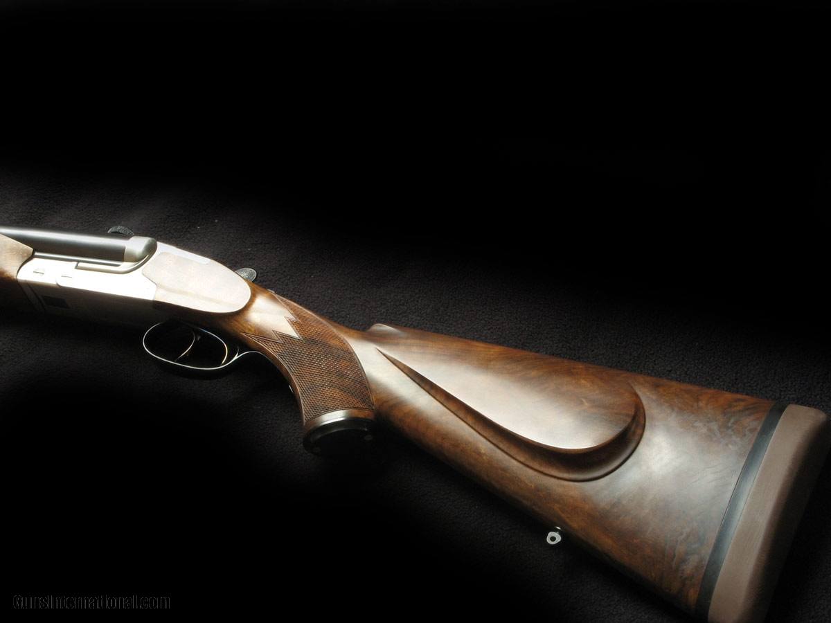 Description: High quality without the frills ... this 26" ejector rifle was scoped at the factory with a 30mm Schmidt & Bender Zenith 1.1-4x24mm illuminated reticle scope mounted in qd claw mounts, and it also has 4 leaf express sights on a quarter rib the 3 folding leaves unfiled. Cocking indicators and articulated front trigger. LOP 15" thru NECG pad, drops 1 3/4" and 2 3/4" to sights. Near new condition, regulates well with Hornady ammo. 11lb with scope. Best choice as a "client's " DG caliber. SOLD |