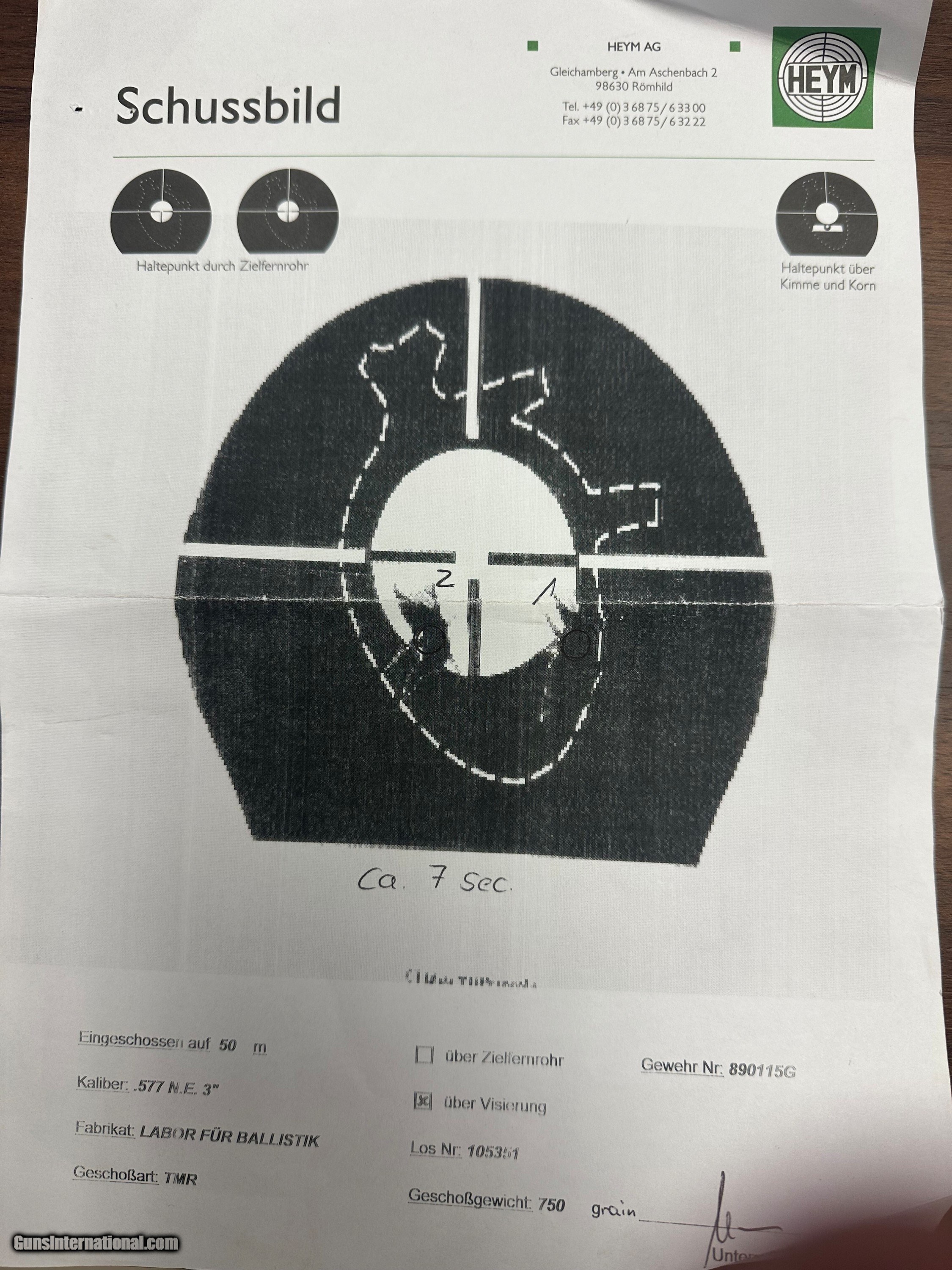 Description: Heym 89B .577 Nitro Express. 15" LOP Ejector on/off switch Grade 2 Engraving with Buffalo. 24" barrels some reloading and ammo supplies included. Rifle Caliber: .577 Nitro Express Manufacturer: Heym Model: 89B Ejectors: Yes Price: $40,000.00 Contact Seller |