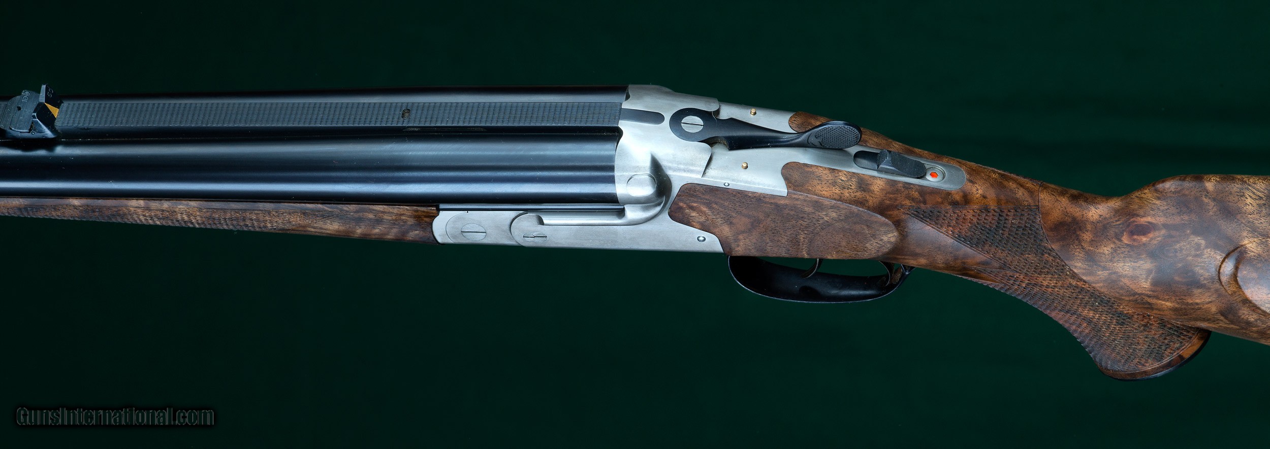 Description: 26" SxS shoe-lump barrels with ramp front sight, sling swivel, smooth swamped rib, matted quarter rib, 1 standing 50-yard gold-triangle-inlaid and 1 folding 100-yard express sights. 14 3/4" pull from articulated front trigger to solid brown NECG recoil pad. Trace of cast-off. Fully figured gnarly walnut stock with Deeley-release splinter forend, steel capped pistol grip, classic point-pattern checkering, and rear swivel base. Polished silver-finish, bolstered receiver with double Purdey underbites, Greener crossbolt, intercepting sears, automatic ejectors, cocking indicators and manual top tang safety. Weight: 10lbs, 9oz. Built 2012. 99%+blue. Tight and with excellent bores. With Murray Leather padded sling. In maker's hard case. SOLD |