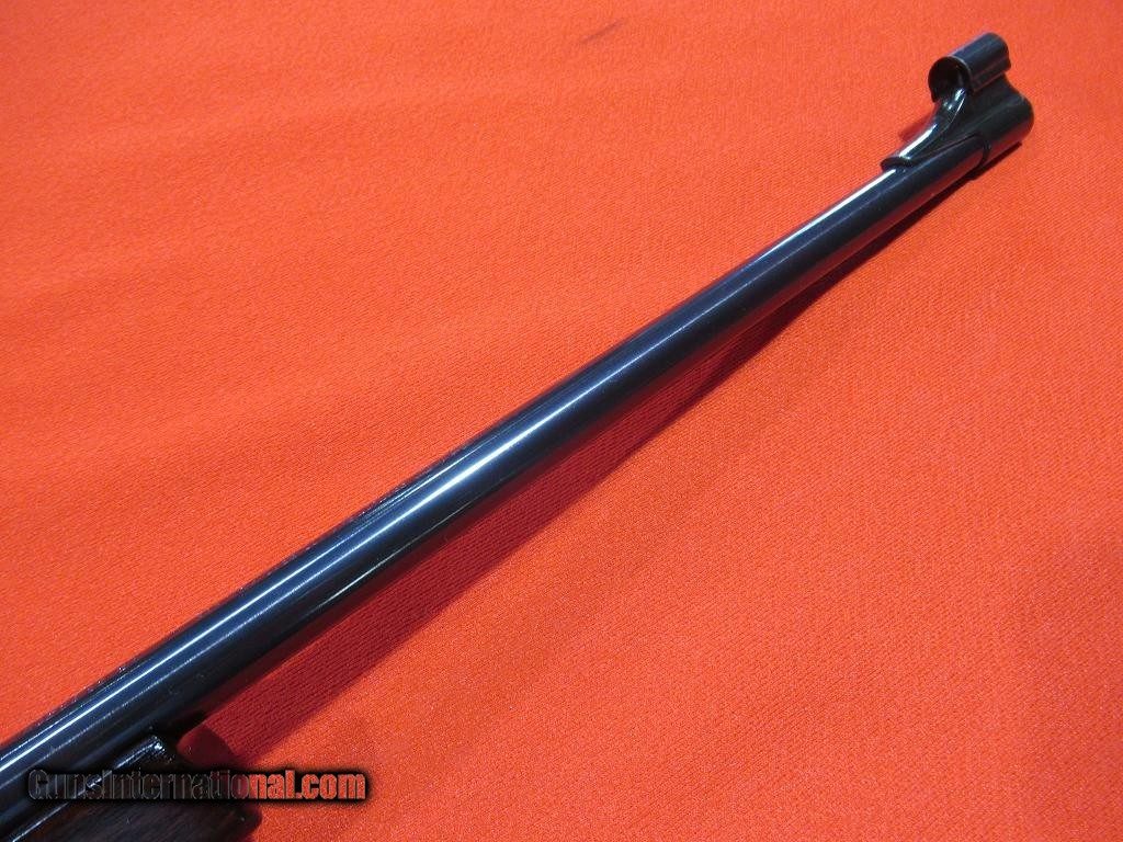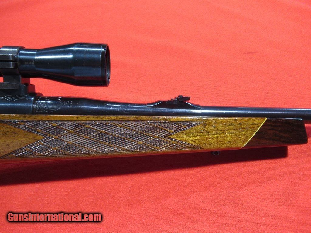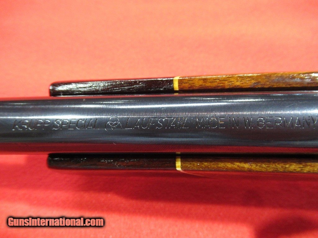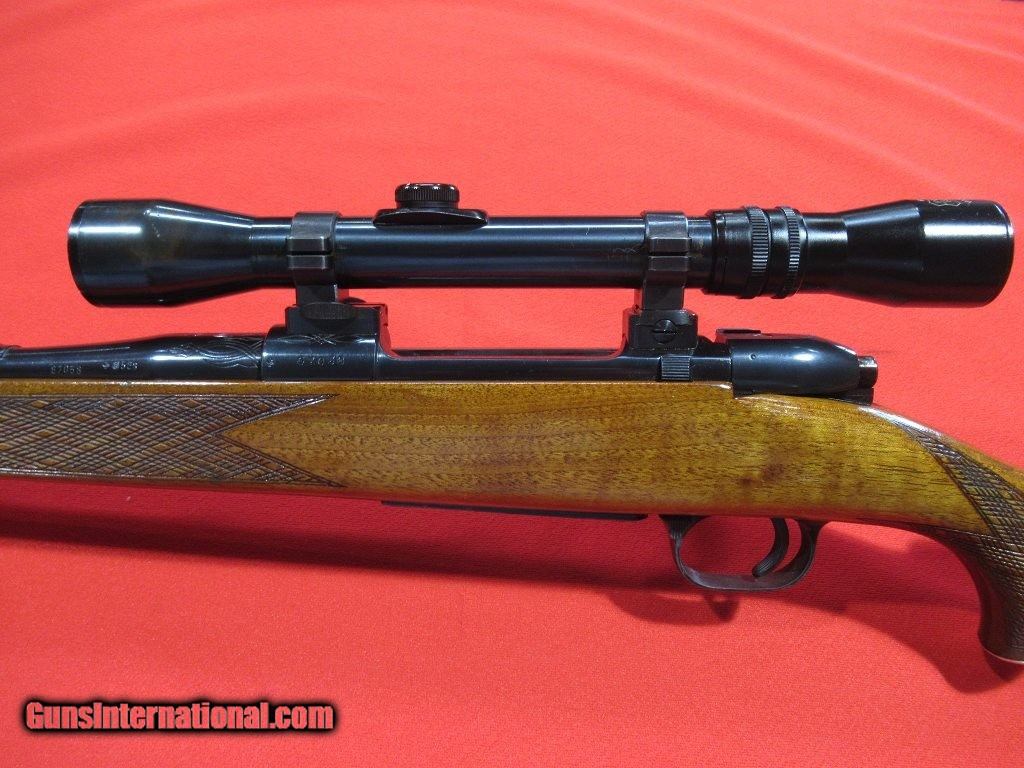 Description: Good condition overall showing some signs of field wear to the stock and blue: engraved receiver, folding rear sight, hooded front sight, alloy trigger guard and engraved floor plate, skip line checkering, contrasting forend tip, Pecar 3-7x variable scope with detachable tip off mount, Krupp steel barrel, checkered bolt knob, good bore. SOLD |