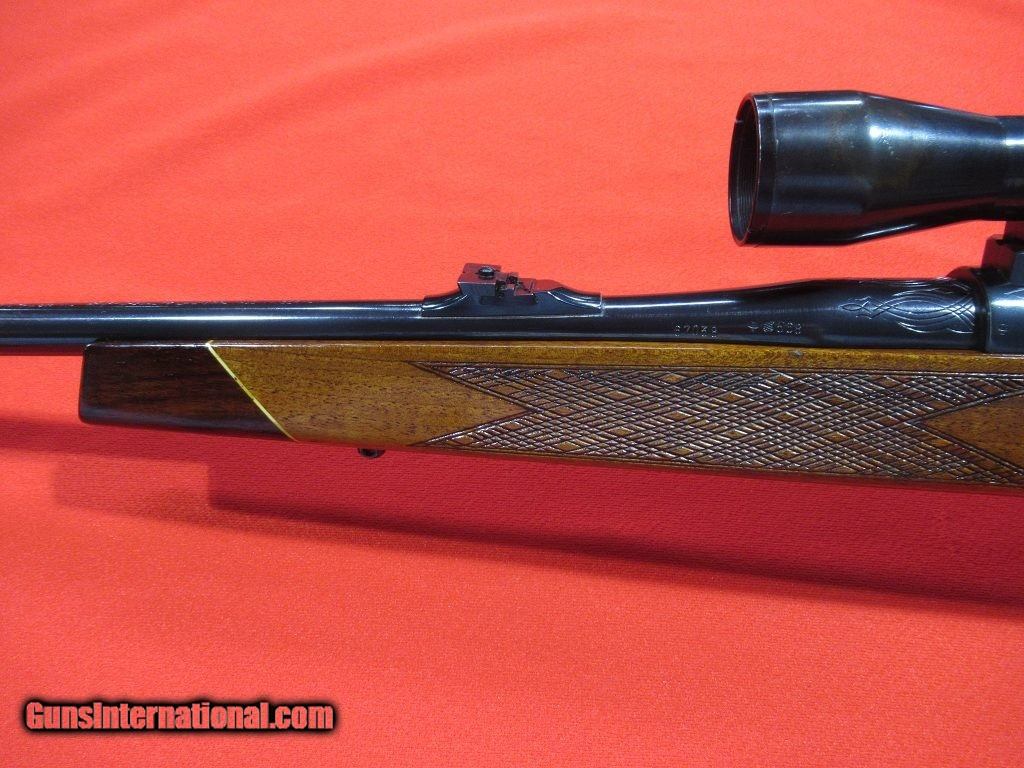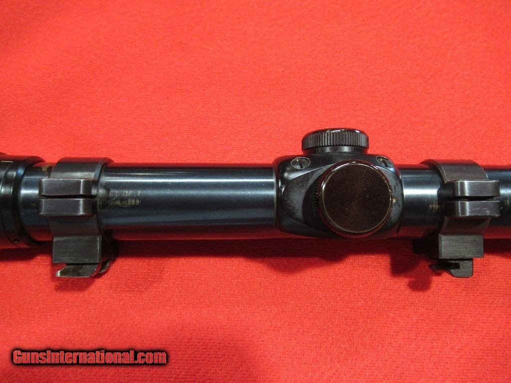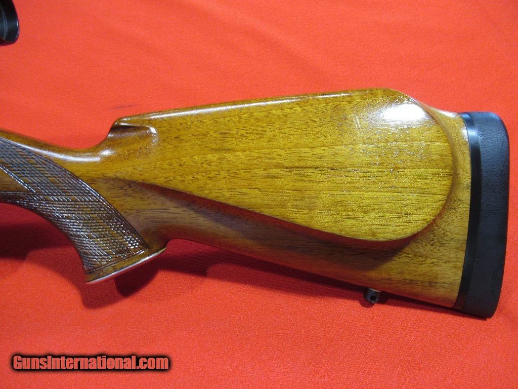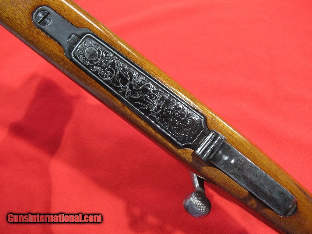 Description: Good condition overall showing some signs of field wear to the stock and blue: engraved receiver, folding rear sight, hooded front sight, alloy trigger guard and engraved floor plate, skip line checkering, contrasting forend tip, Pecar 3-7x variable scope with detachable tip off mount, Krupp steel barrel, checkered bolt knob, good bore. SOLD |
