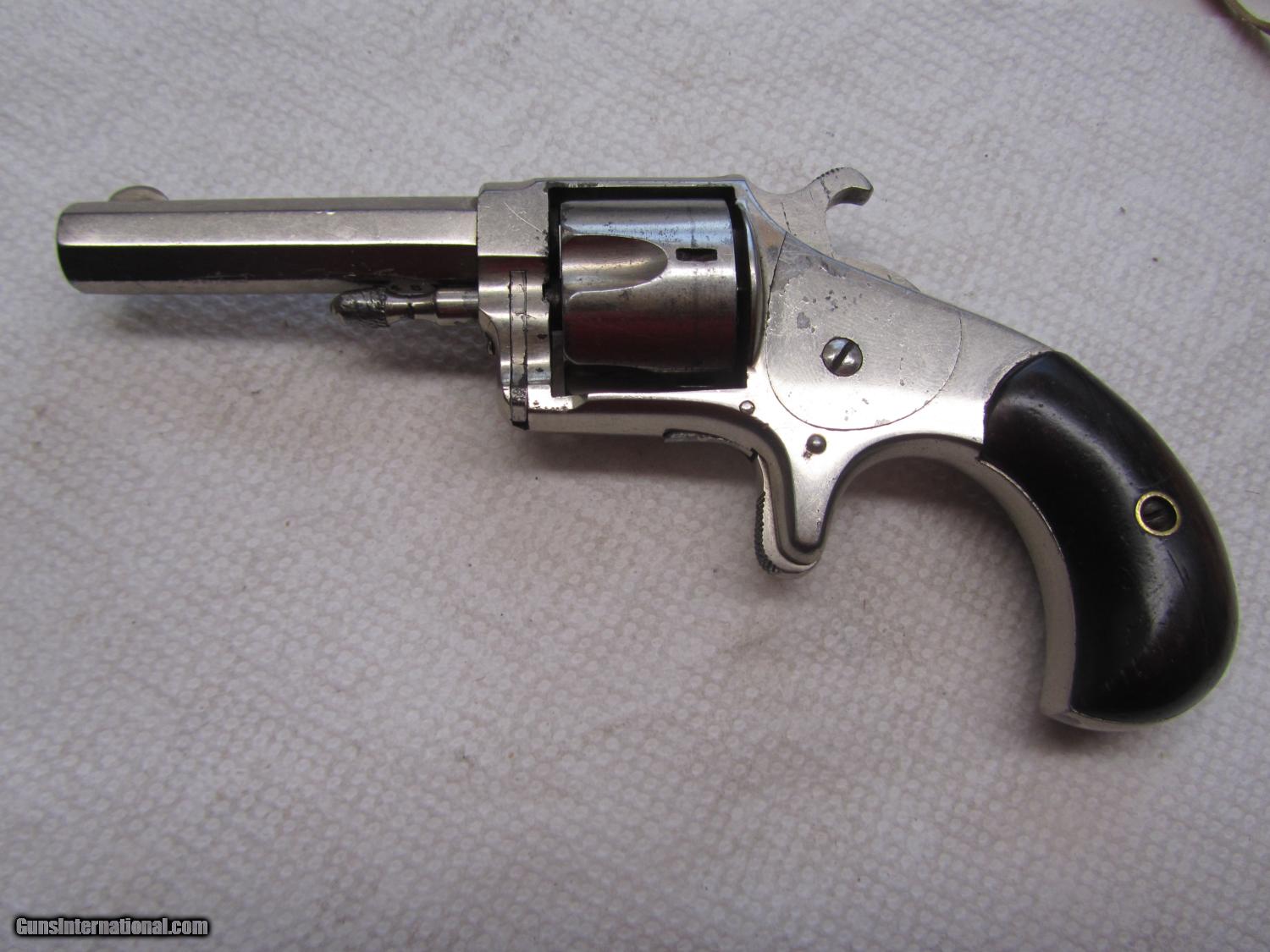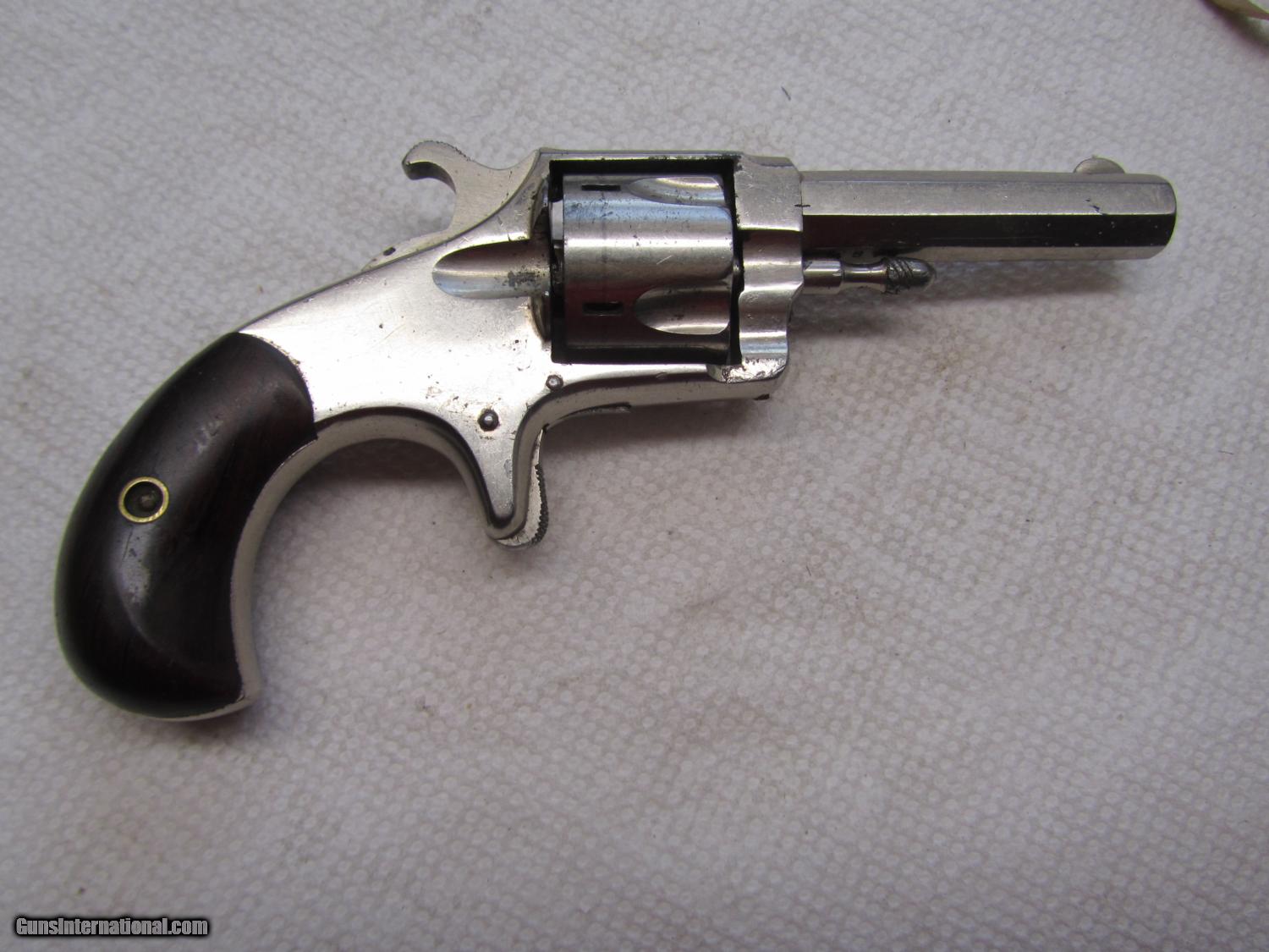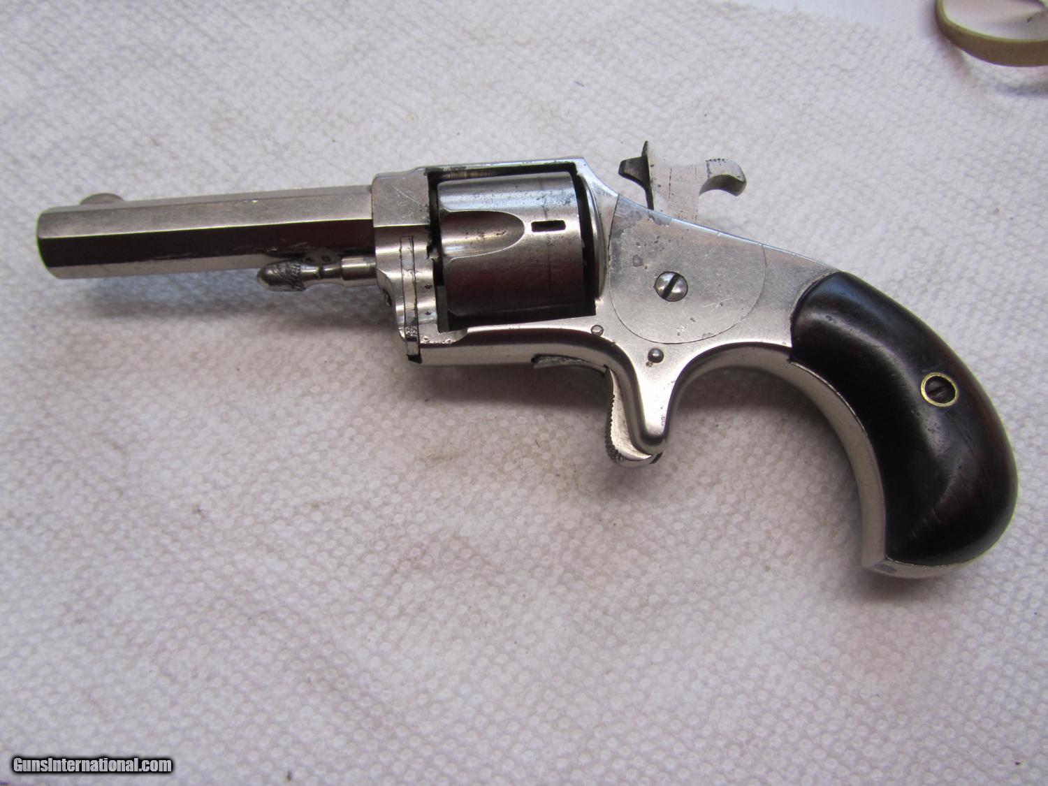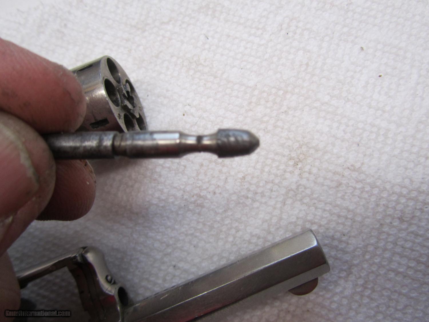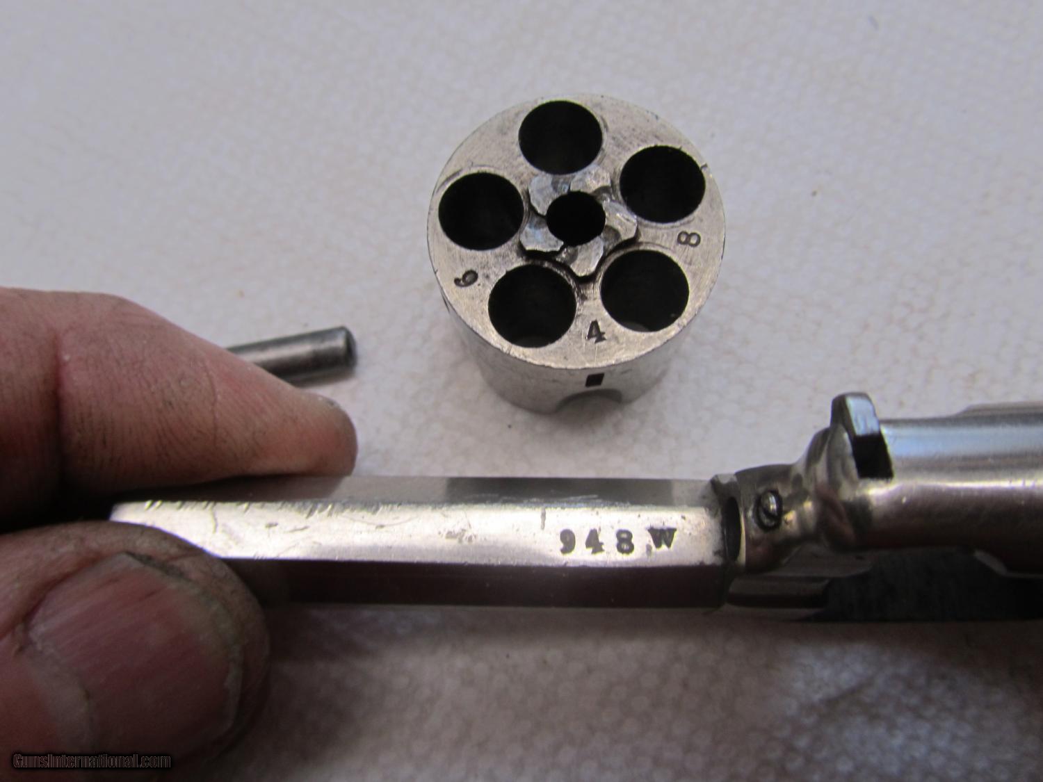 Description: Nickel plated Hopkins and Allen 32 cal rimfire revolver .2 and 1/2 inch barrel . maked XL no2 on topstrap . 70% nickel . All matching numbers . 948w marker on bottom of barrel, cylinder and cylinder pin . I have lots of photos . Thanks for looking . Call any time thanks Darrel SOLD Antique: Yes Manufacturer: Hopkins and Allen Model: XL no 2 Serial Number: 948 w Caliber Info: 32 rimfire Bore: 2 1/2 Chambers: 5 Condition: nice Metal Condition: 70% nickel Wood Condition: very good Bore Condition: some pits ,some rust Action: single Item Location: kansas |