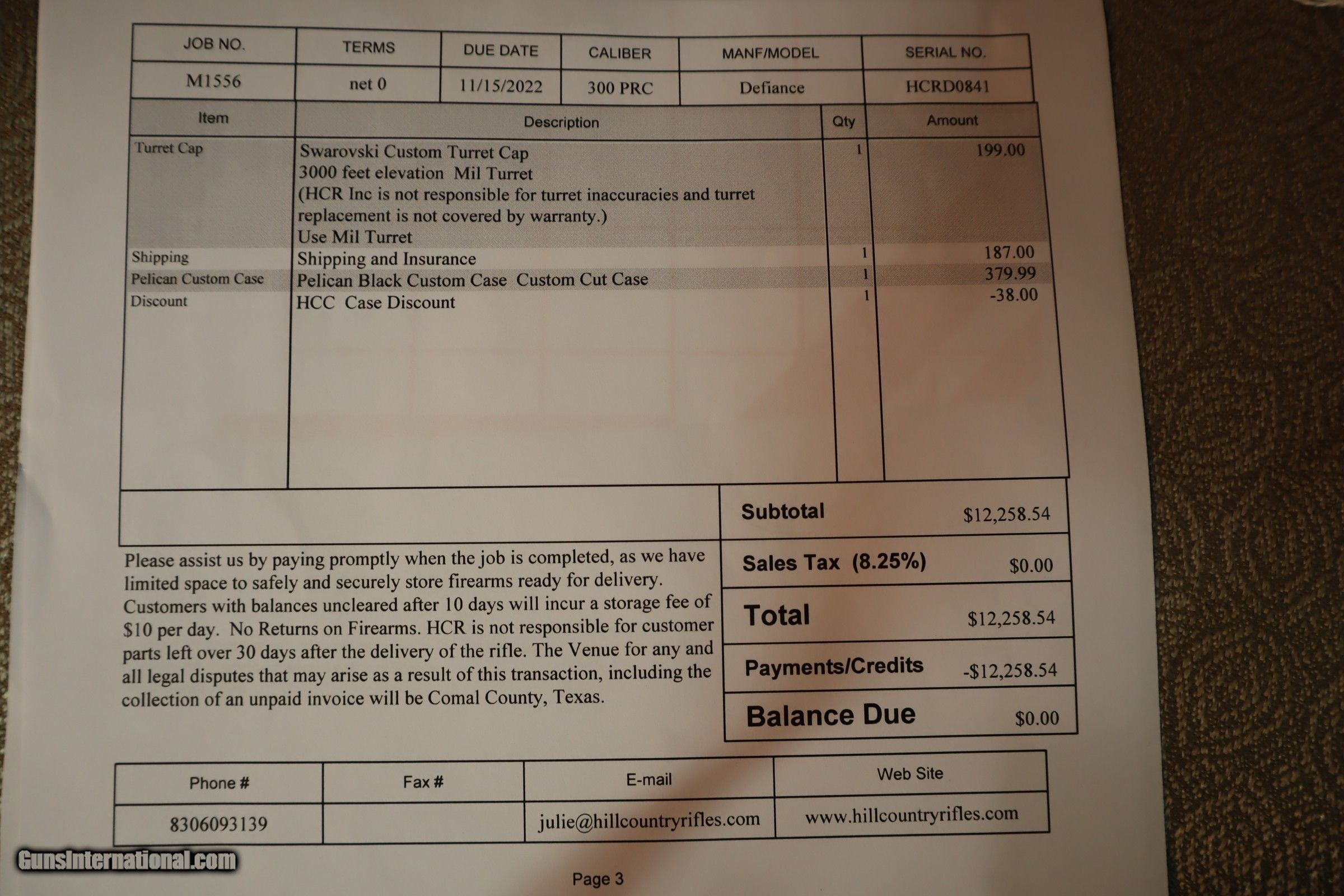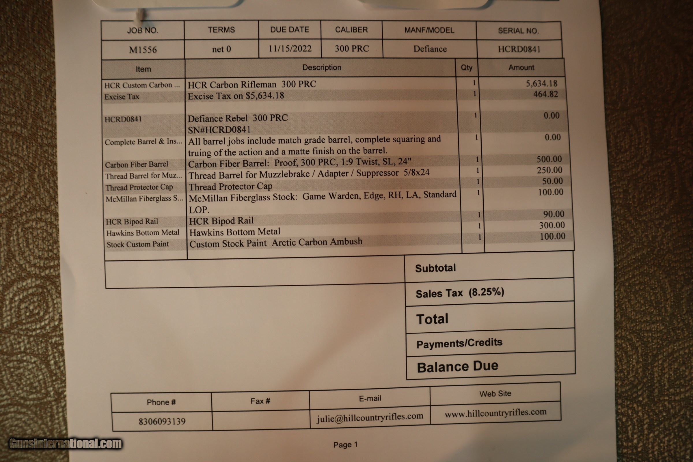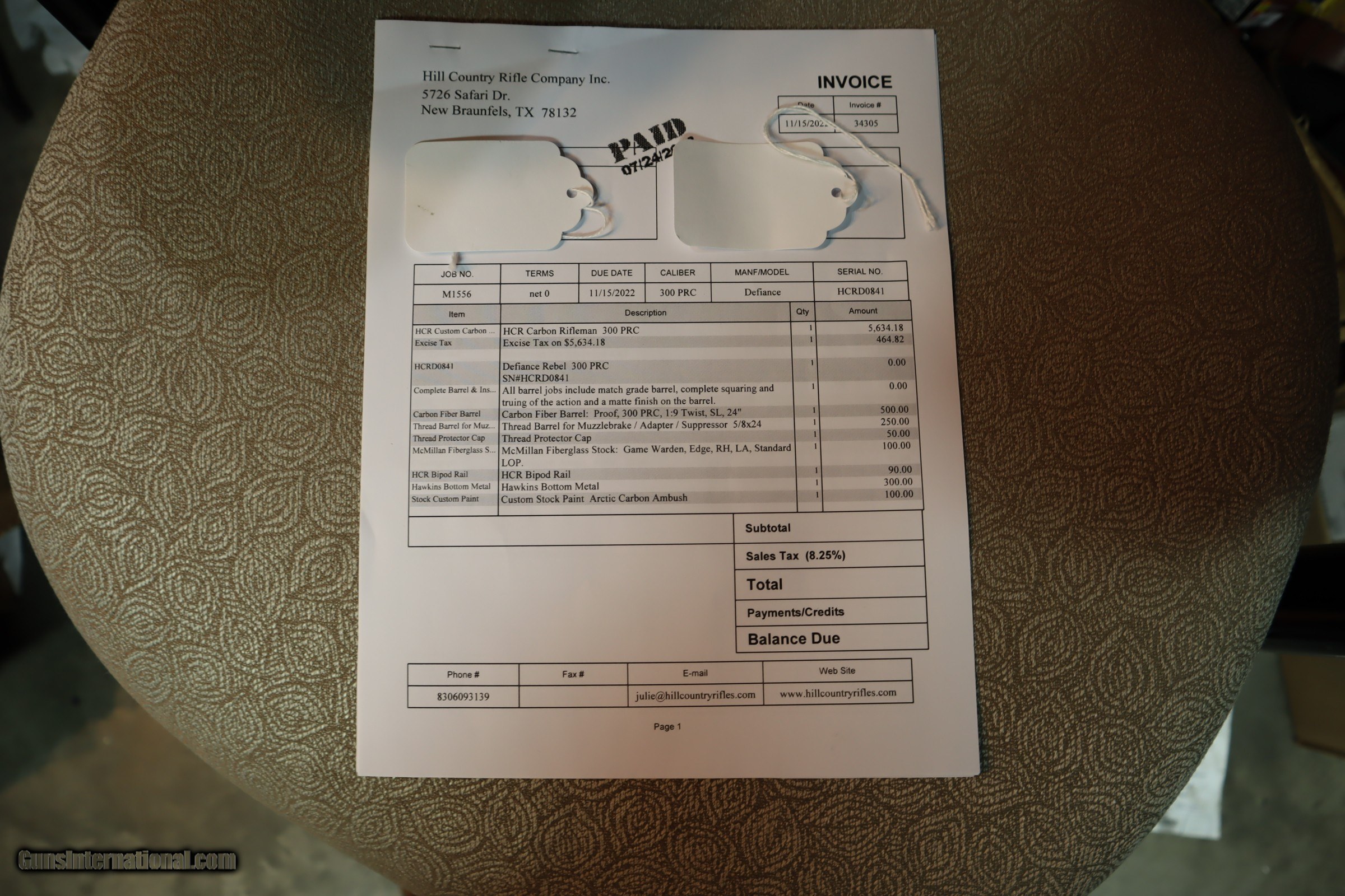 Description: Hill Country Rifles Carbon Rifleman 300PRC 24" carbon fiber barrel,Defiance Rebel Action,McMillan stock,5 magazines,Swarovski Z8i 2.3-18x56 scope,new unfired,cost was $12000 and a long wait for delivery,rifle and scope weighs 9lbs,with paperwoek,ON SALE $7995.Ammo available also,Hornady Precision Hunter 212gr ELD bullets,50 boxes,1000 rounds was $2200, on sale $1500.Great rifle at a great price!! GUN COLLECTIONS WANTED FOR CASH! We buy, sell, consign and trade new and used firearms. This is our 48th year in business. We offer 90 day layaways with 20% down. No return on layaways. Firearms will need to be transferred through a FFL dealer. Prices reflect a cash discount. There will be 3% added to credit card sales. We trade for gold and silver. THANK YOU! SOLD |