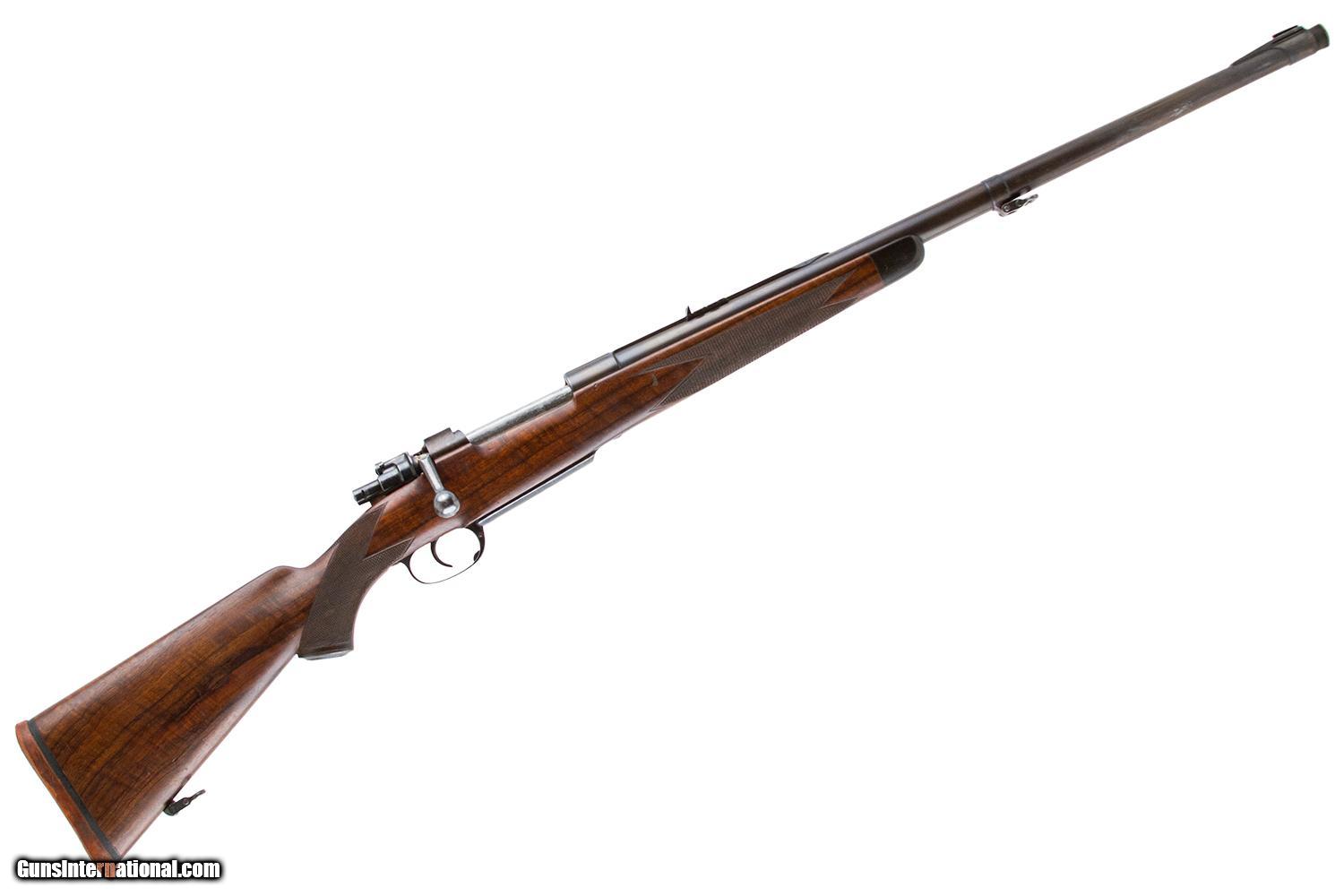 Description: #206 KORNBRATH ENGRAVED THIS RIFLE HAS BEEN TO AFRICA SEVERAL TIMES BUT HAS GOOD HONEST WEAR IT SHOWS BLUE WEAR AND HANDLING MARKS IN THE WOOD 26 1/2" BARREL WITH 1/4 RIB AND 1 STANDING AND 2 FOLDING SINGLE SQUARE BRIDGE MAGNUM MAUSER ACTION MECHANICALLY SOUND JEWELLED BOLT ORIGINAL SWIVELS 10LBS 2 OZ X 13 3/4 LOP SOLD |