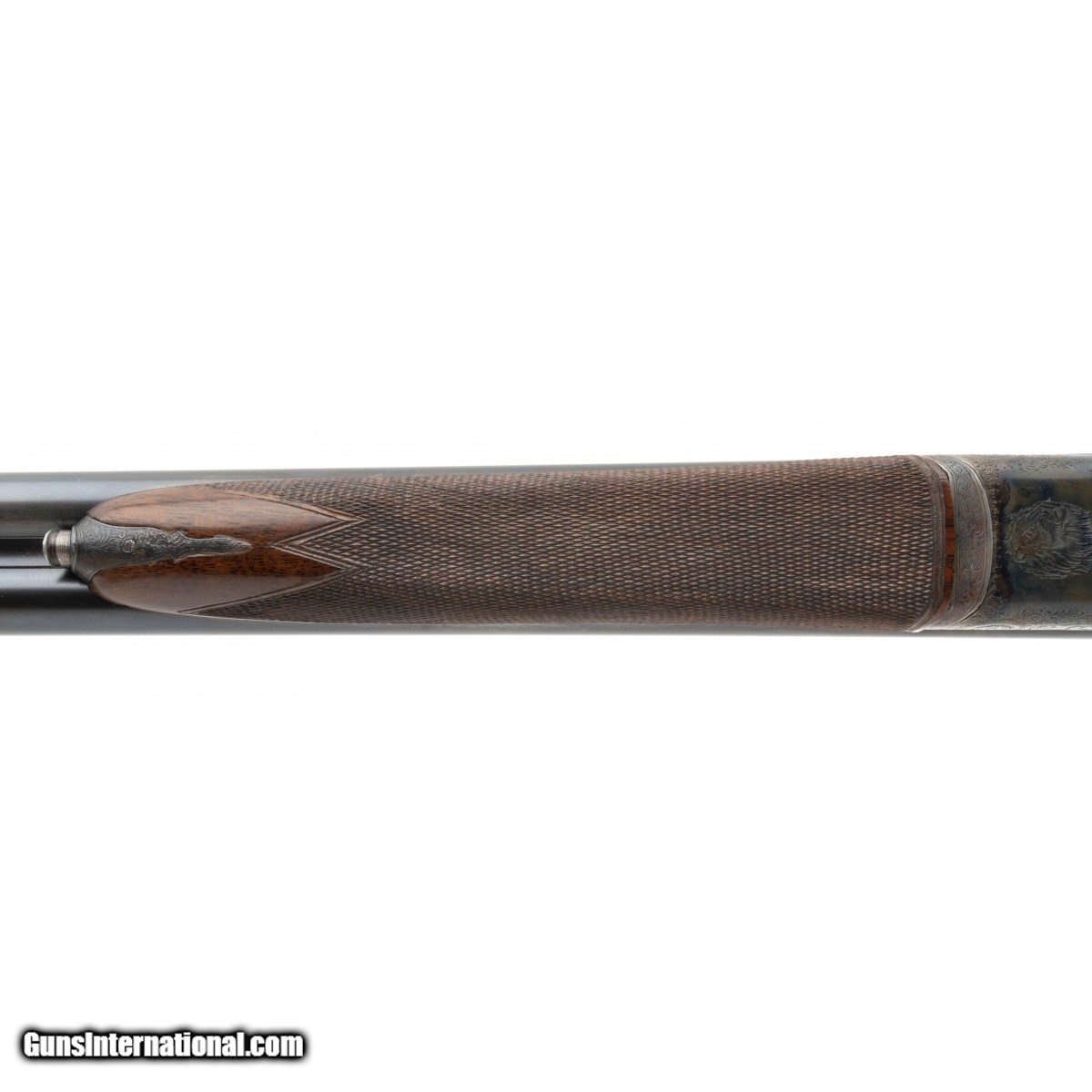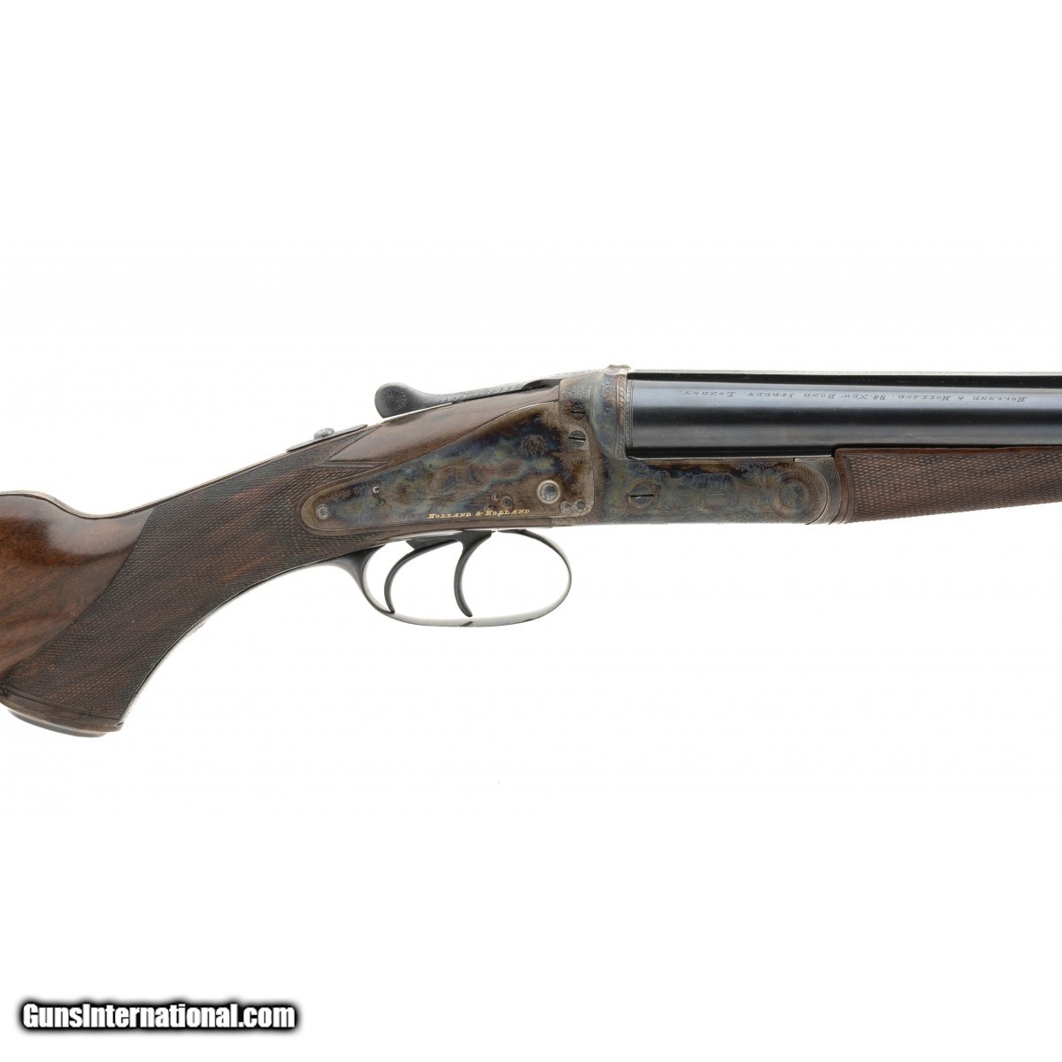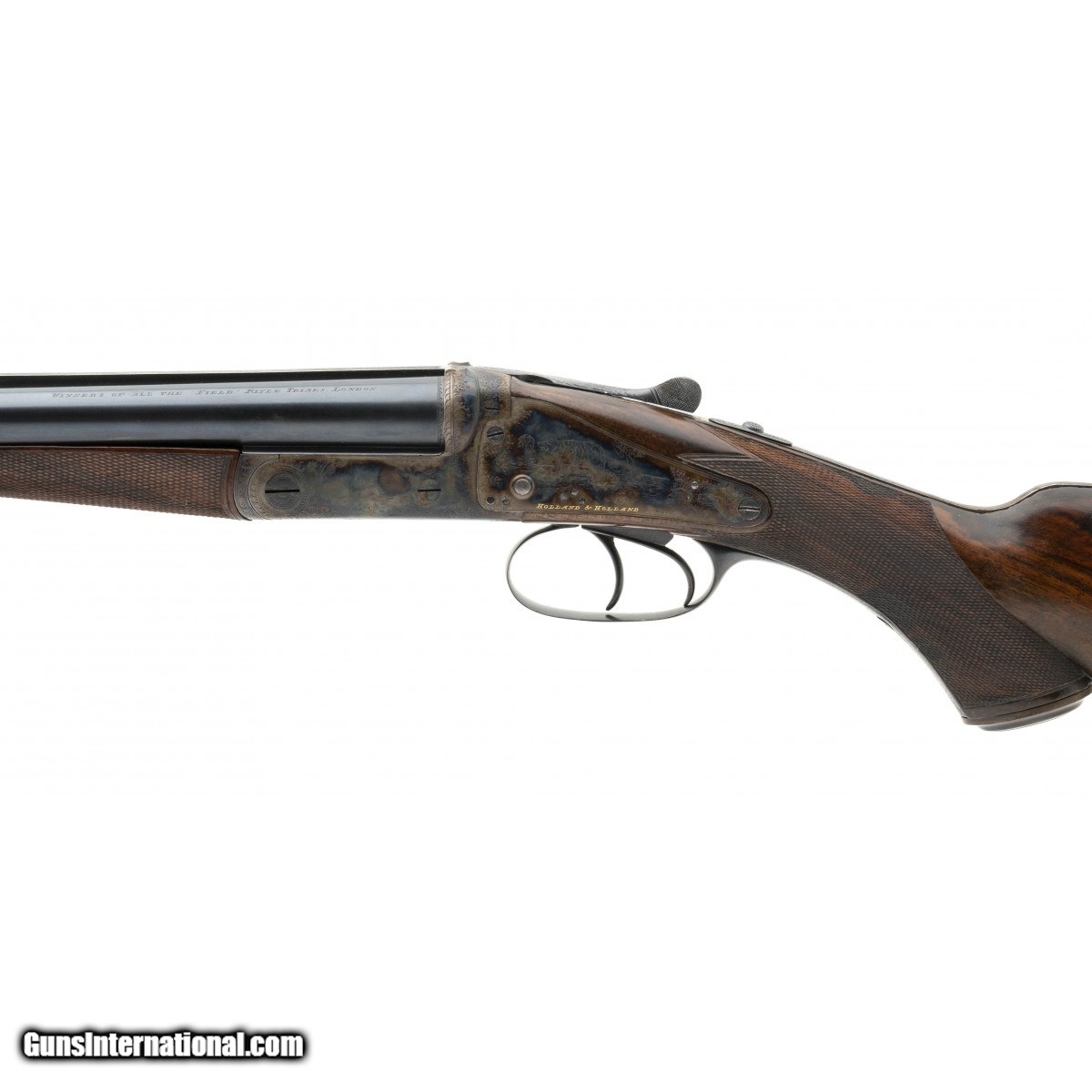 Description: " Serial number 12049. T450 Express BPE 3 ¼" with 28" barrels. This gun has been expertly restored to new condition. Action works perfectly. Bores are very good with nice sharp rifling and bright and shiny. The action is engraved with multiple game scenes featuring bears, a dear a lion and a tiger. These are typical scenes you see on guns that were to be either sent, or used in India. The top rib of the barrel is marked “HRH THE NIZAM of HYDERABAD 1888" This was the king of the Hyderabad region. Stock is excellent. Very fine example of a Holland and Holland Double Rifle SOLD |