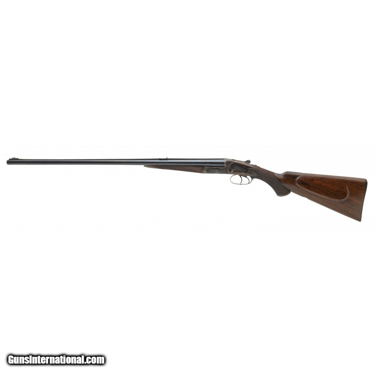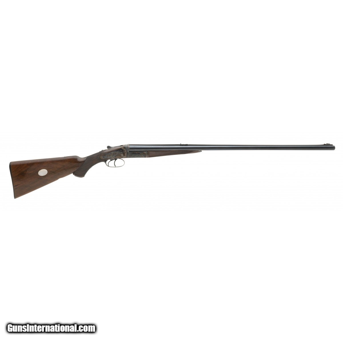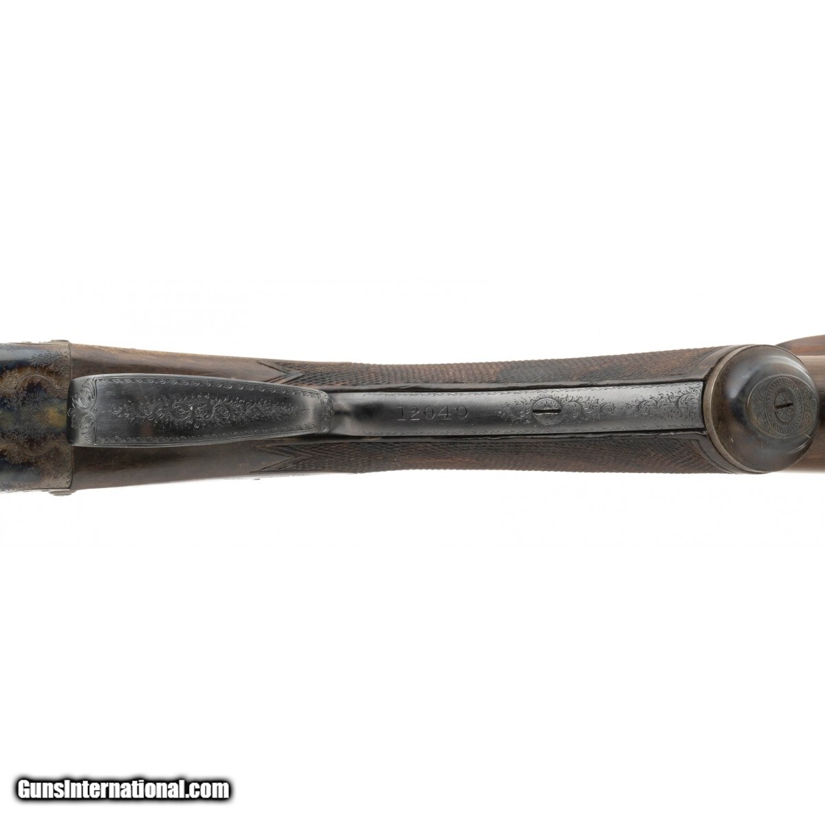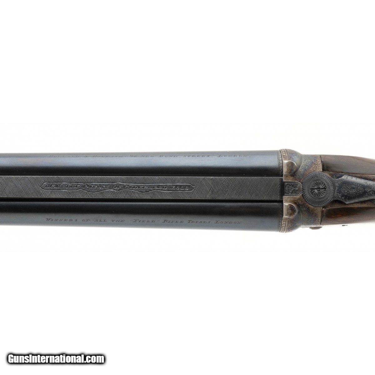 Description: " Serial number 12049. T450 Express BPE 3 ¼" with 28" barrels. This gun has been expertly restored to new condition. Action works perfectly. Bores are very good with nice sharp rifling and bright and shiny. The action is engraved with multiple game scenes featuring bears, a dear a lion and a tiger. These are typical scenes you see on guns that were to be either sent, or used in India. The top rib of the barrel is marked “HRH THE NIZAM of HYDERABAD 1888" This was the king of the Hyderabad region. Stock is excellent. Very fine example of a Holland and Holland Double Rifle SOLD |
