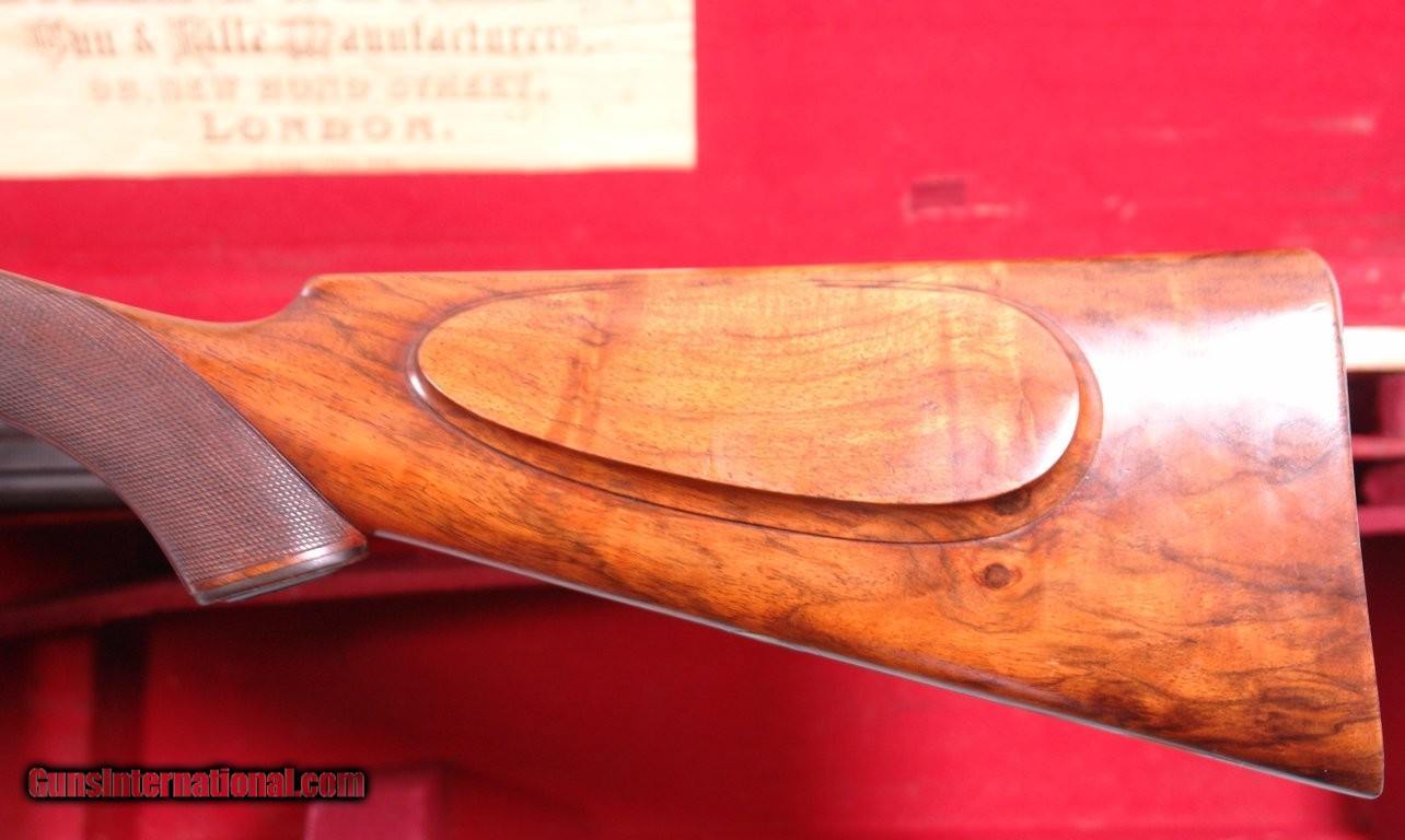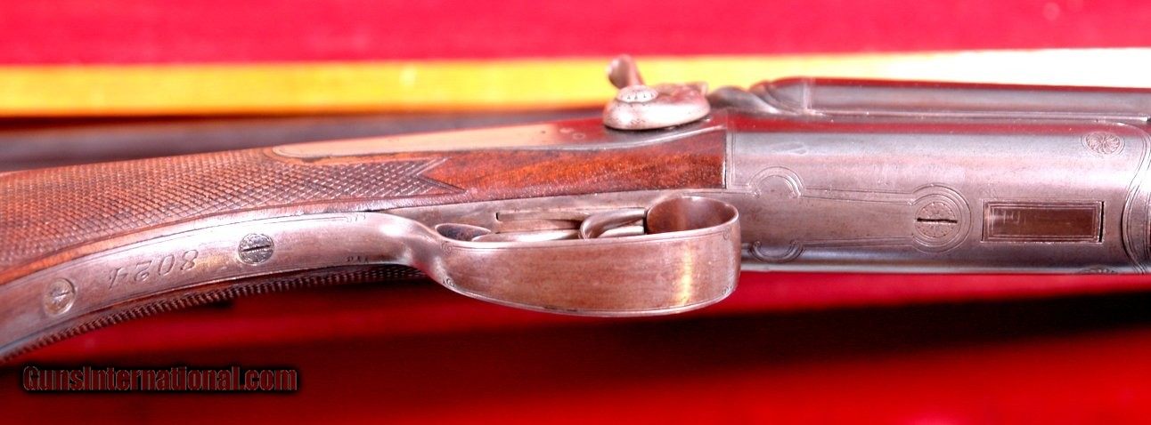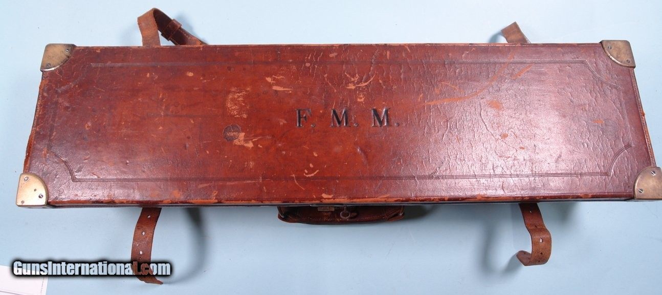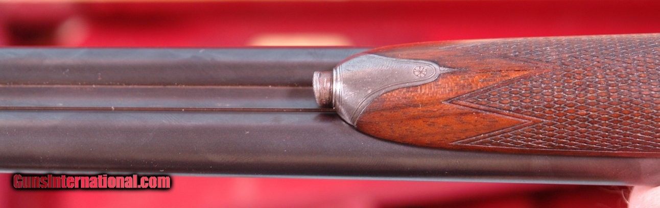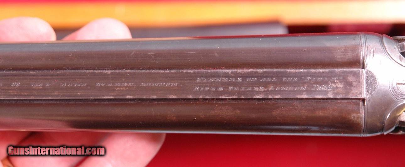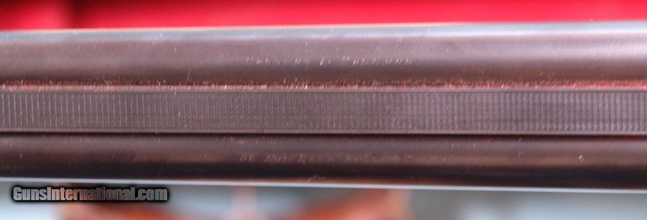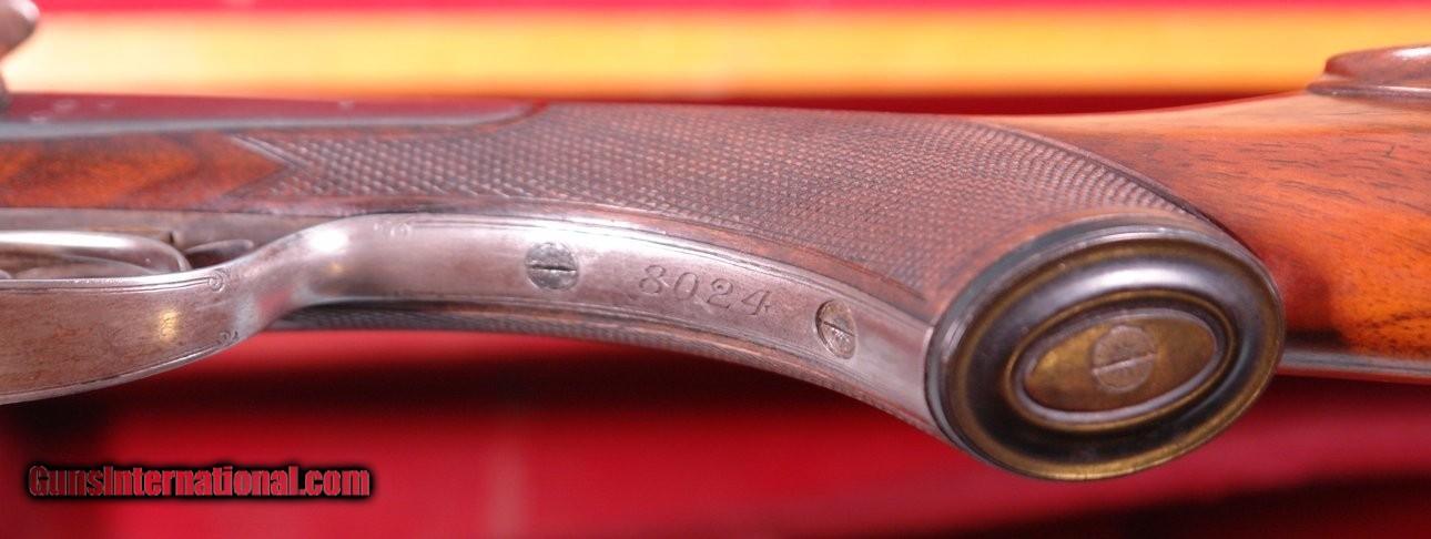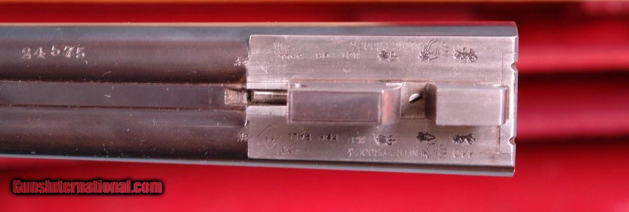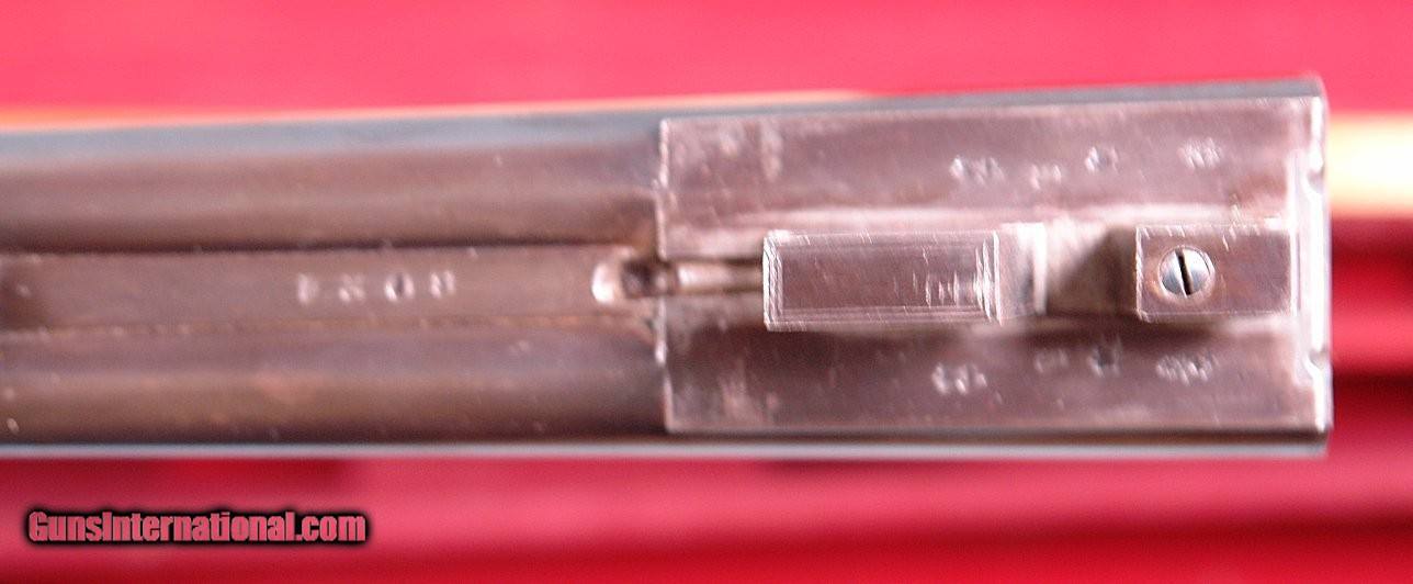 Description: CASED HOLLAND & HOLLAND TOP LEVER DOUBLE HAMMER .300 ROOK & RABBIT RIFLE & .410 GAUGE SHOTGUN 2 BARREL SET. 1884 production “C” Grade small frame double hammer rifle serial numbered in the 80xx range and all matching and all original as sleeved to 300 Rook caliber and stamped “S” on underside of both barrels to indicate same. Rifle barrel length 26” with blade front and 3 leaf express rear sights. Holland & Holland, 98 New Bond Street, London address on center rib as well as “WINNERS OF ALL THE FIELD/RIFLE TRIALS LONDON 1883” near the breech. London black powder proofs stamped on underside. Both locks engraved “HOLLAND & HOLLAND”. Original checkered walnut pistol grip checkered butt, and cheek rest stock. Original forend numbered to gun. 22 ½” .410 gauge shotgun barrels with 2 ¾” chambers and choked Improved Cylinder in both. Underside of barrels with London Nitro proofs and serial numbered in the 24,xxx range for 1905. Barrels engraved “HOLLAND & HOLLAND” and “98 NEW BOND STREET. LONDON”. Excellent overall with both barrels with nearly all the original finish. Stock and forend with the original finish as well. Frame and locks with untouched very pleasing greying case hardening. Perfect working order and excellent bores. Holland and Holland oak and leather luggage case with Holland & Holland, 98 New Bond Street, London label in very good original condition including the red baize lining. Very lovely little hammer Holland & Holland set. SOLD Antique: Yes Rifle Caliber: .300 Rook Shotgun Gauge: .410 Gauge |