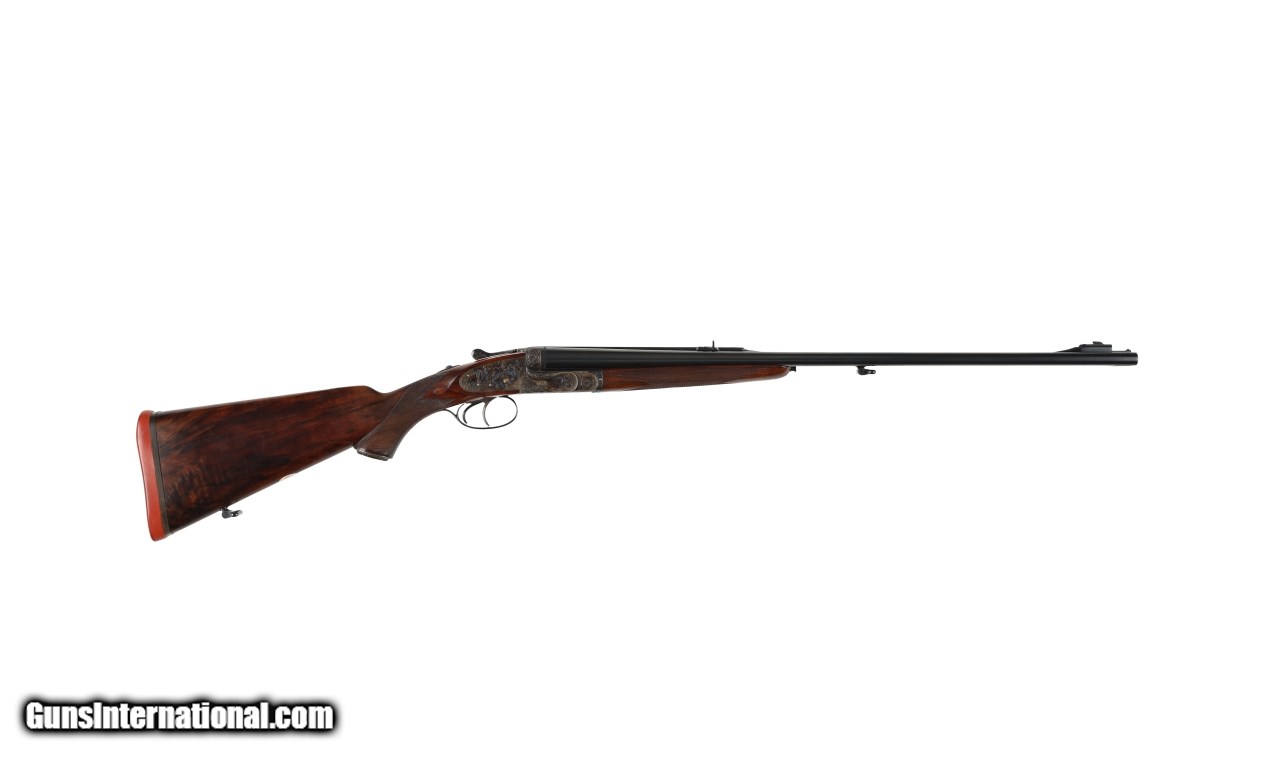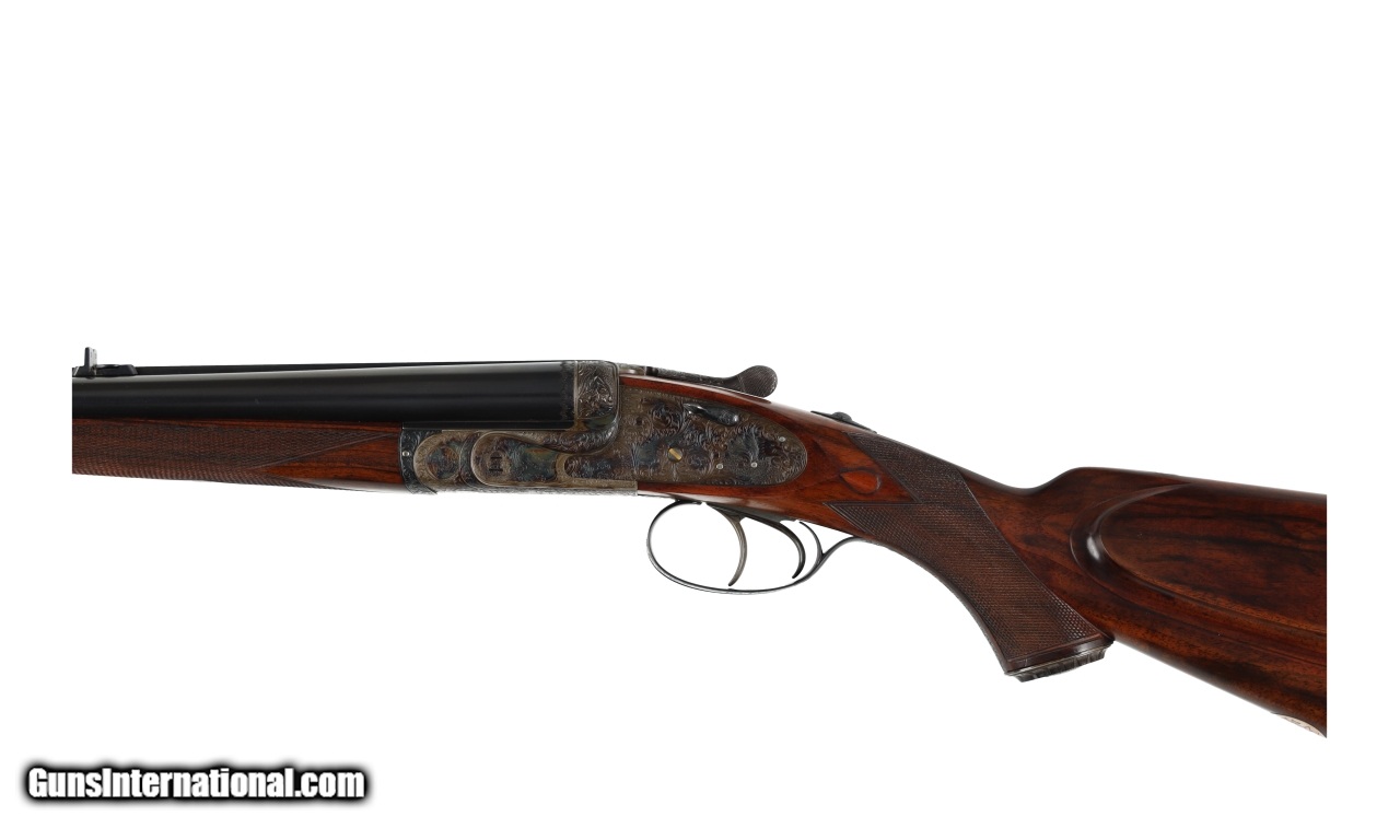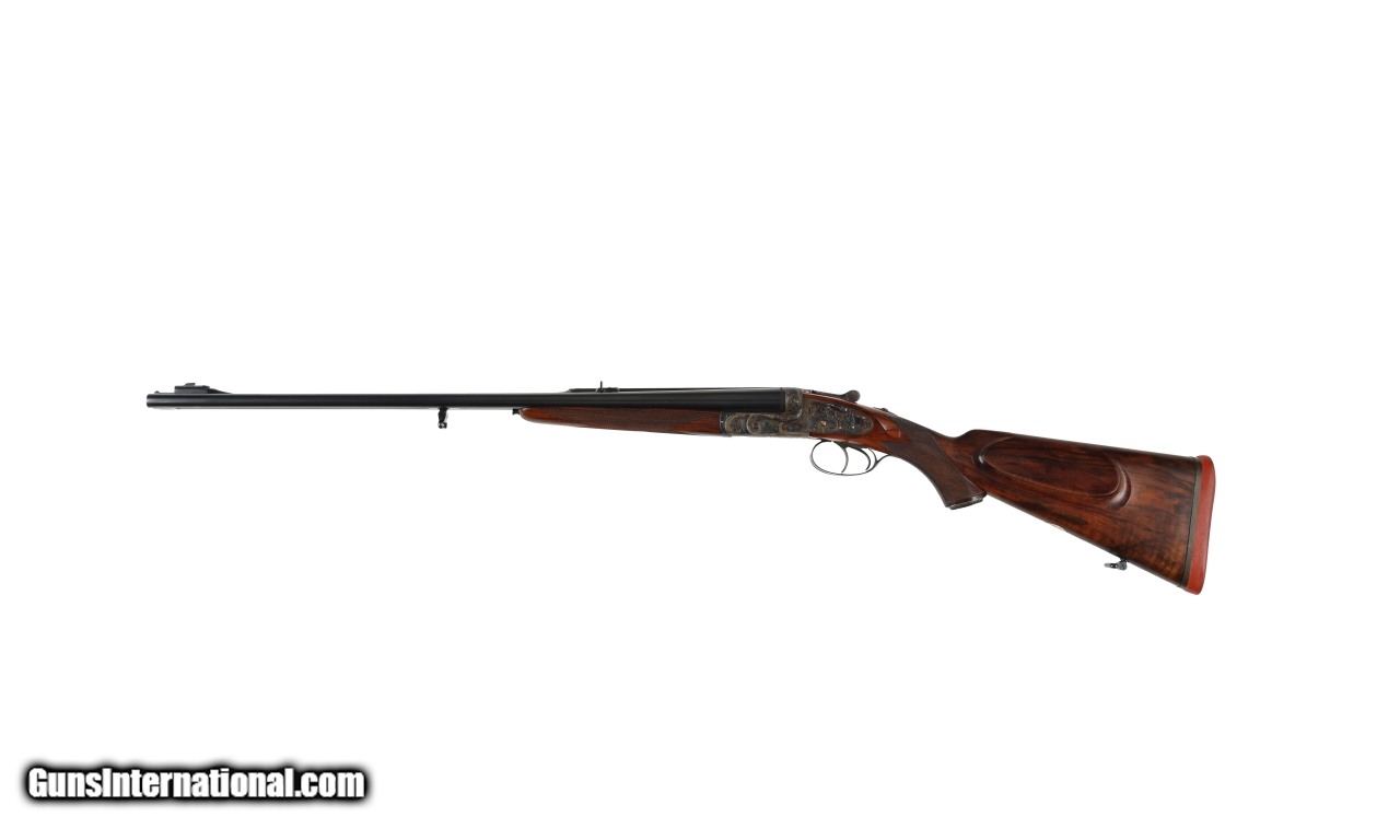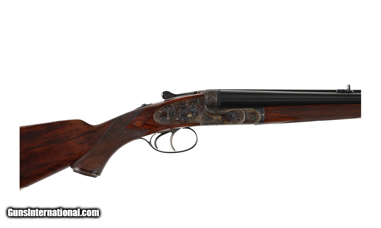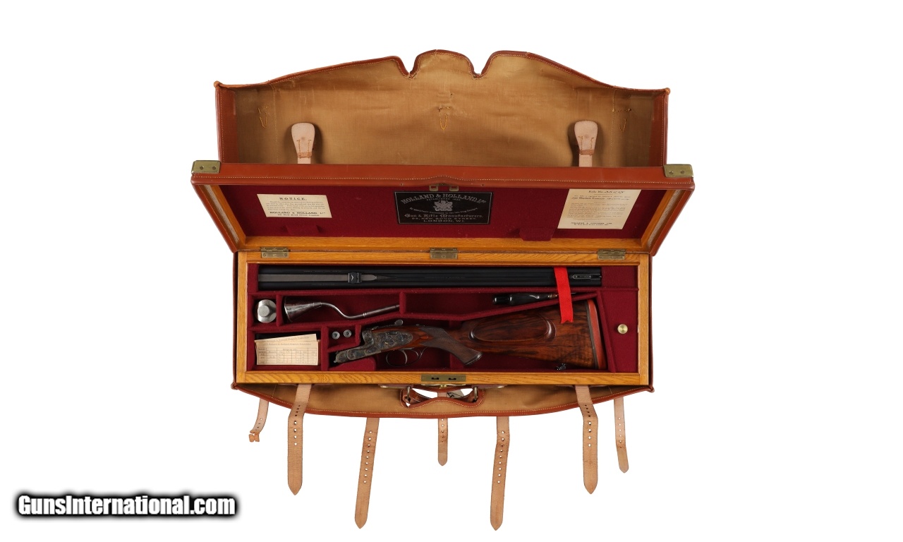 Description: Rifle is in very good condition. Butt pad has been compressed from cabinet storage. Manufactured in: England Hand: Right Hand Action Finish: Case Colored Metal Finish: Original Barrel Length: 25 Inches Barrel Condition: Very Good Stock Finish: Original Stock Condition: Very Good Type of Butt: Rubber Pad Pad Thickness: 1" Grip: Pistol Forend: Checkered SOLD Manufacturer: Holland & Holland Model: Deluxe Caliber Info: .375 Flanged Condition: Preowned Metal Condition: Very Good Action: Sidelock Triggers: Double Fore End: Checkered Butt Pad: 1 LOP: 14 1/2 Finish: Original Weight: 9 Case: Oak & Leather |