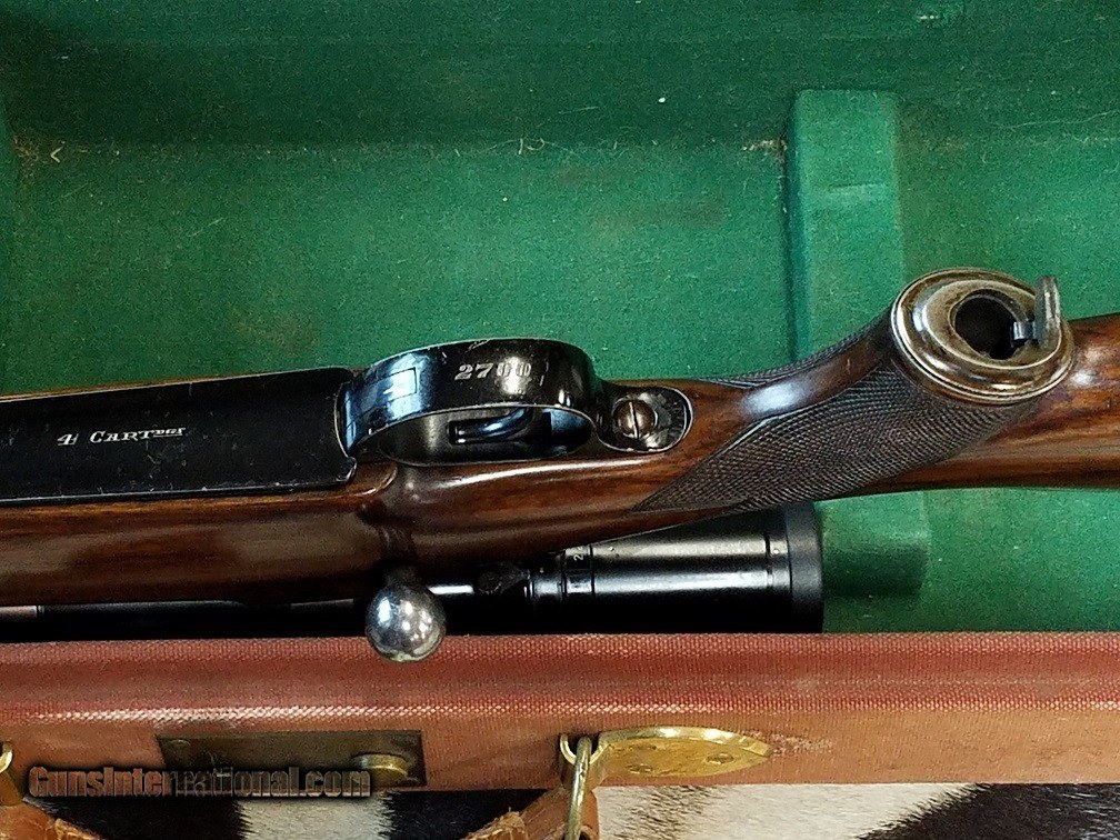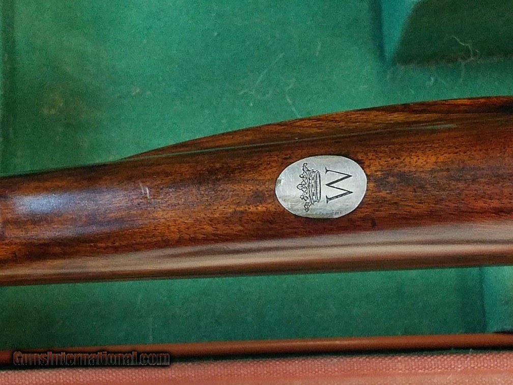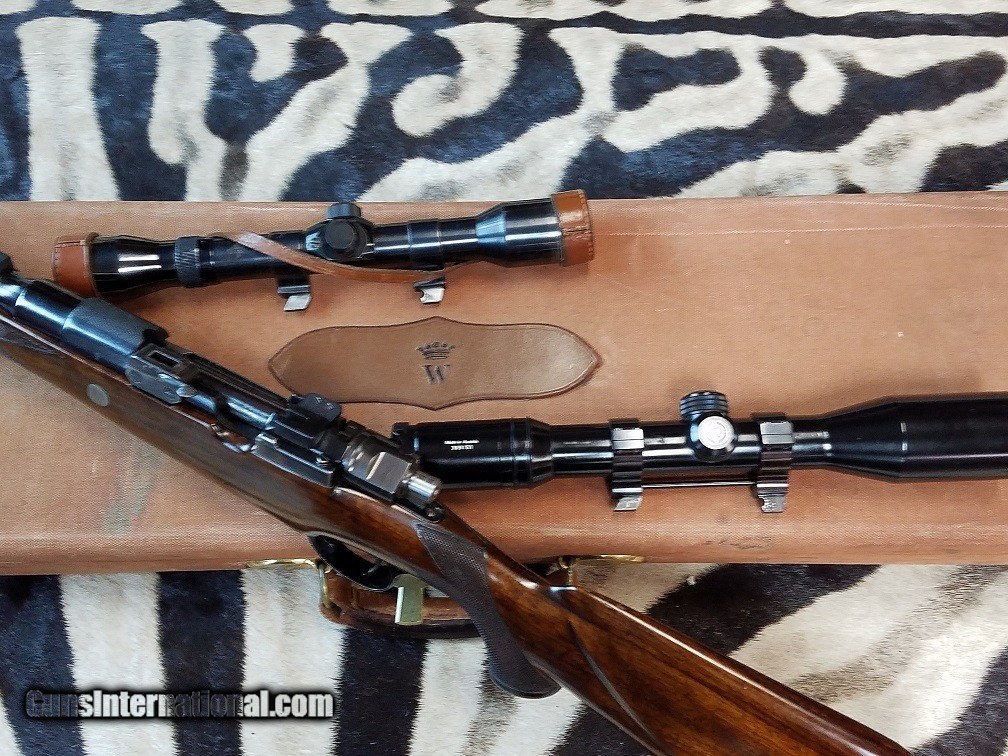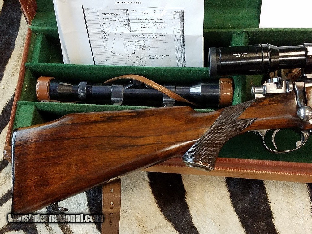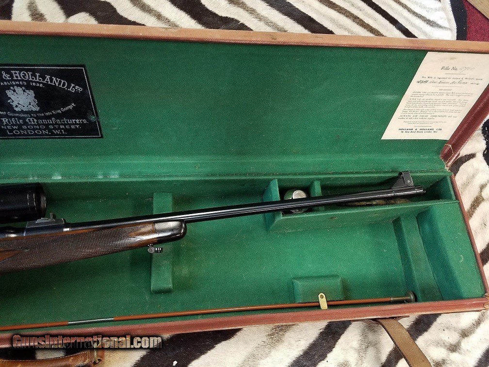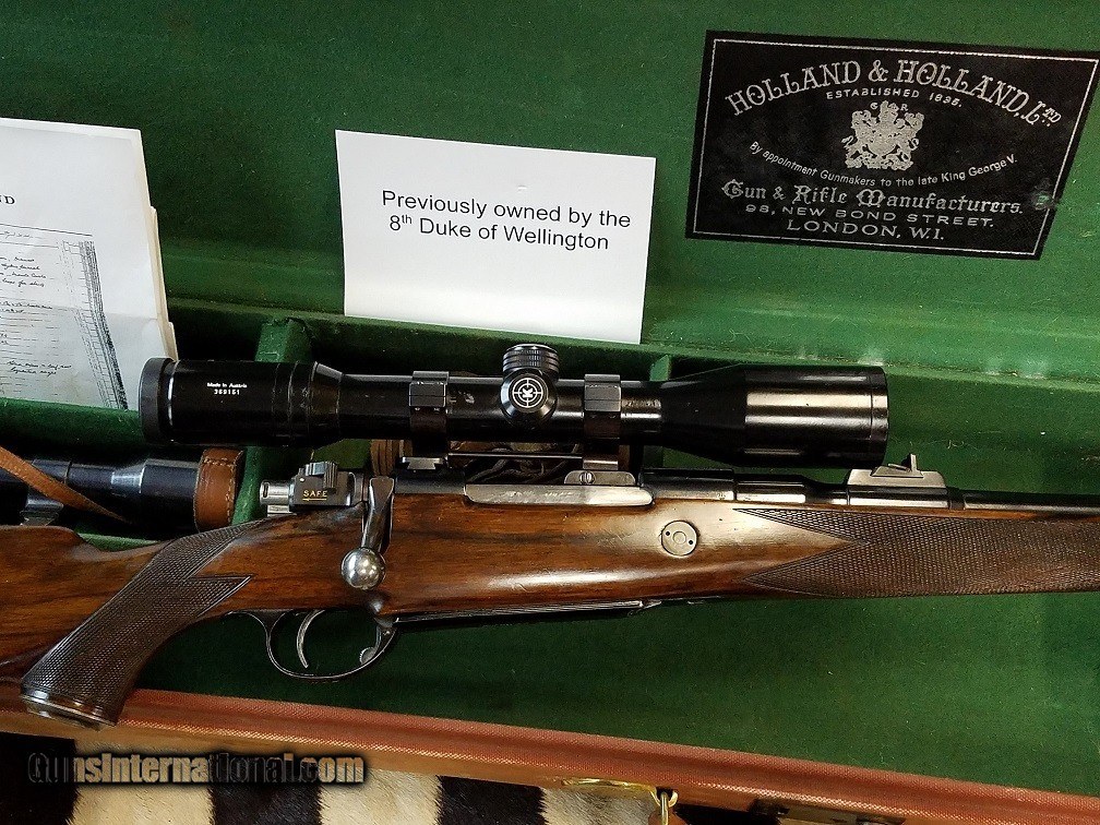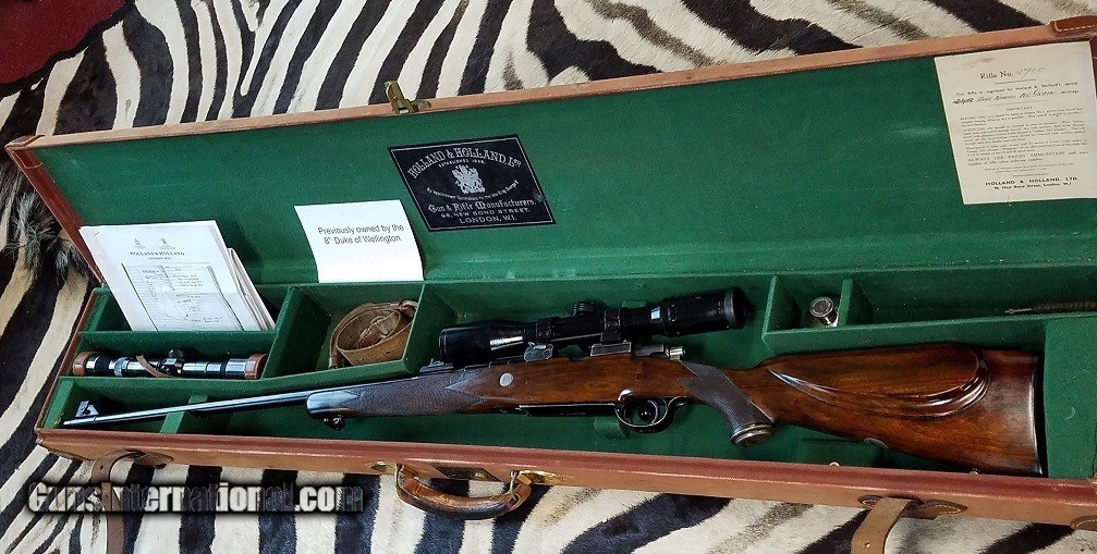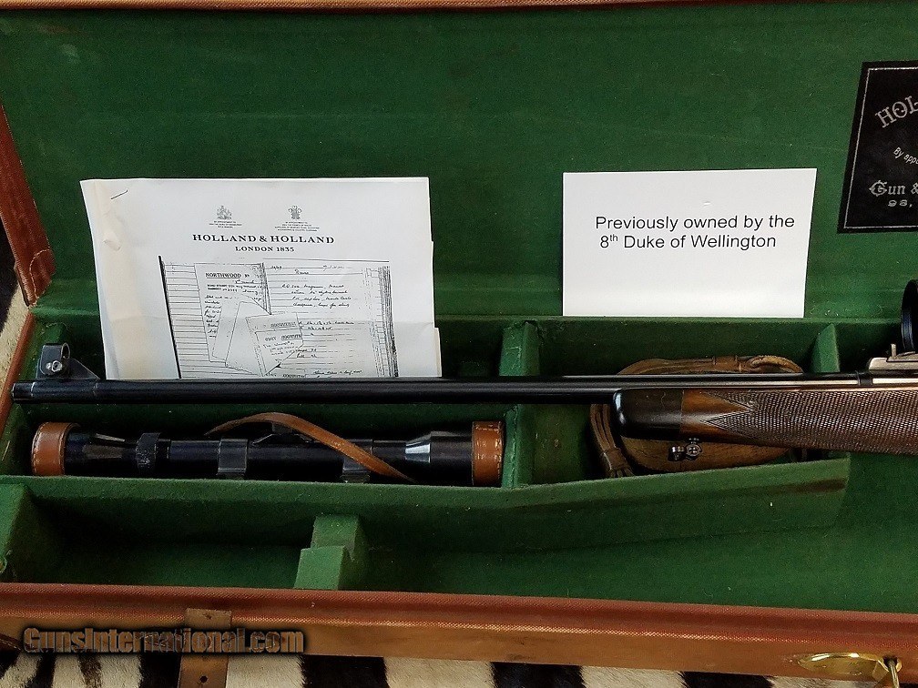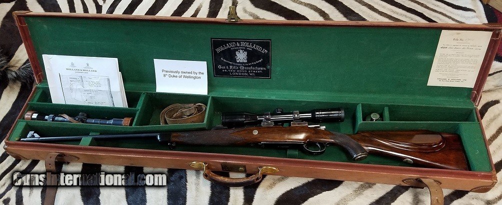 Description: HOLLAND & HOLLAND 300 H&H BEST QUALITY BOLT ACTION RIFLE. MADE IN 1956 FOR THE DUKE OF WELLINGTON. IT WAS CONVERTED IN 1991 FROM .244 TO .300 BY HOLLAND & HOLLAND FOR THE DUKE. IT HAS AN H&H HARDCASE WITH THE CARTUCHE STAMPED WITH A "W" ON TOP. THE STOCK ALSO HAS A CROWN AND "W" INLAYED. THE RIFLE COMES WITH TWO SCOPES WITH H&H MOUNT AND RINGS. ONE SCOPE IS ORIGINAL B NICKEL SUPRA 4X36 WITH RINGS ENGRAVED WITH H&H ON TOP. THE SECOND SCOPE IS A KAHLES 2.2X9 WITH H&H RINGS. THE RIFLE HAS A 24 3/4" BARREL WITH A BLOCK MOUNTED BEAD FORESIGHT AND FOLD OVER HOOD. THE LENGTH OF PULL IS 13 3/4". THIS IS A GREAT OLD RIFLE IN THE ORIGINAL CASE WITH PAPERWORK FROM H&H AND SOME HISTORY ON THE DUKE. SOLD |