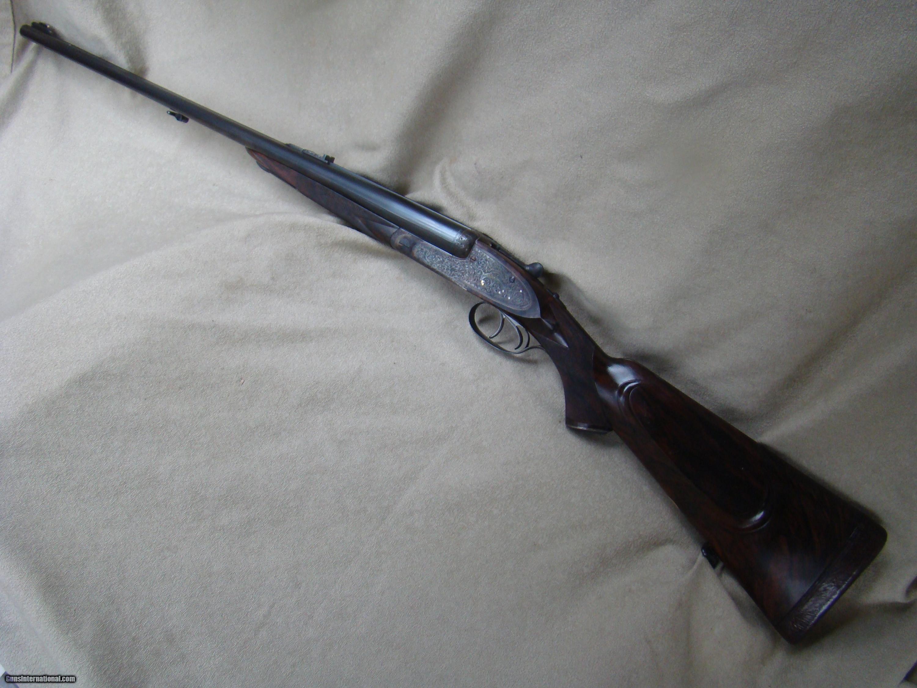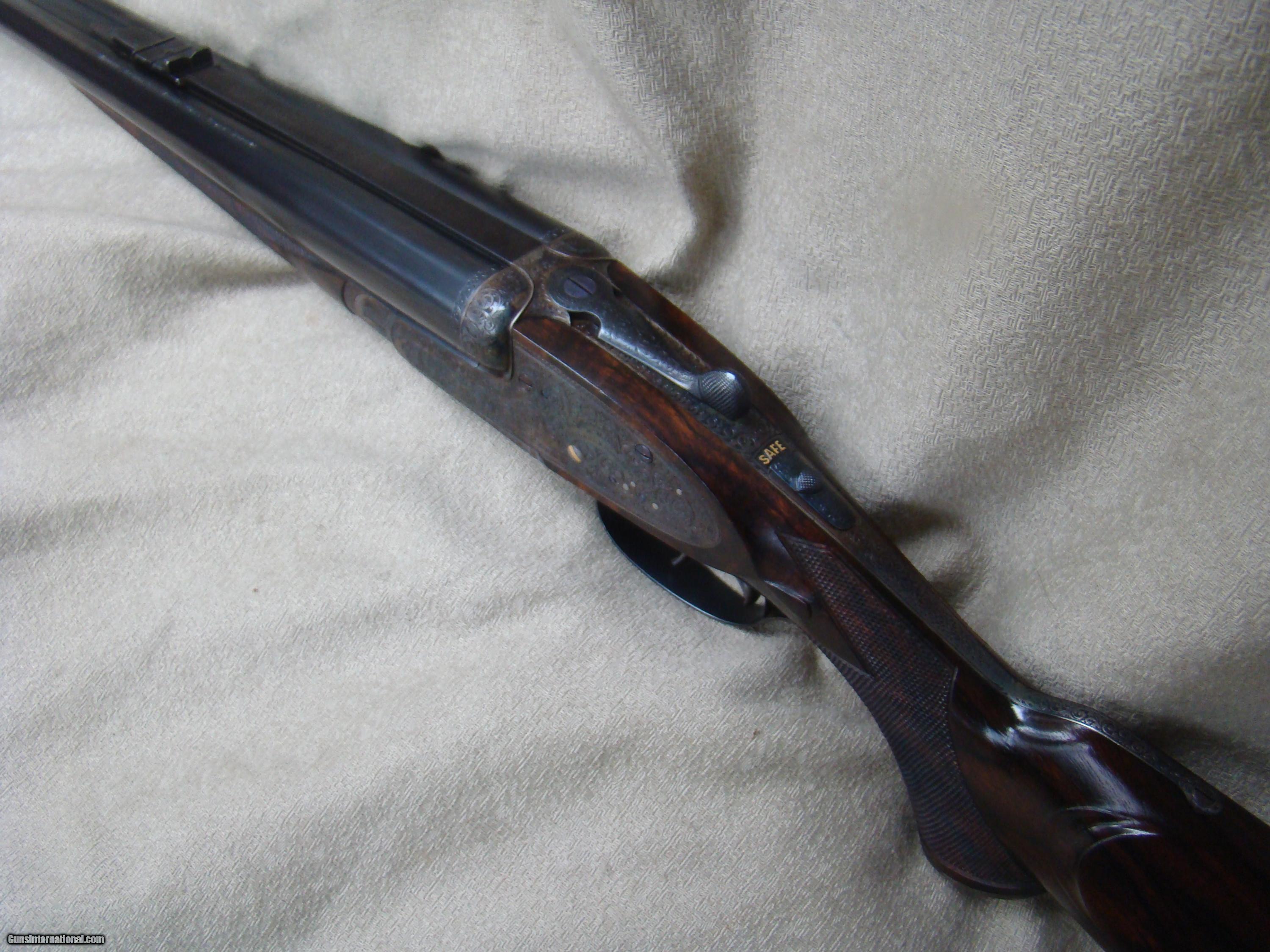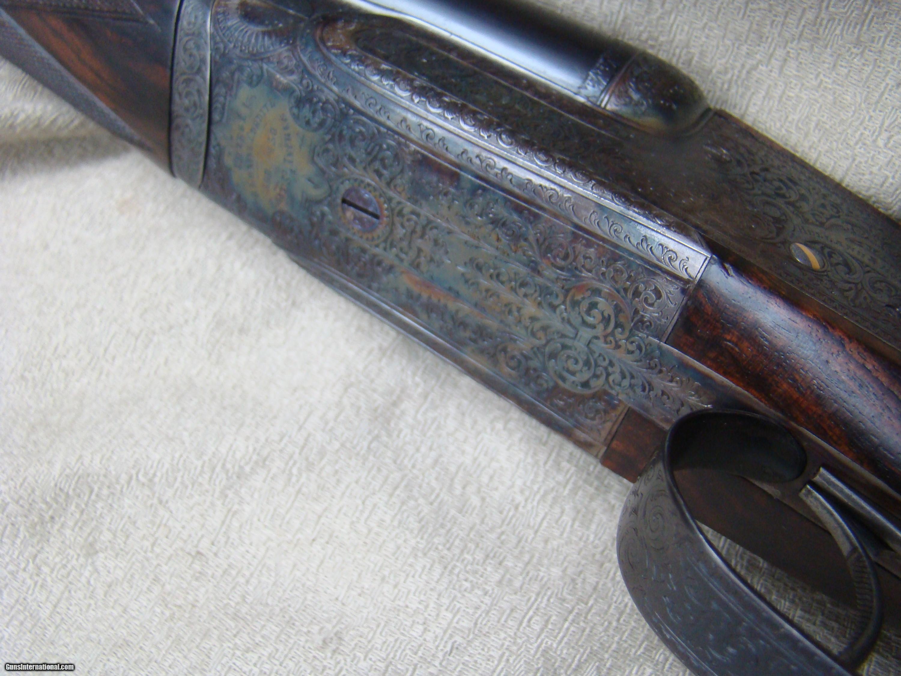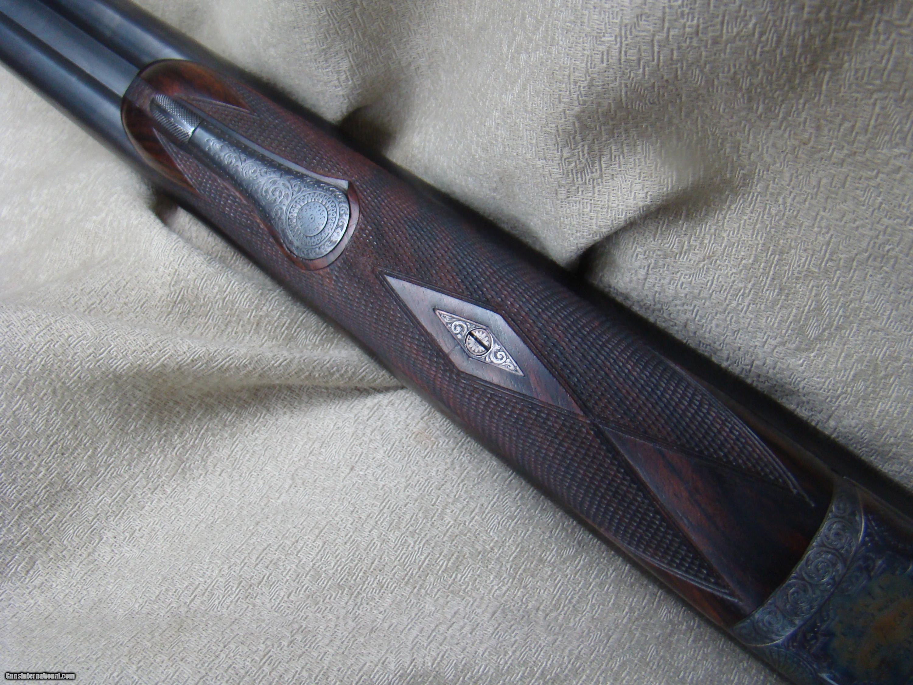 Description: Boss & Co. best quality sidelock ejector. Original 28" Damascus barrels and additional factory steel barrels. The Damascus barrels bear the St. James's Street address and are choked .009/.035 (open modified and full) and maintain a wonderful star pattern Damascus. The additional 28" steel barrels, fitted by Boss circa 1979, bear the Cork Street address and are choked .007/.017 (improved cylinder and modified). 2-3/4" chambers, double triggers, splinter forend. Nicely figured straight hand stock measures 1-1/2" comb, 2-1/4" heel, 14-3/4" LOP to a checkered butt. The action features the finest Boss pattern rose and scroll and retains a wonderful patina of case color hardening. The gun appears to be unused since the return to the factory for additional barrels. Weighing just 6 lbs, 6 oz., a fast-handling British best. Cased in the original oak and leather plus an additional case fitted just for the new barrels. Complete set of spare mainsprings, toplever springs, and striker pins. Best of both worlds - the beauty and character of the vintage Damascus, and the practicality of the modern steel - you choose! SOLD |