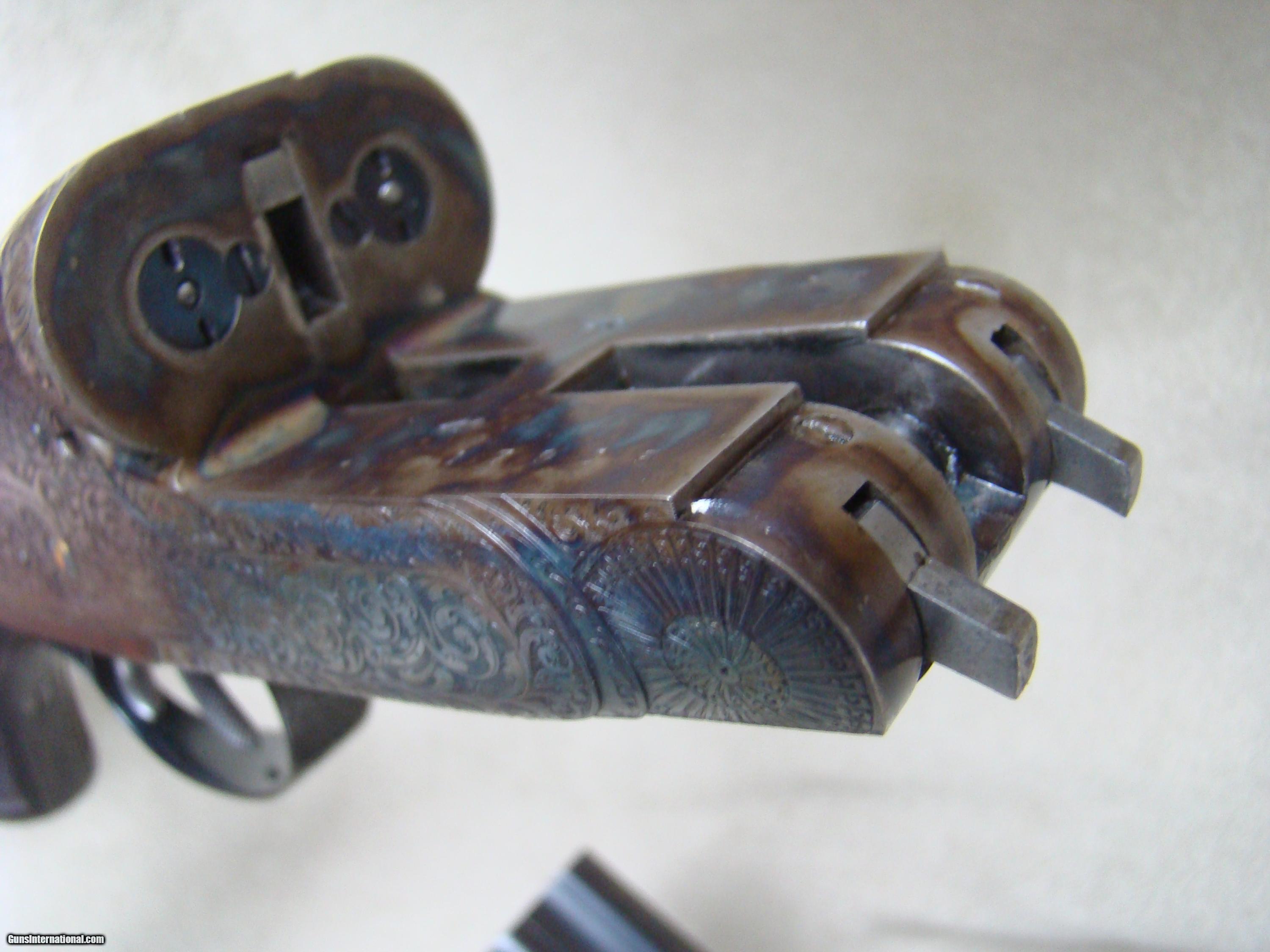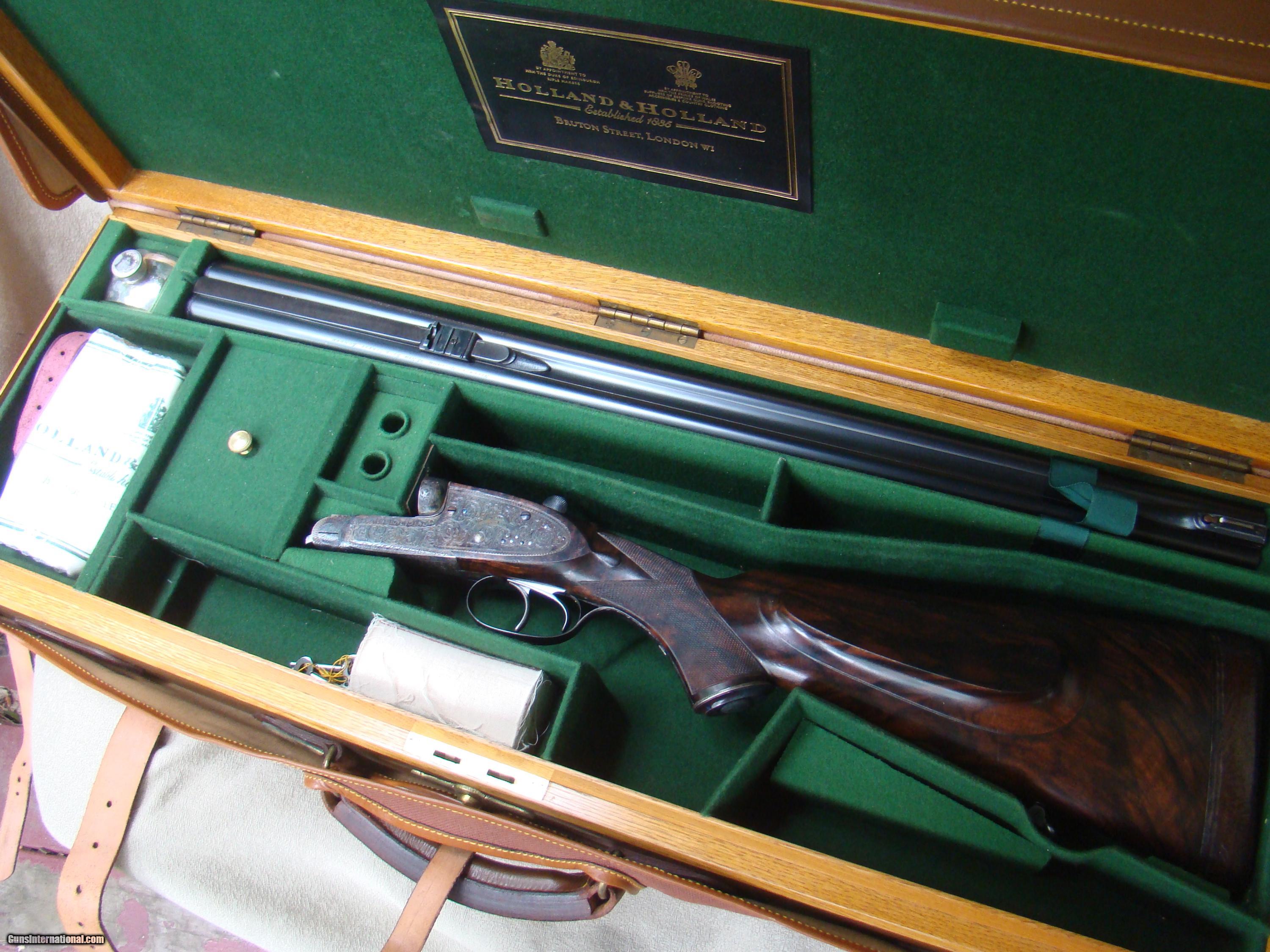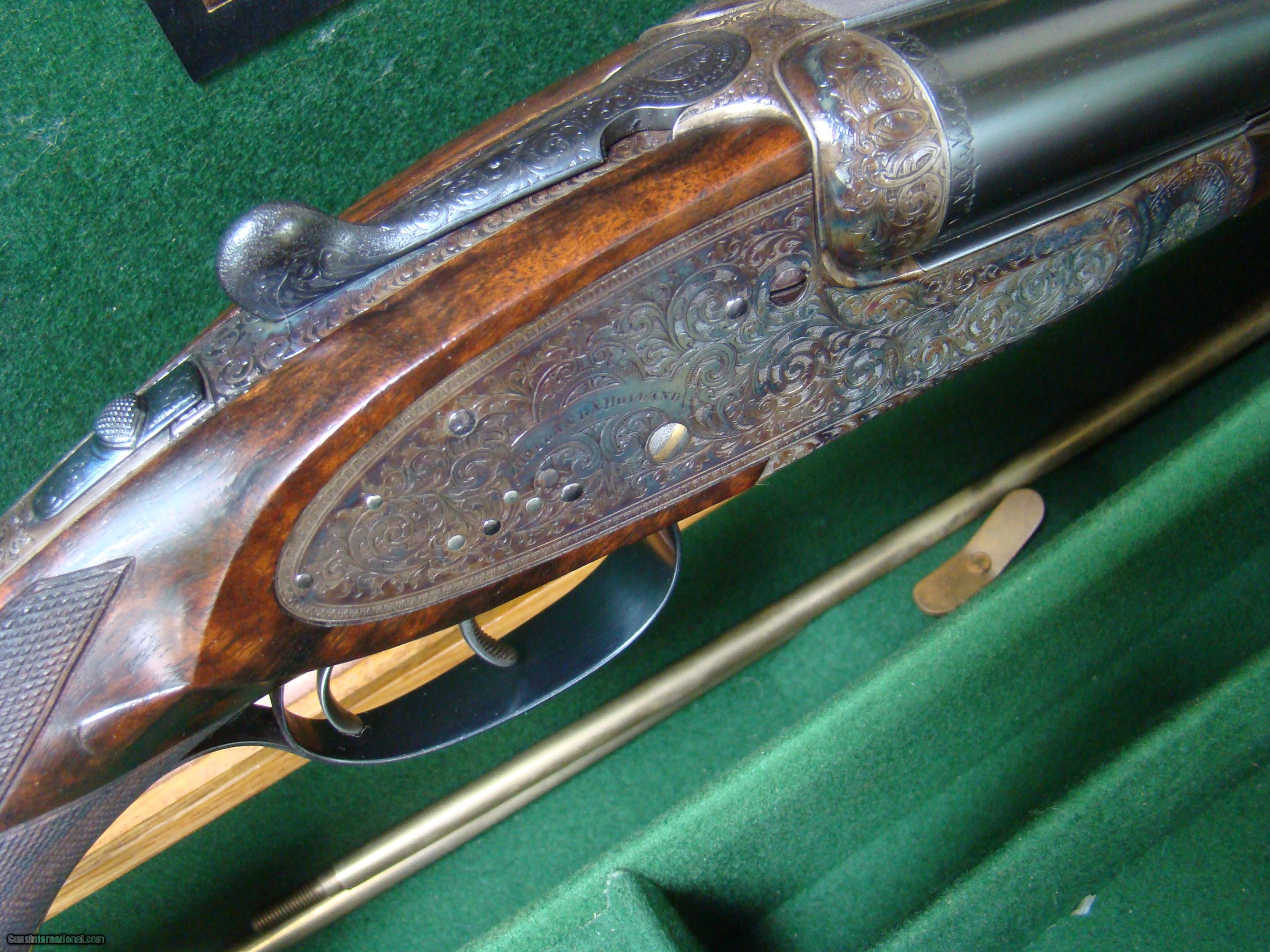Description: Boss & Co. best quality sidelock ejector. Original 28" Damascus barrels and additional factory steel barrels. The Damascus barrels bear the St. James's Street address and are choked .009/.035 (open modified and full) and maintain a wonderful star pattern Damascus. The additional 28" steel barrels, fitted by Boss circa 1979, bear the Cork Street address and are choked .007/.017 (improved cylinder and modified). 2-3/4" chambers, double triggers, splinter forend. Nicely figured straight hand stock measures 1-1/2" comb, 2-1/4" heel, 14-3/4" LOP to a checkered butt. The action features the finest Boss pattern rose and scroll and retains a wonderful patina of case color hardening. The gun appears to be unused since the return to the factory for additional barrels. Weighing just 6 lbs, 6 oz., a fast-handling British best. Cased in the original oak and leather plus an additional case fitted just for the new barrels. Complete set of spare mainsprings, toplever springs, and striker pins. Best of both worlds - the beauty and character of the vintage Damascus, and the practicality of the modern steel - you choose! SOLD |