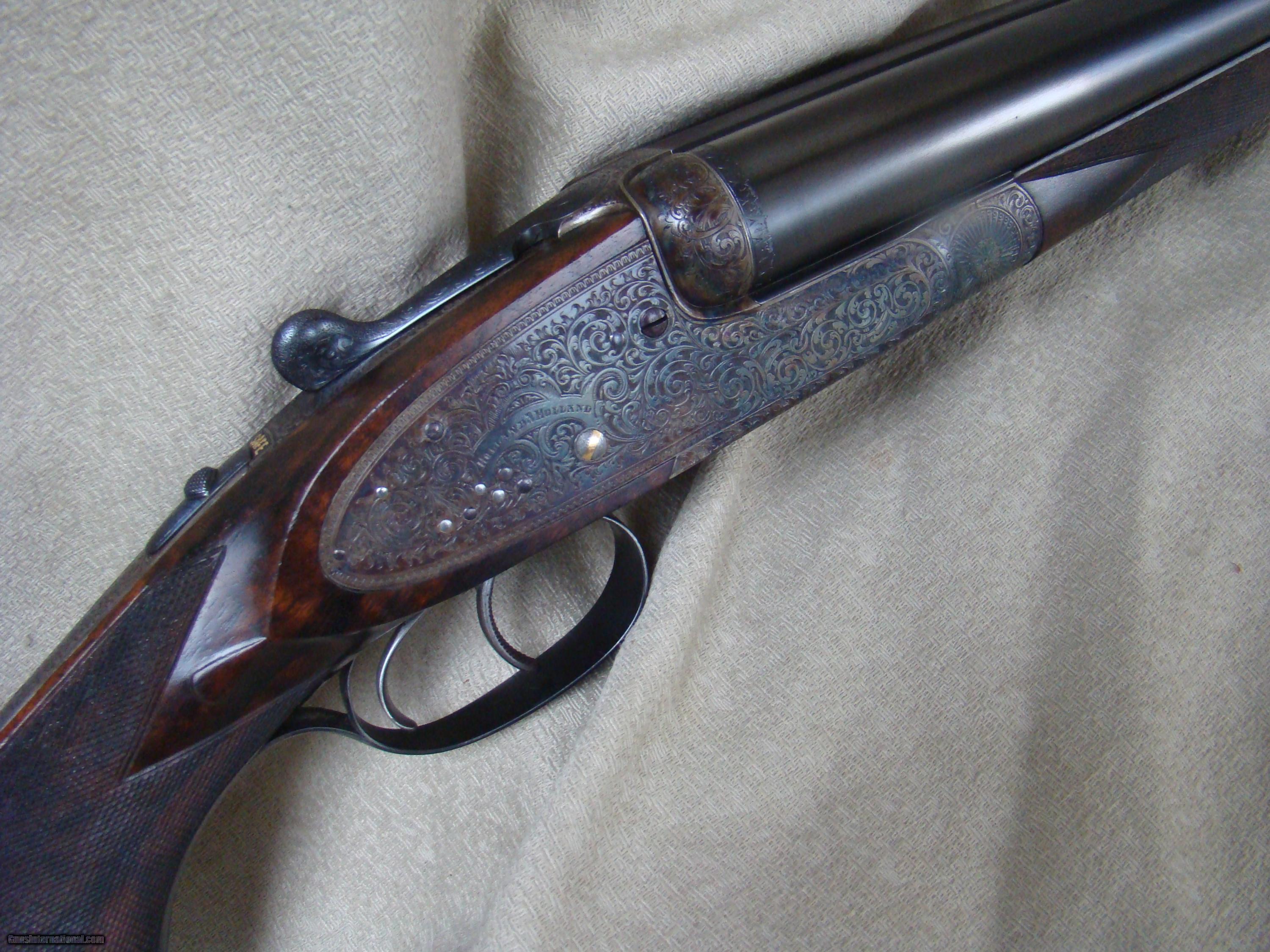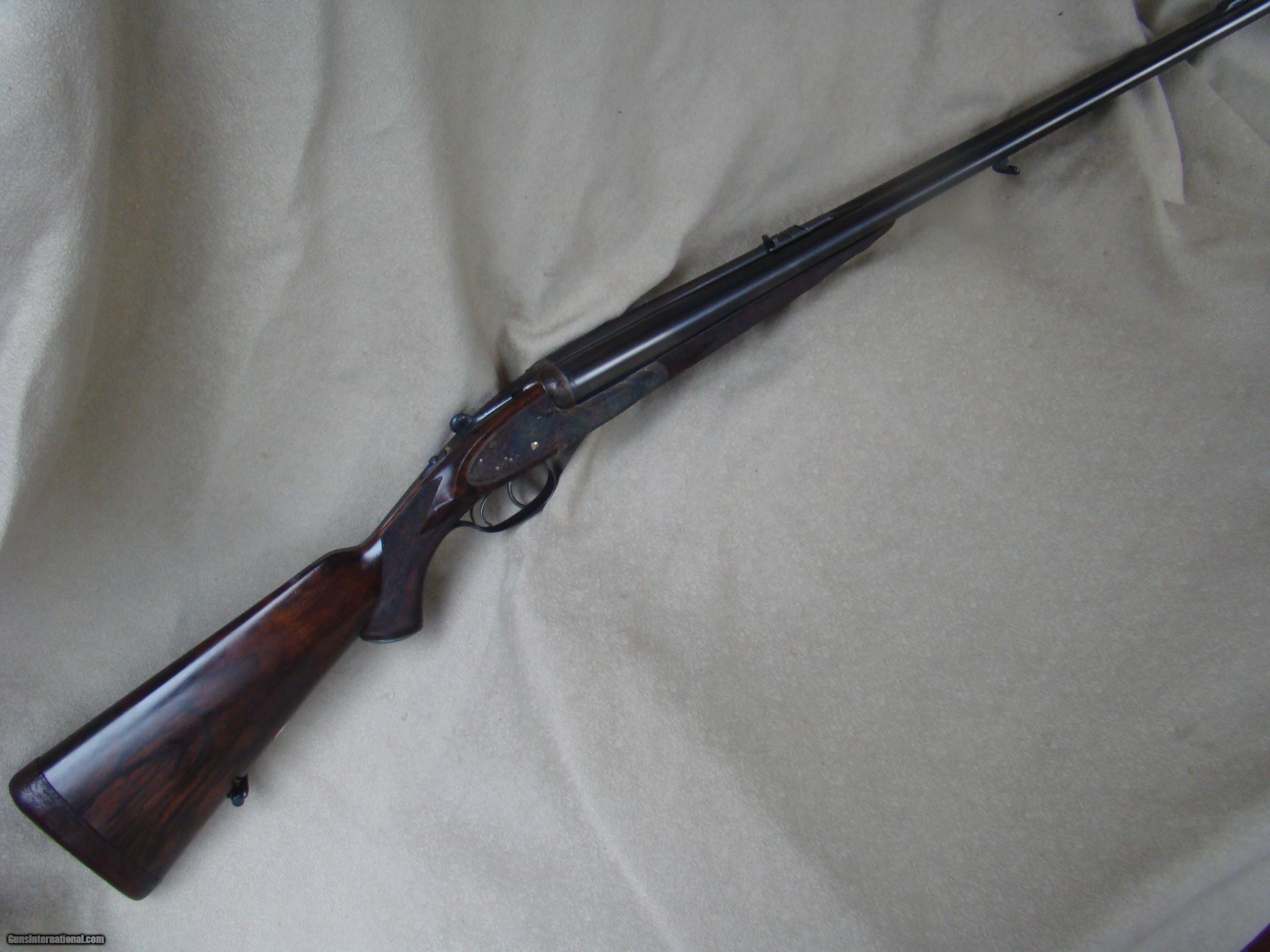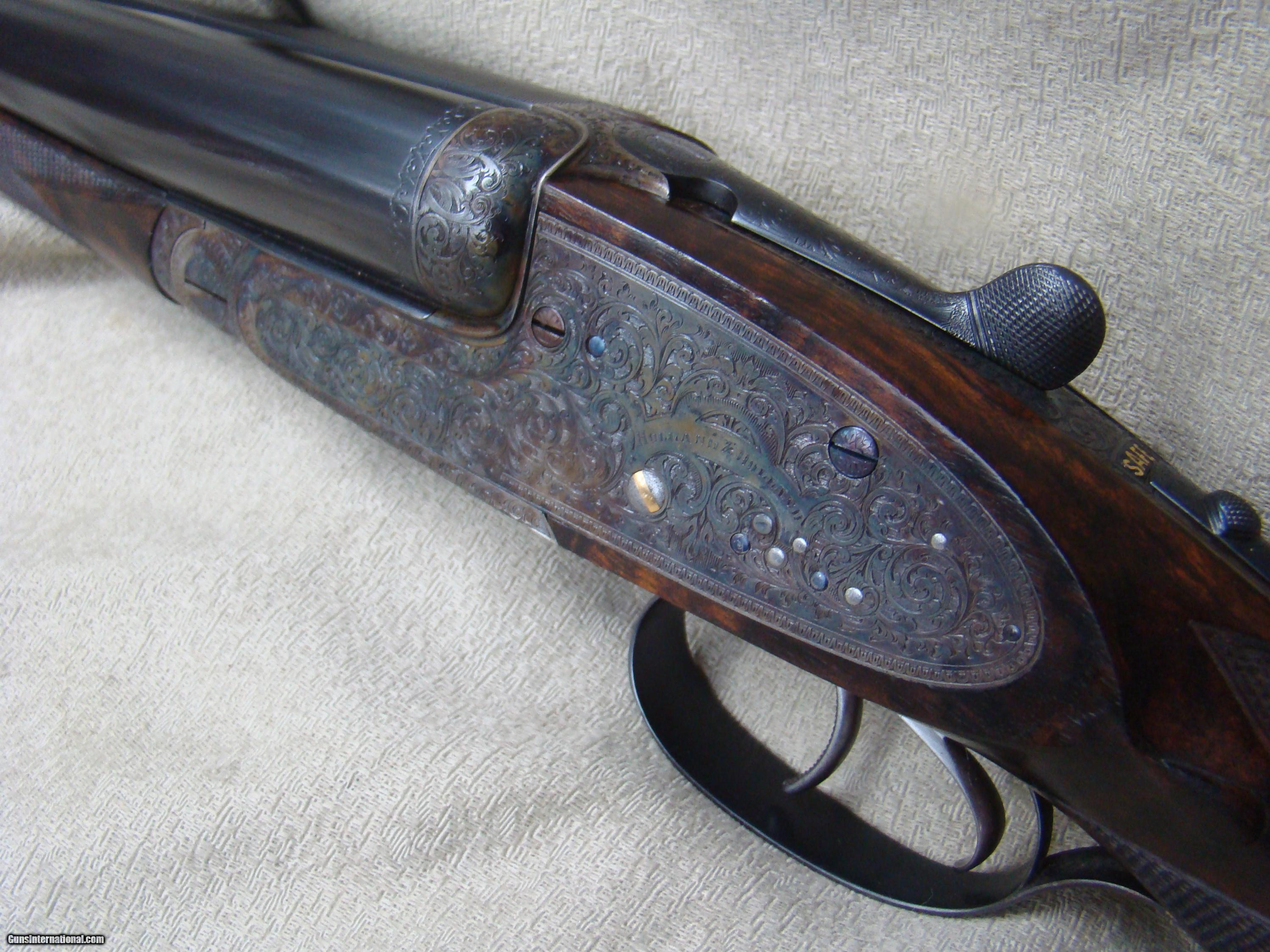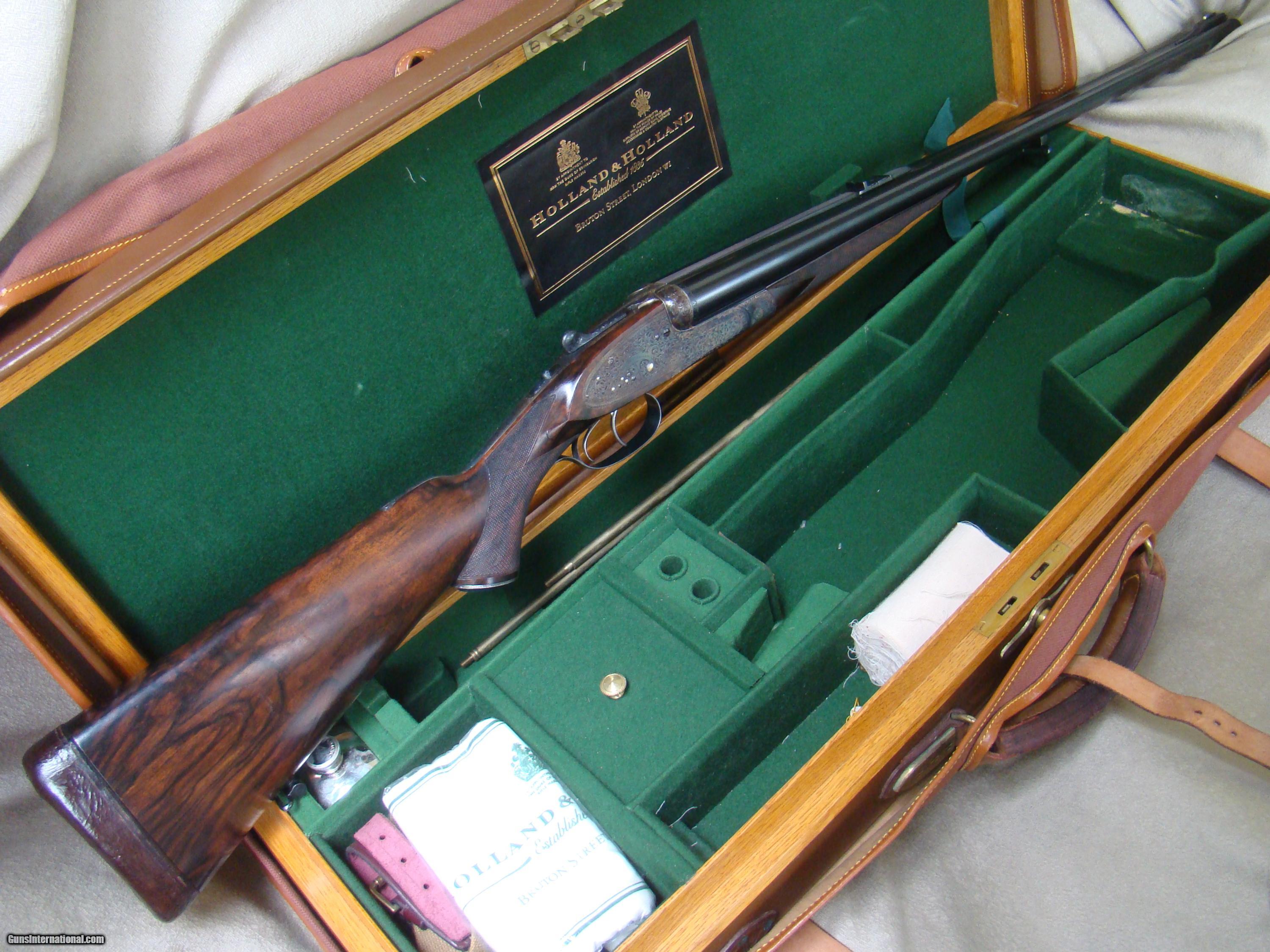 Description: Boss & Co. best quality sidelock ejector. Original 28" Damascus barrels and additional factory steel barrels. The Damascus barrels bear the St. James's Street address and are choked .009/.035 (open modified and full) and maintain a wonderful star pattern Damascus. The additional 28" steel barrels, fitted by Boss circa 1979, bear the Cork Street address and are choked .007/.017 (improved cylinder and modified). 2-3/4" chambers, double triggers, splinter forend. Nicely figured straight hand stock measures 1-1/2" comb, 2-1/4" heel, 14-3/4" LOP to a checkered butt. The action features the finest Boss pattern rose and scroll and retains a wonderful patina of case color hardening. The gun appears to be unused since the return to the factory for additional barrels. Weighing just 6 lbs, 6 oz., a fast-handling British best. Cased in the original oak and leather plus an additional case fitted just for the new barrels. Complete set of spare mainsprings, toplever springs, and striker pins. Best of both worlds - the beauty and character of the vintage Damascus, and the practicality of the modern steel - you choose! SOLD |
