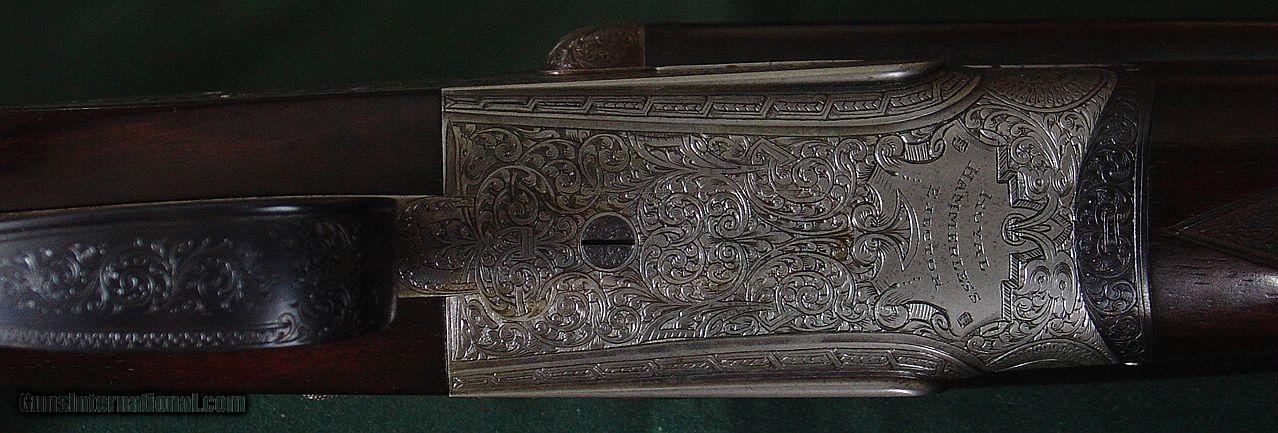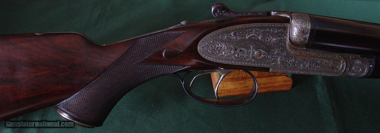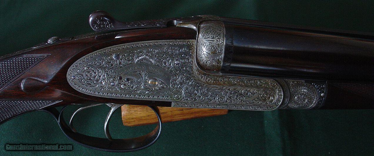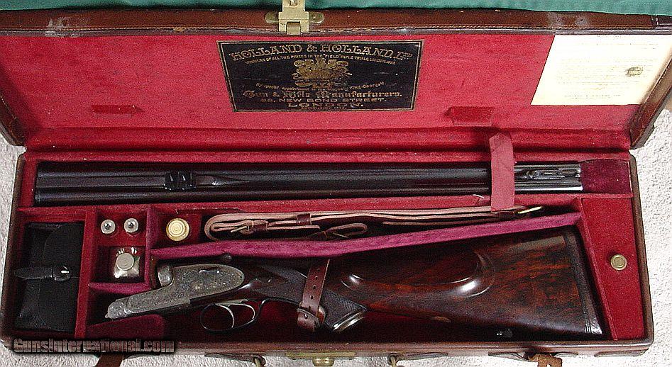 Description: Holland & Holland Circa 1936, 500/465 with Indian Royalty History. The rifle was originally built for the Maharajah Of Madhya Preadesh; also know affectionately as "The Pigmy" because of his small stature. Legend tells us that he shot a large white male tiger, but lost his life to the tiger's mate who attacked from behind at the same time the male died. After his death, the gun makers a Holland's extended the stock from the original length of 13 1/2 to 15 3/8". The rifle comes in its original case with all accessories. Rifle has seen very little use. Bores are in Mint - As New condition. Blue is 99%. Case colors remain at 30-40%, with the balance a mottled grey. Wood is excellent and sound. Checkering sharp. Crisp screw heads. Action is tight on face and flats with no movement throughout the whole drop. Extra for sight in grip cap compartment. Overall a superb example of this gun makers craft from the Golden Age of gun making; for less than half of new cost! MakerHolland & Holland - London Gauge/Caliber500/465 Barrels24" w/1S&2F Leaves Chokesn/a EngravingHolland & Holland Scroll ActionSLE StockCircassian Extra Quality ButtLeather Covered Pad L.O.P.15 3/8" Weight10 lbs. 8.7 oz. Stock Dimensionsn/a SOLD Curio/Relic: Yes |