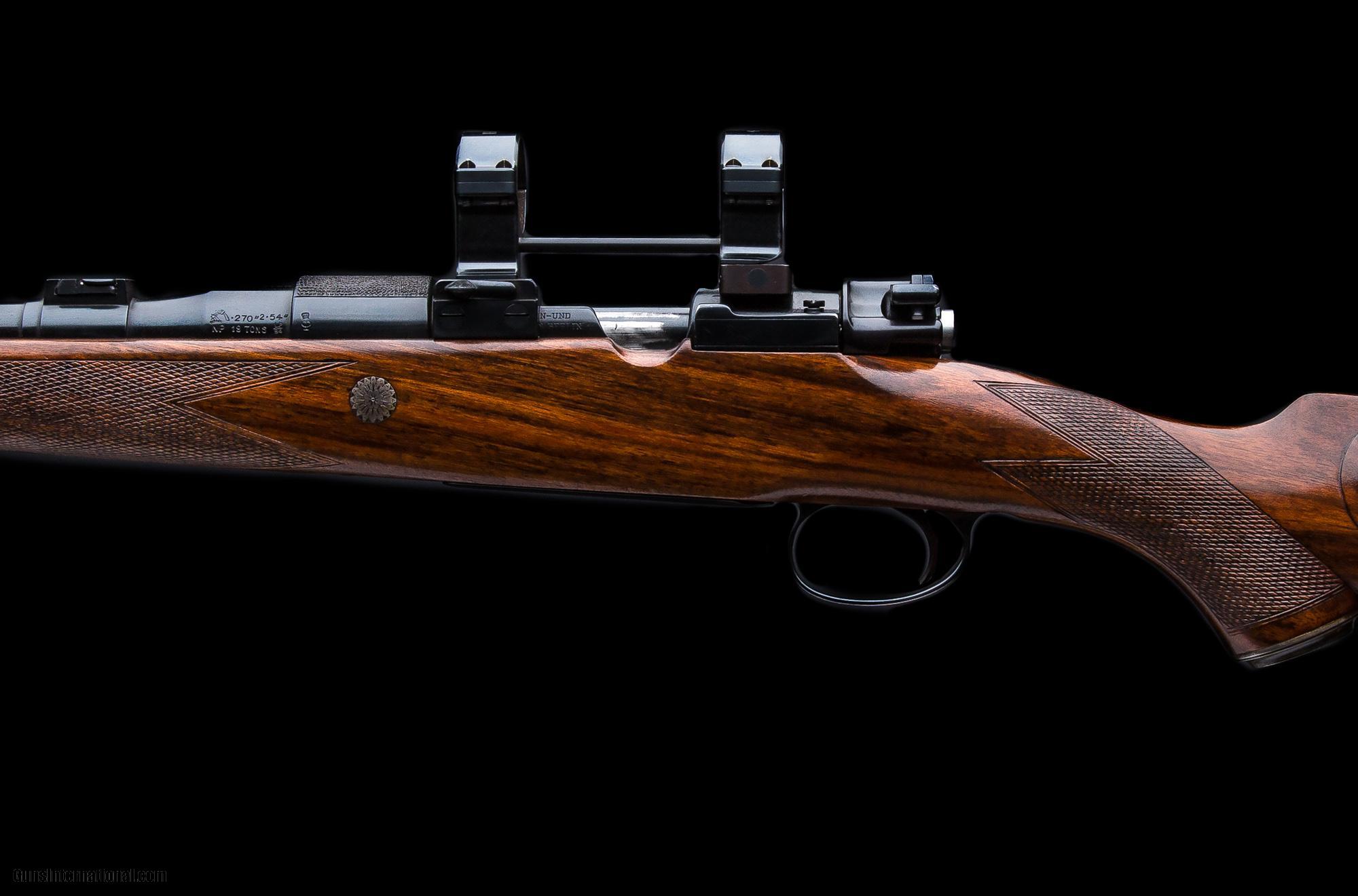 Description: Best Quality bolt action rifle built on a pre-war DWM Mauser action and chambered for .270 Winchester. Nicely figured walnut stock with English style cheekpiece, 14 1/8" LOP over a thin red pad, flat top checkering, a horn forend tip and an engraved gold oval with the initials “CKT”. The trap grip cap is case colored, single steel cross bolt is case colored and engraved. Bottom metal is marked “4 Cartridges” and serial number engraved on the trigger bow. Island rear sight with one folding leaf regulated for 350 yards. Holland’s Patent Folding sight hood and single blade front sight and a barrel mounted sling swivel; barrel length is 25”. Receiver’s front ring is stippled and rifle has factory H&H mounts with 30mm rings serial numbered to the rifle. Barrels shows “Holland & Holland 33 Bruton St. London” address, serial number is 41xx and gun has 1984 London Proofs. The rifle has been shot and shows signs of use, metal is 95% and wood is all original but in about 85% condition. Weighs 8 lbs. even with scope mount very nice gun w/ a perfect bore. I have shot this gun personally and it shoots the same size group at the same point of aim with bullet weights from 130gr to 150gr. SOLD |