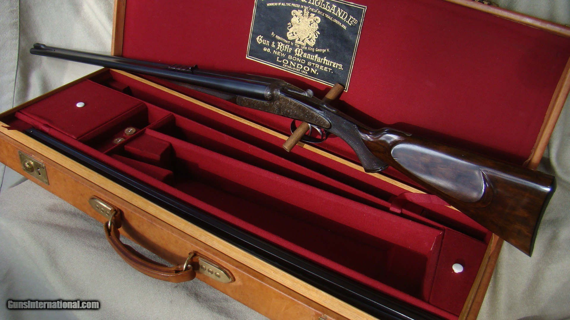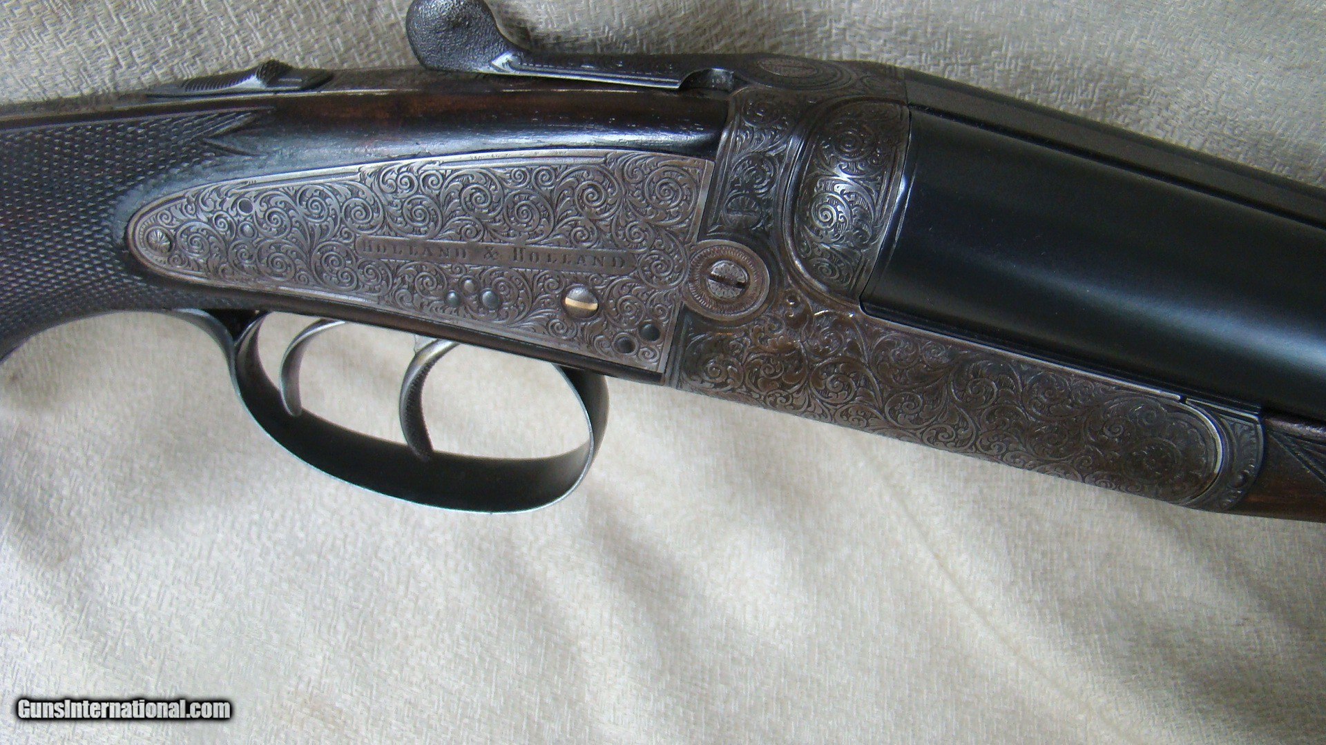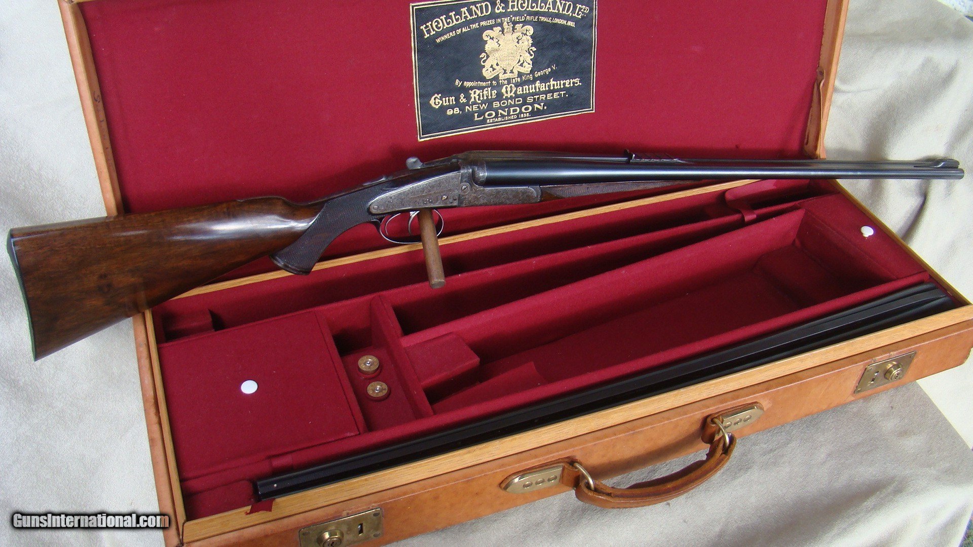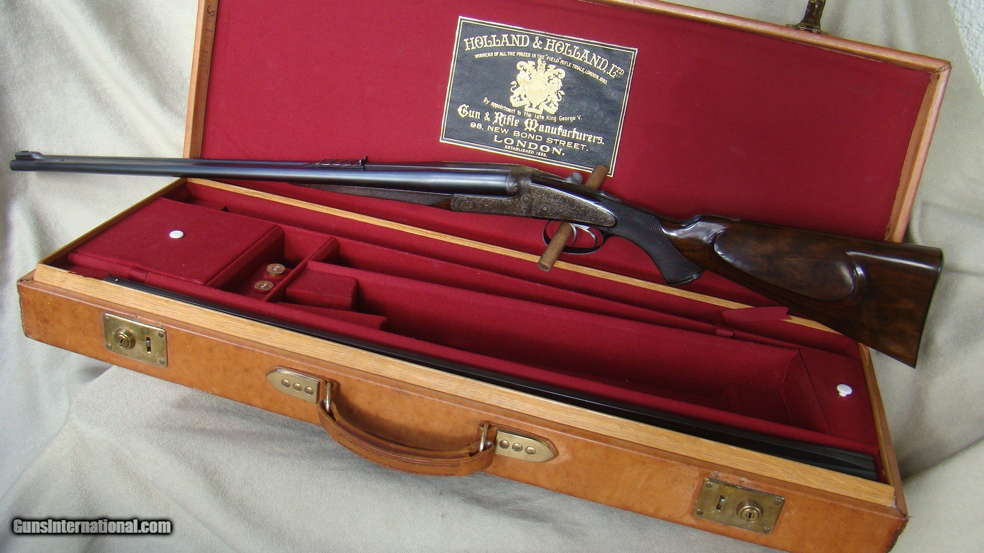 Description: Holland & Holland .375 cal. Express Double Rifle, 26" barrels feature quarter rib with one standing and three folding leaf sights. Double triggers, extractors. Per Holland & Holland records, built in 1905. The backaction sidelock features bushed pins and is fully engraved in an early heavy scroll with "Holland & Holland" in the middle of the locks. The pistol grip stock features a trap grip cap, classic cheekpiece and the over-the-comb topstrap. Measures 14-1/2" to the original buttplate. The frame and lockplates retain a wonderful dark patina mixing with case color. Chambered for the .375 2-1/2" flanged nitro express and prooved for 40 grains cordite and a 320 max bullet. The rifle has an additional set of 20 ga., 28" Austrian barrels which appear to have been fitted to this gun the late 1960s. The ballistics would suggest that this is a superior choice for any North American game with the heavy bullet and excellent sectional density, similar in power to the .358 Winchester. The additional 20 ga. barrels gives one the versatility to do a bit of wingshooting after you have taken your trophy boar! Weighs 9-1/2 lbs. with the rifle barrels and 7lbs with the 20 ga. shotgun barrels. Complete in a heavy leather trunk case. SOLD |