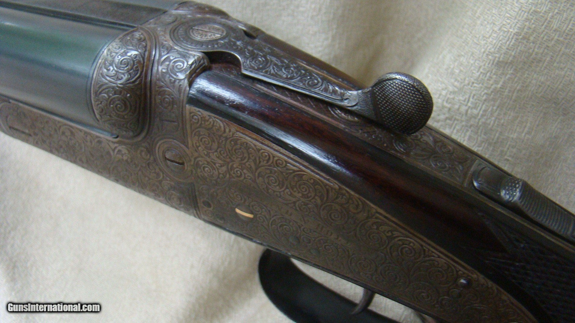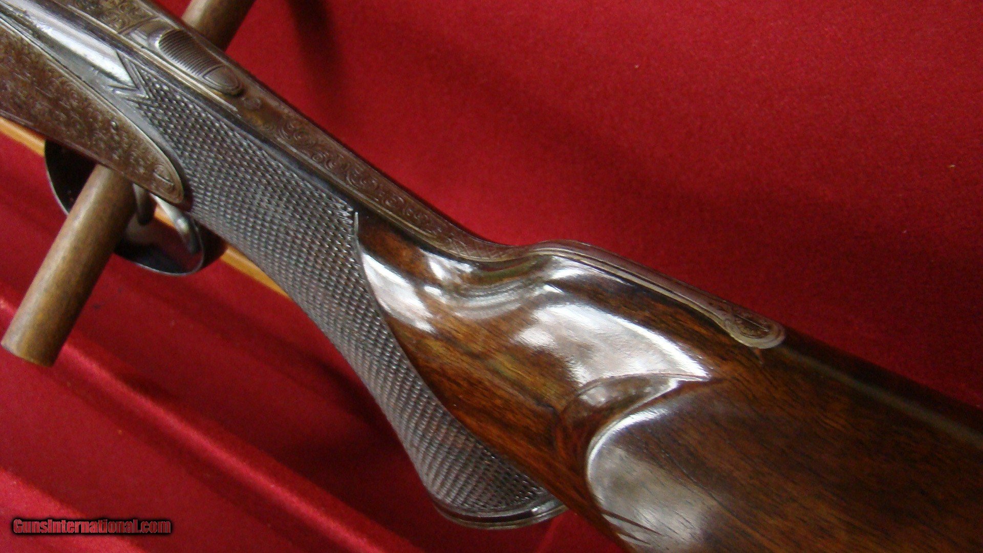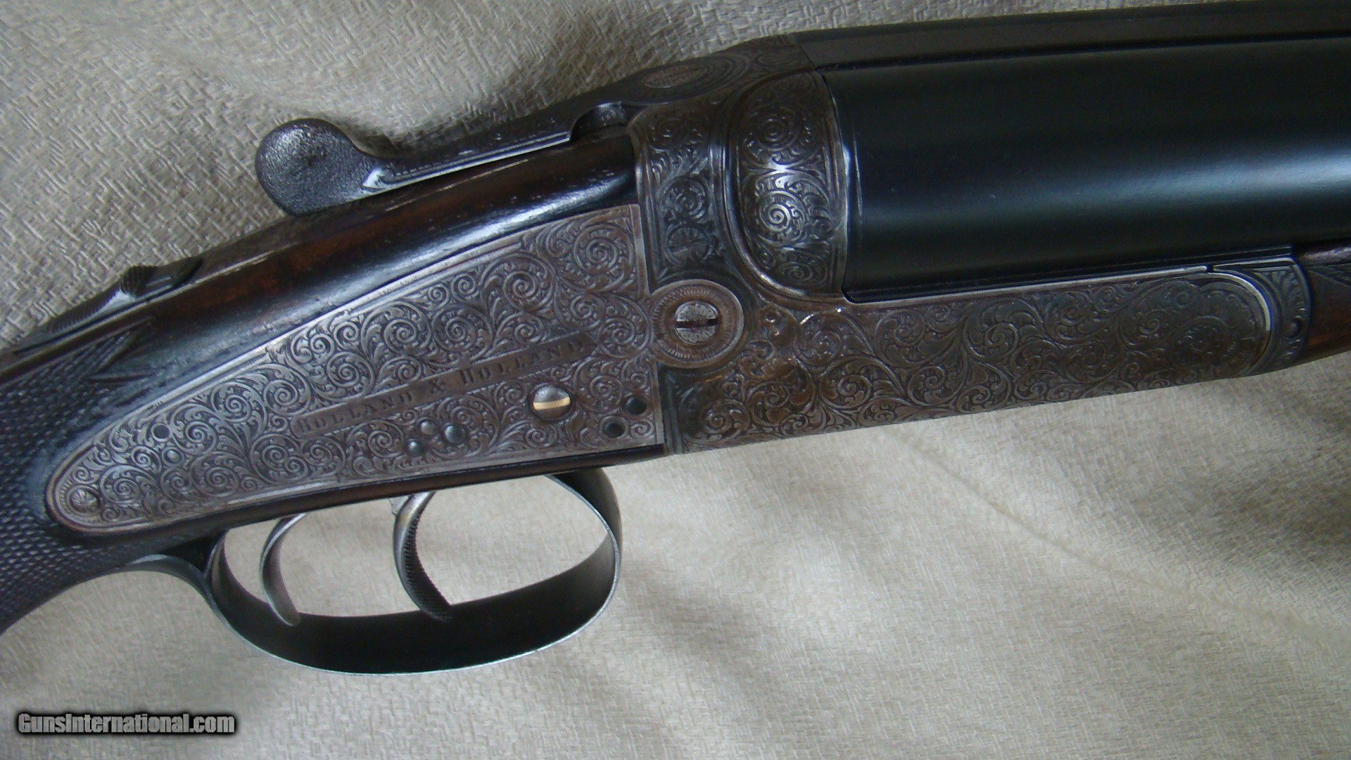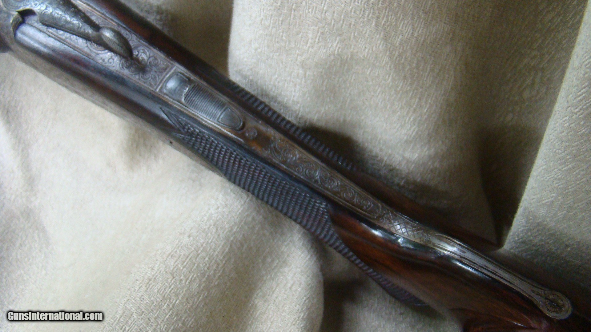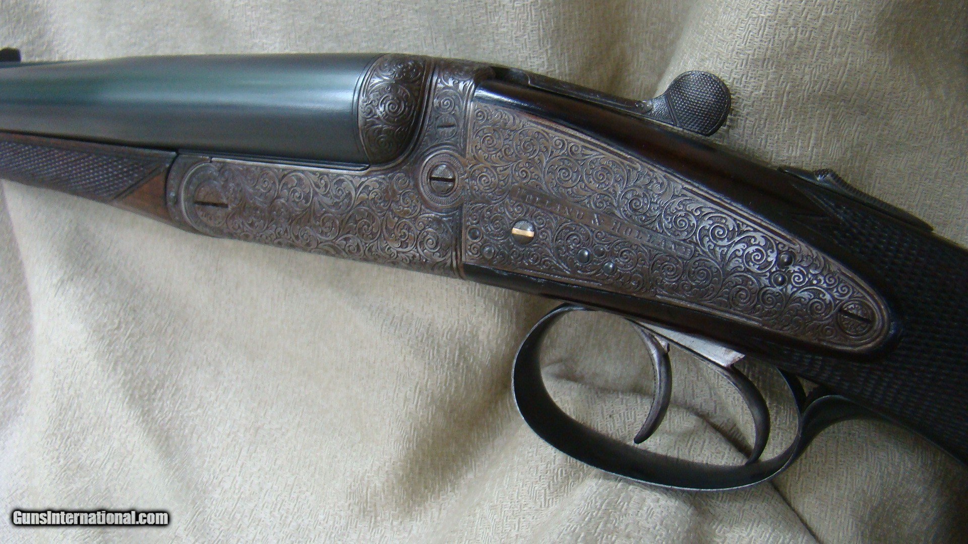 Description: Holland & Holland .375 cal. Express Double Rifle, 26" barrels feature quarter rib with one standing and three folding leaf sights. Double triggers, extractors. Per Holland & Holland records, built in 1905. The backaction sidelock features bushed pins and is fully engraved in an early heavy scroll with "Holland & Holland" in the middle of the locks. The pistol grip stock features a trap grip cap, classic cheekpiece and the over-the-comb topstrap. Measures 14-1/2" to the original buttplate. The frame and lockplates retain a wonderful dark patina mixing with case color. Chambered for the .375 2-1/2" flanged nitro express and prooved for 40 grains cordite and a 320 max bullet. The rifle has an additional set of 20 ga., 28" Austrian barrels which appear to have been fitted to this gun the late 1960s. The ballistics would suggest that this is a superior choice for any North American game with the heavy bullet and excellent sectional density, similar in power to the .358 Winchester. The additional 20 ga. barrels gives one the versatility to do a bit of wingshooting after you have taken your trophy boar! Weighs 9-1/2 lbs. with the rifle barrels and 7lbs with the 20 ga. shotgun barrels. Complete in a heavy leather trunk case. SOLD |