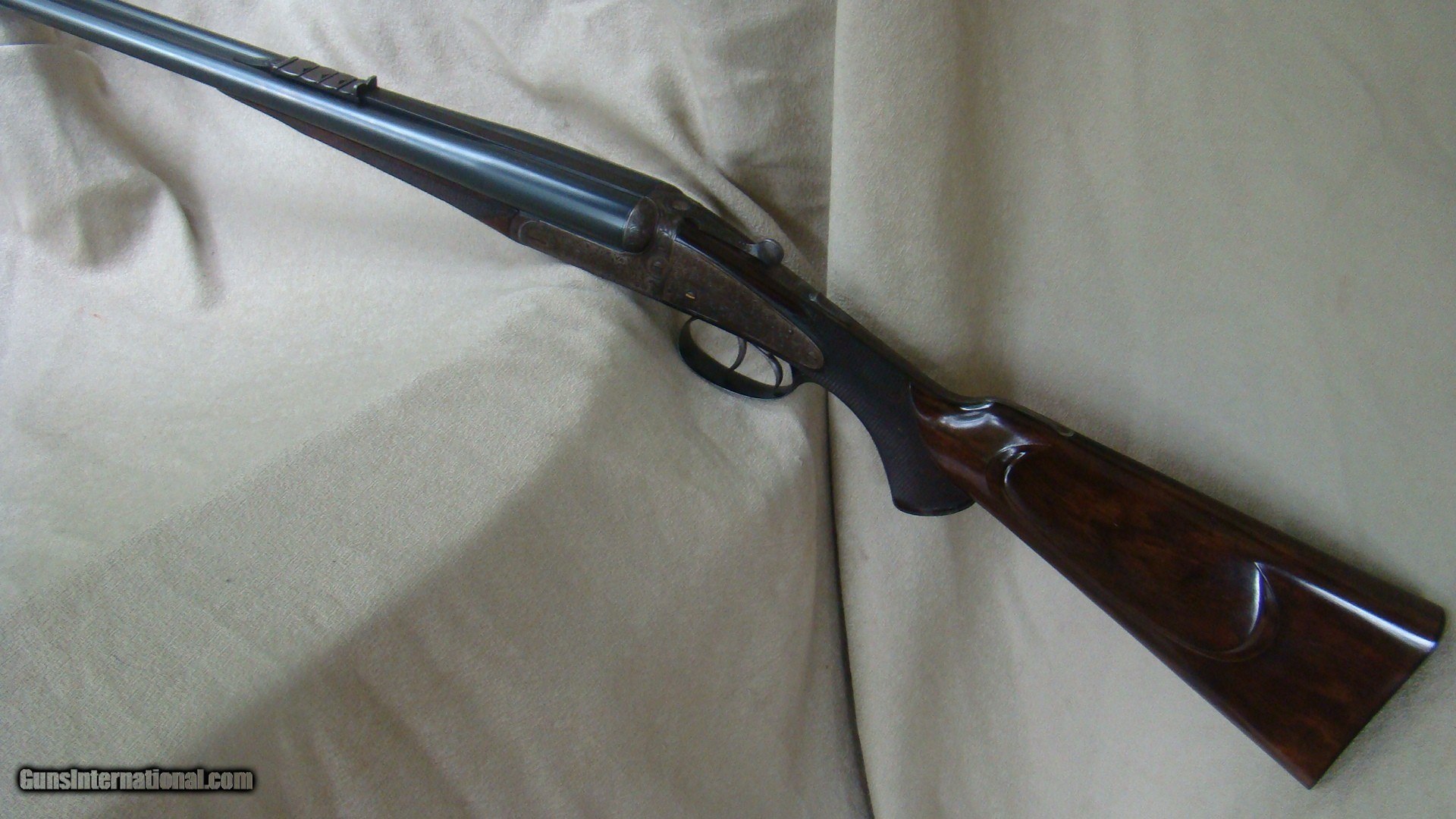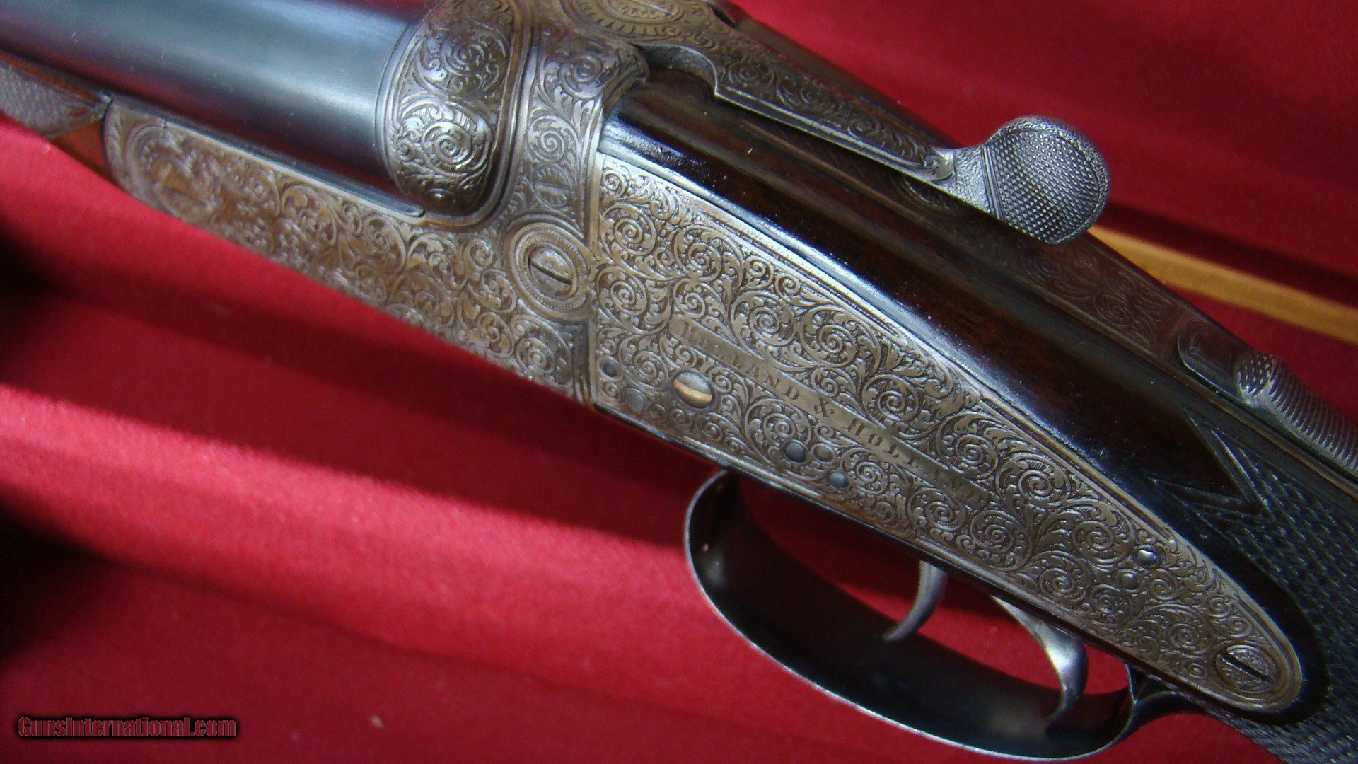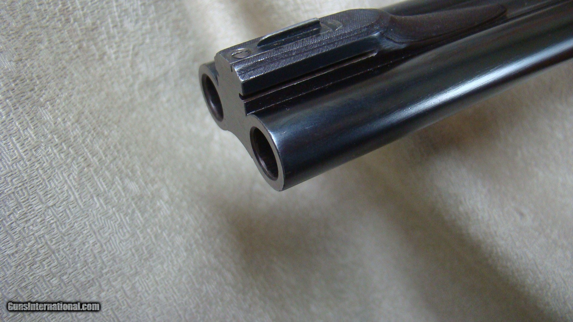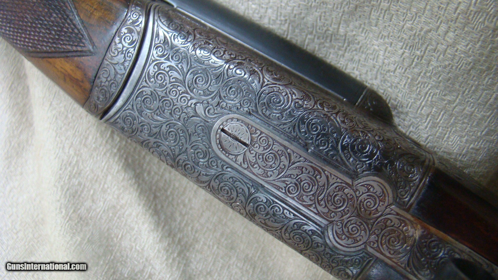 Description: Holland & Holland .375 cal. Express Double Rifle, 26" barrels feature quarter rib with one standing and three folding leaf sights. Double triggers, extractors. Per Holland & Holland records, built in 1905. The backaction sidelock features bushed pins and is fully engraved in an early heavy scroll with "Holland & Holland" in the middle of the locks. The pistol grip stock features a trap grip cap, classic cheekpiece and the over-the-comb topstrap. Measures 14-1/2" to the original buttplate. The frame and lockplates retain a wonderful dark patina mixing with case color. Chambered for the .375 2-1/2" flanged nitro express and prooved for 40 grains cordite and a 320 max bullet. The rifle has an additional set of 20 ga., 28" Austrian barrels which appear to have been fitted to this gun the late 1960s. The ballistics would suggest that this is a superior choice for any North American game with the heavy bullet and excellent sectional density, similar in power to the .358 Winchester. The additional 20 ga. barrels gives one the versatility to do a bit of wingshooting after you have taken your trophy boar! Weighs 9-1/2 lbs. with the rifle barrels and 7lbs with the 20 ga. shotgun barrels. Complete in a heavy leather trunk case. SOLD |