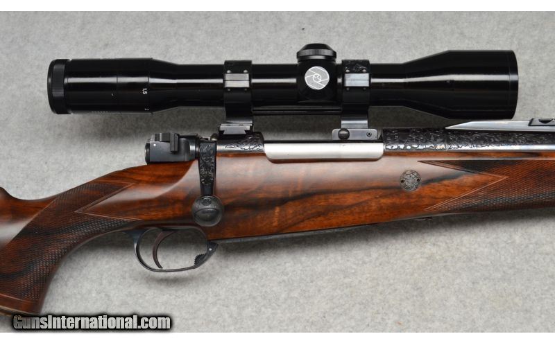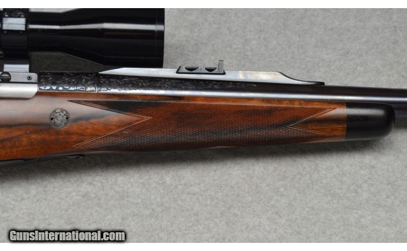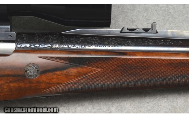 Description: Holland & Holland Deluxe Take-Down Magazine rifle chambered in .375 H&H. Custom oredered direct from Holland & Holland with special features and all paperwork included. This rifle features a blued finish with scrollwork and floral engraving to the: muzzle, barrel sling eye, rings, breech, receiver, bolt, trigger guard, and floorplate. These along with the Cape buffalo engraving on the floorplate were all executed and signed by G. Casbards. The barrel and receiver sit within highly figured walnut flourished with checkering for grip, an ebony tipped forend, a gold plated escutcheon initialed J.P.R., and a layered leather recoil pad. This rifle has original documentation for ownership and original purchase. SOLD Manufacturer: 1983 Caliber Info: .375 H&H magnum Metal Condition: excellent Wood Condition: excellent Bore Condition: shiny Barrels: 25.75 Stock: high grade checkered walnut Stock Dimensions: LOP 13.875 Fore End: high grade checkered walnut Butt Pad: leather pad Weight: 10lbs 4ozs Sights: Zeiss Diavari-ZA Item Location: Scarborough, ME |
