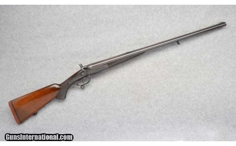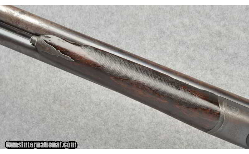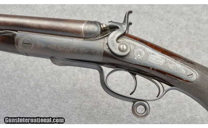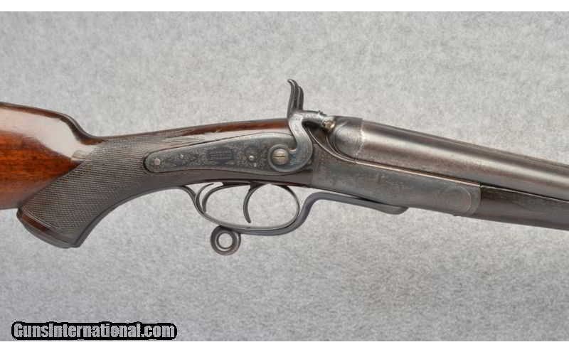 Description: Holland & Holland Rebounding Hammer Double Rifle in 500 BPE, Serial No. 11383, c.1884. 26 Inch barrels engraved “Holland & Holland. 98 New Bond Street, London.” on right, and “Winners of All the “Field” Rifle Trials. London.” Underlever locking action, back action lock plates and extend top tang are engraved with fine English scroll. Left side of action engraved “Charge 5 drams. Case 3-1/4”Inches. Action appears fully functional with solid lock-up...Antique. SOLD Caliber Info: 500 BPE 3 1/4 Inch Metal Condition: Genereous bluing on the locks and receiver, Significant wear on the barrels with areas of pitting forward the forearm Wood Condition: Scattered dings and scratches, significant wear on the forearm. Bore Condition: Sharp Rifling, Slight Roughness Barrels: 26 Inch Triggers: Double Trigger Stock: Capped Pistol Grip with Shawdowline Cheek , Stock Dimensions: 14 5/8" LOP Fore End: Splinter Butt Pad: Rubber Pad Weight: 9 Lbs 8 Ozs Sights: One standing, two leaf rear sight, Dovetailed long bead with folding Twilight sight Item Location: Buda, TX |