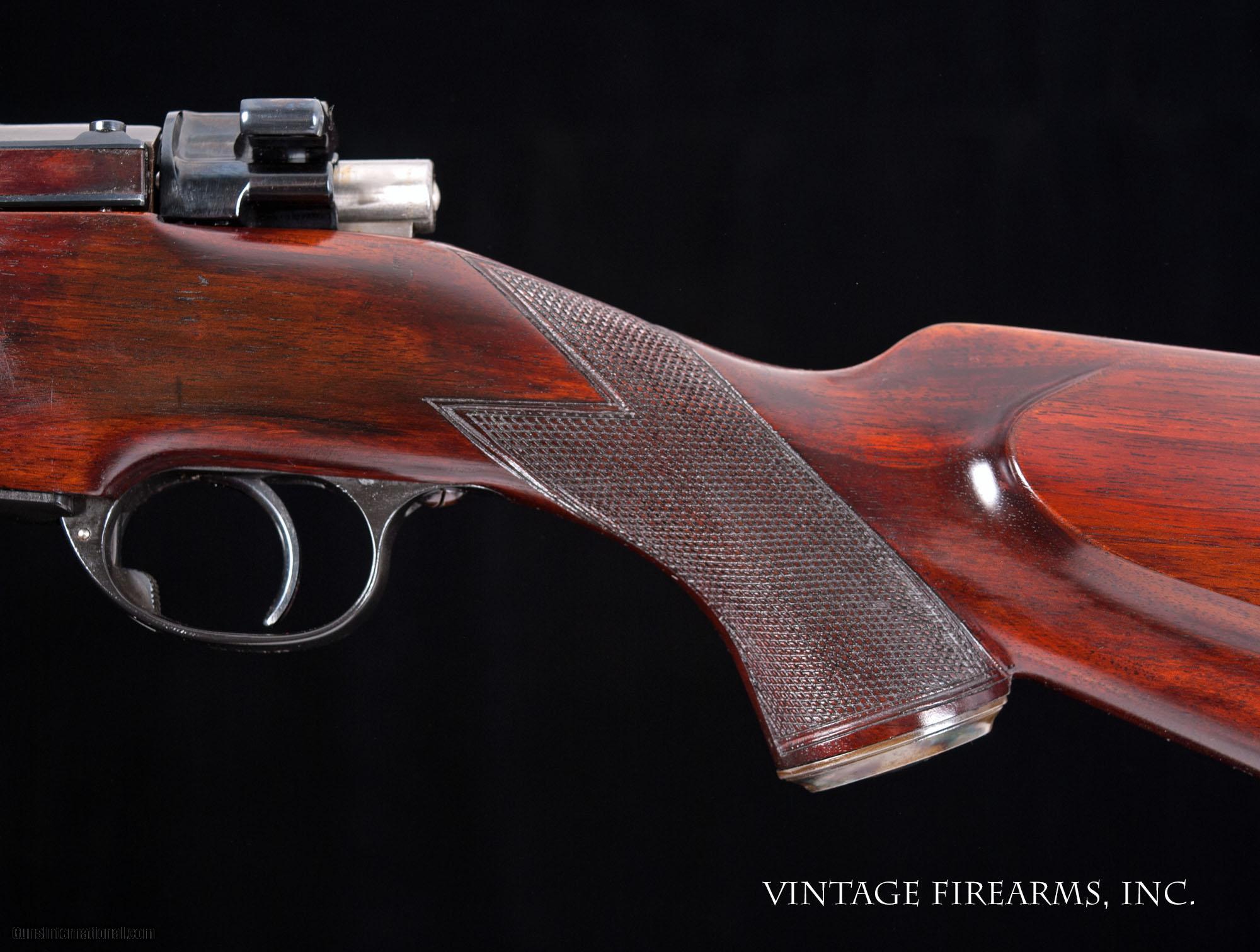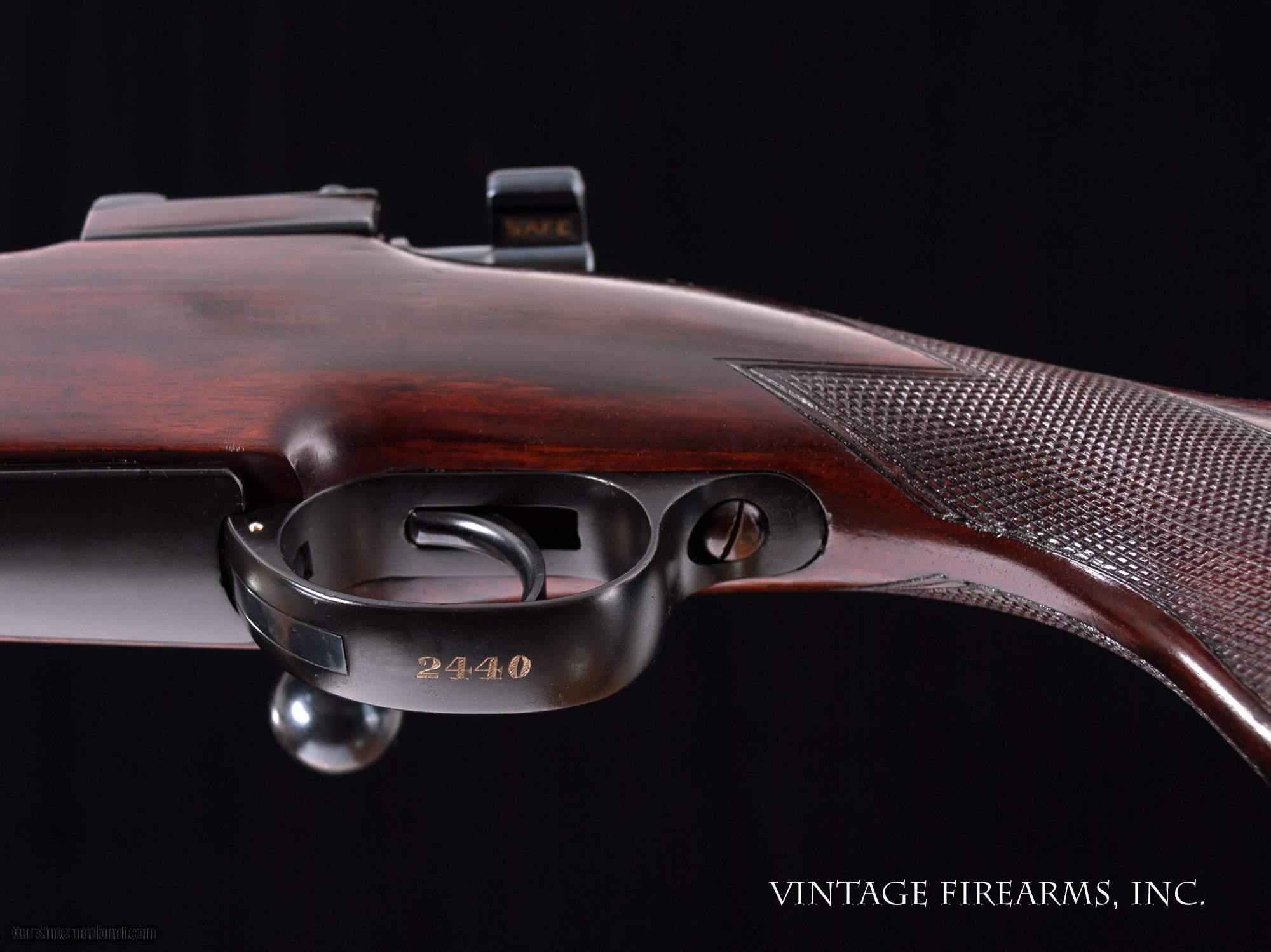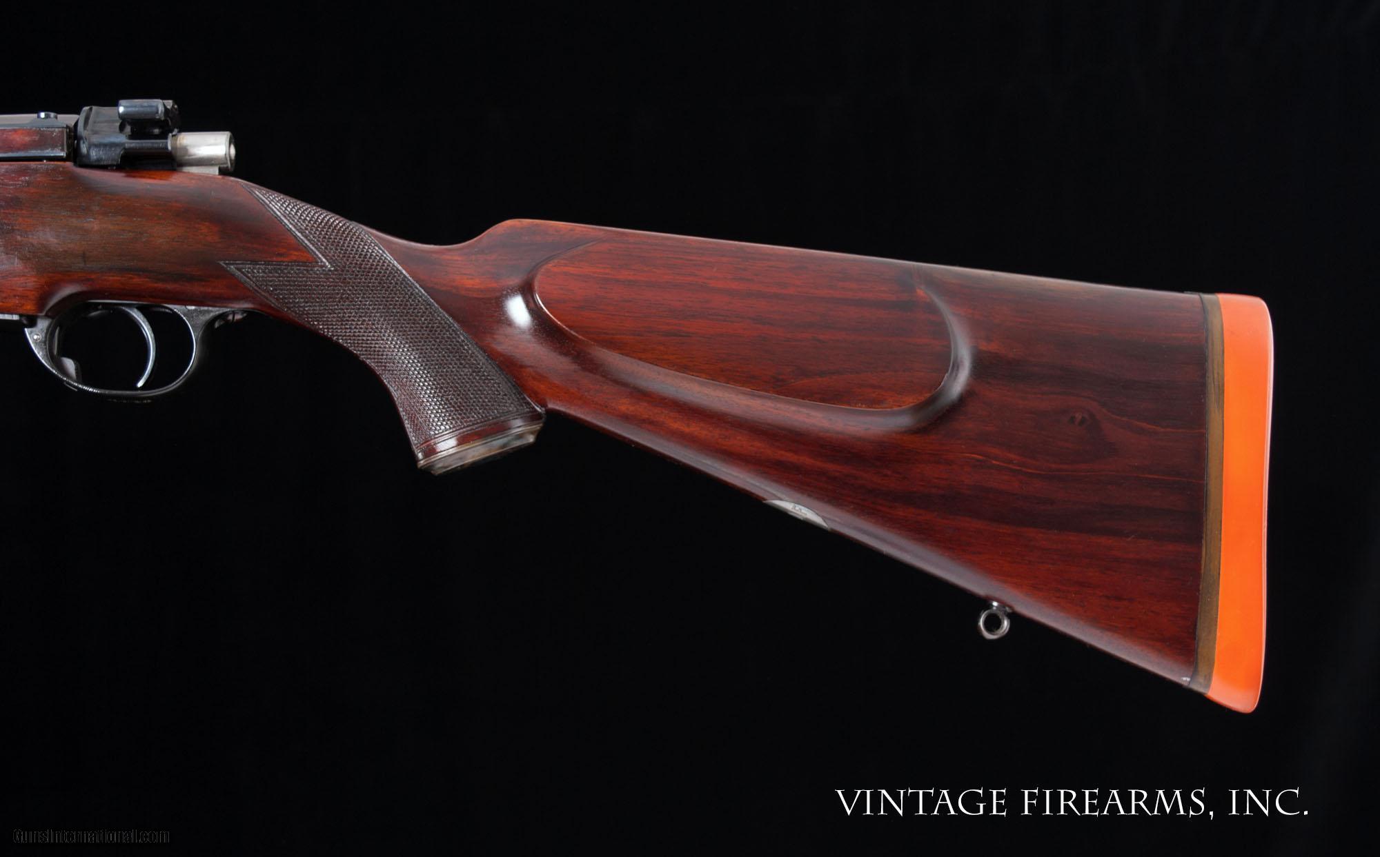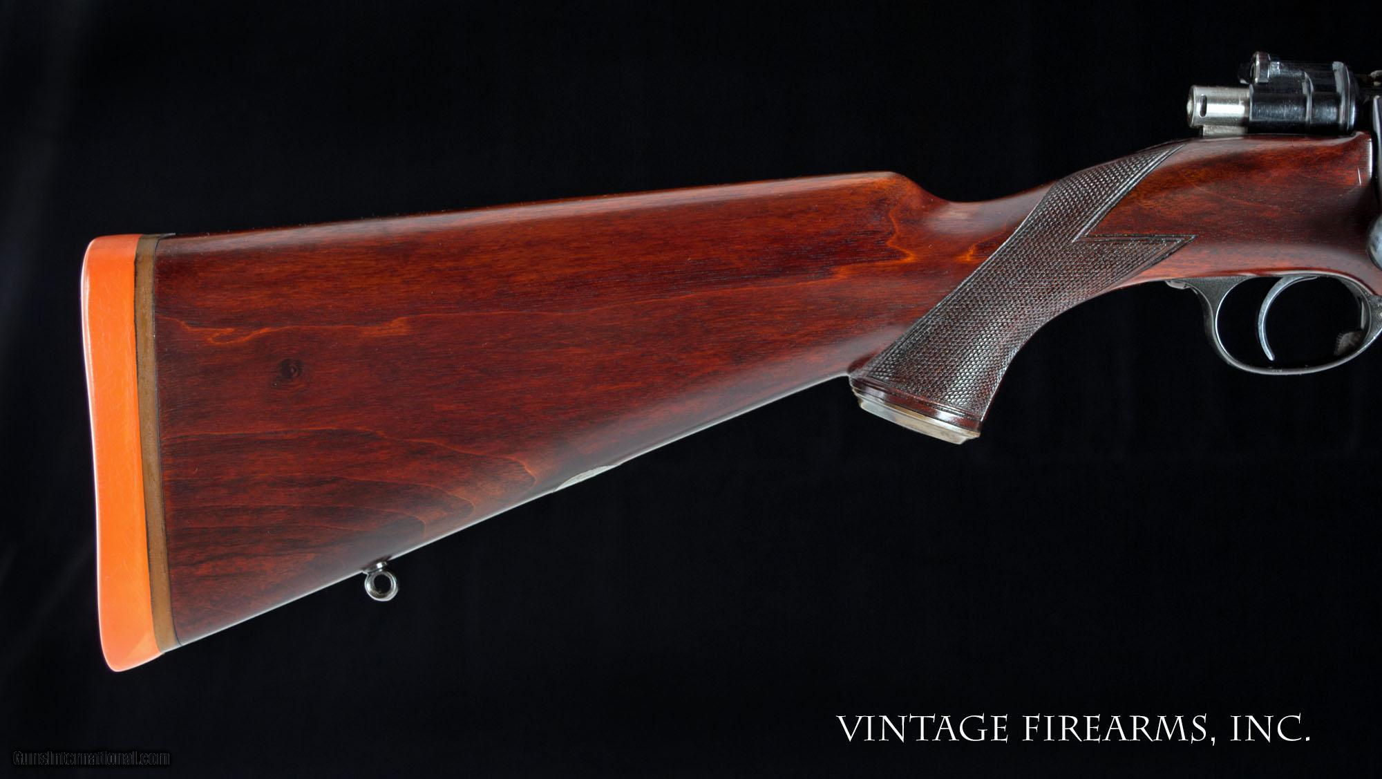 Description: Holland & Holland Magazine Rifle .375 Magnum TAKEDOWN, DOCUMENTED, MAUSER ACTION, 99% General Specs: Holland & Holland, Year 1955, .375 Rimless Magnum, 8lbs 2oz, Bolt Rifle Serial Number: 2440 What a privilege to be able to bring to market a near new Holland & Holland Magazine Sporting Rifle built in 1955 on a Mauser action complete with full factory documentation, original factory leather case, accessories, and in near new condition. This fine rifle, sn2440, chambered for the world renowned .375 Holland & Holland Magnum Rimless cartridge, is the epitome of class and prestige in the world of dangerous game and hunting the dark continent. Equally at home in pursuit of North America’s largest game animals, including the great bears, moose, and elk, this rifle is one of a very small number built as a “take-down” style rifle so that it may travel in the beautiful leather case that H & H made specifically for this gun. This is a highly desirable rifle and in beautiful, factory original condition with only the slightest amount of wear on the gun, including the expanded magazine 4 cartridge capacity floor plate. The gun shows little to no use, and is essentially as new in all ways. The factory pad is rock hard and if you would like we will install a genuine Silvers pad from England on the gun so the recoil pad is functional. We have the exact same pad as the original in stock. There have been no alterations to the gun since it left the factory. The factory supplied leather case is in excellent condition and comes with what looks to be a Huey Case Co. protective canvas cover. The factory supplied cleaning accessories, maker’s label, cartridge charge cards, etc. are all intact and in the case. The top exterior of the case is embossed with the original owner’s name “Major J.G. Defina”. We are offering this treasure at a very affordable price considering its pristine condition, desirable features, and today’s replacement costs. Thanks for looking! Barrels Barrel Length: 24" Hykro steel Chokes: factory Bores: mint bore Bore Diameter: 0.375 % Blue: 99% factory original Sights: 1 standing; 1 folding rear Action Action: converted Militry mauser Case Color: screws and grip cap Screws: excellent Trigger Type: single, crisp Trigger Guard Color: 99.5% factory Stock Type: dark European walnut LOP: 14 5/8" LOP To End Of Wood: 13 3/4" DAH: 2 5/8" DAC: 1 5/8" Cast: 5/16" off Checkering Condition: excellent factory Butt Treatment: silvers pad rock hard ****There are more photos upon request. We have closeups of all the interior metal and wood of the rilfe when it is taken apart, in addition to closeups of interior of case, etc. Please email us to request the full round of photos.***** We offer a 30 day mechanical warranty on this fine shotgun. Call us for full details. PLEASE SEE MY OTHER FINE VINTAGE FIREARMS. Just open one of my ads and click on the line that says “see all items from this seller” and a very nice list of fine sporting and collectible arms will appear. I have many more fine sxs shotguns not yet listed. Thanks for looking! We employ a full time gunsmith on premises and can perform alterations to suit your needs within a few weeks of purchase. Payment Methods: Money Order, Certified Check, Personal Check, Wire Transfer Inspection Period / Return Policy: Three Days from the date the item was received. Sales Tax: 6% Michigan Only Shipping & Insurance: Ground $160.00 We ship internationally! Item Condition: Used Requires FFL?: Yes If you have any questions about this item or payment, please email or call us directly, at #616-292-6240. Thanks! Jay Shachter, Vintage Firearms, Inc We employ a full time gunsmith on premises and can perform alterations to suit your needs within a few weeks of purchase. Common requests are: -stock bending to suit your particular requirements -addition of any specified butt pad to increase length of pull -alteration of chokes to suit your shooting preferences -lengthening of chambers and forcing cones -darkening stock color with penetrating stains -restoring any part of the gun including rust blue, charcoal blue, bone and charcoal case color, wood restoration and checkering recuts. If you like one our guns but it needs "tweaked", let us know and we can quote you a time and price. Some enthusiasts like the guns "as found" and others want them "just so". We often list guns as found and let the particular buyer choose how they want their gun to fit or look. SOLD Curio/Relic: Yes |