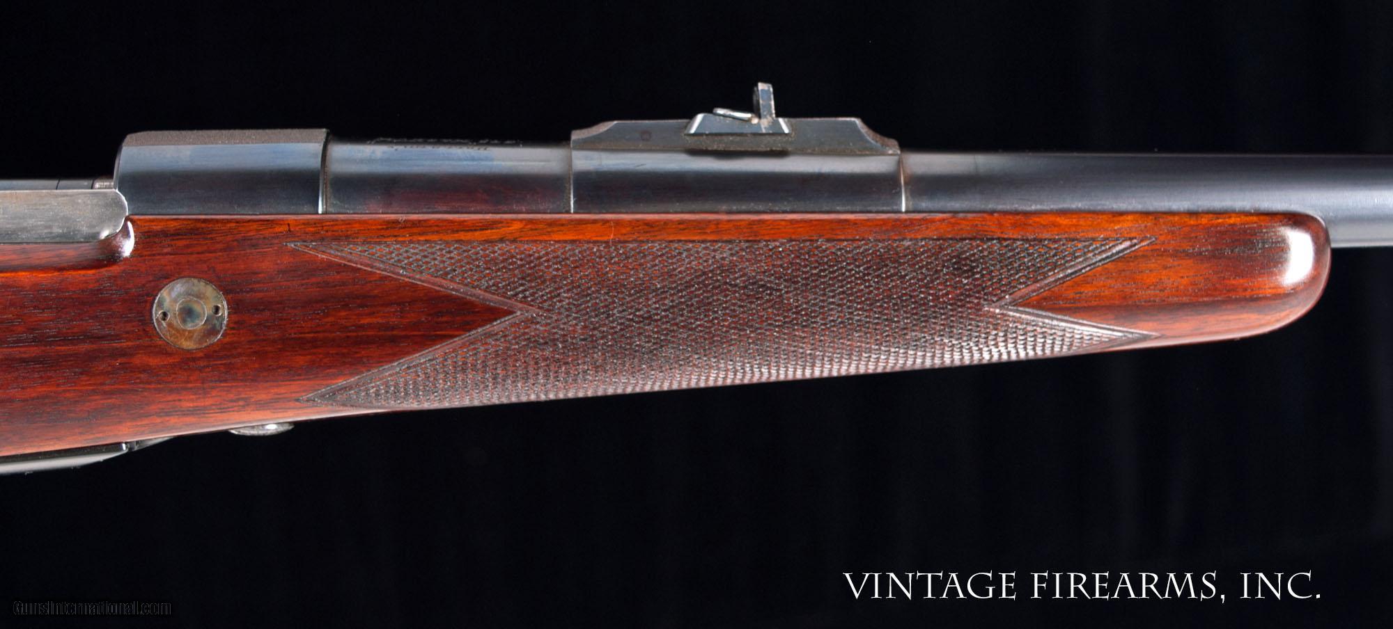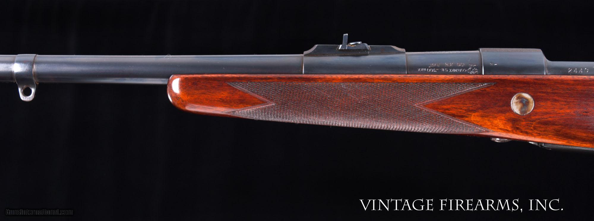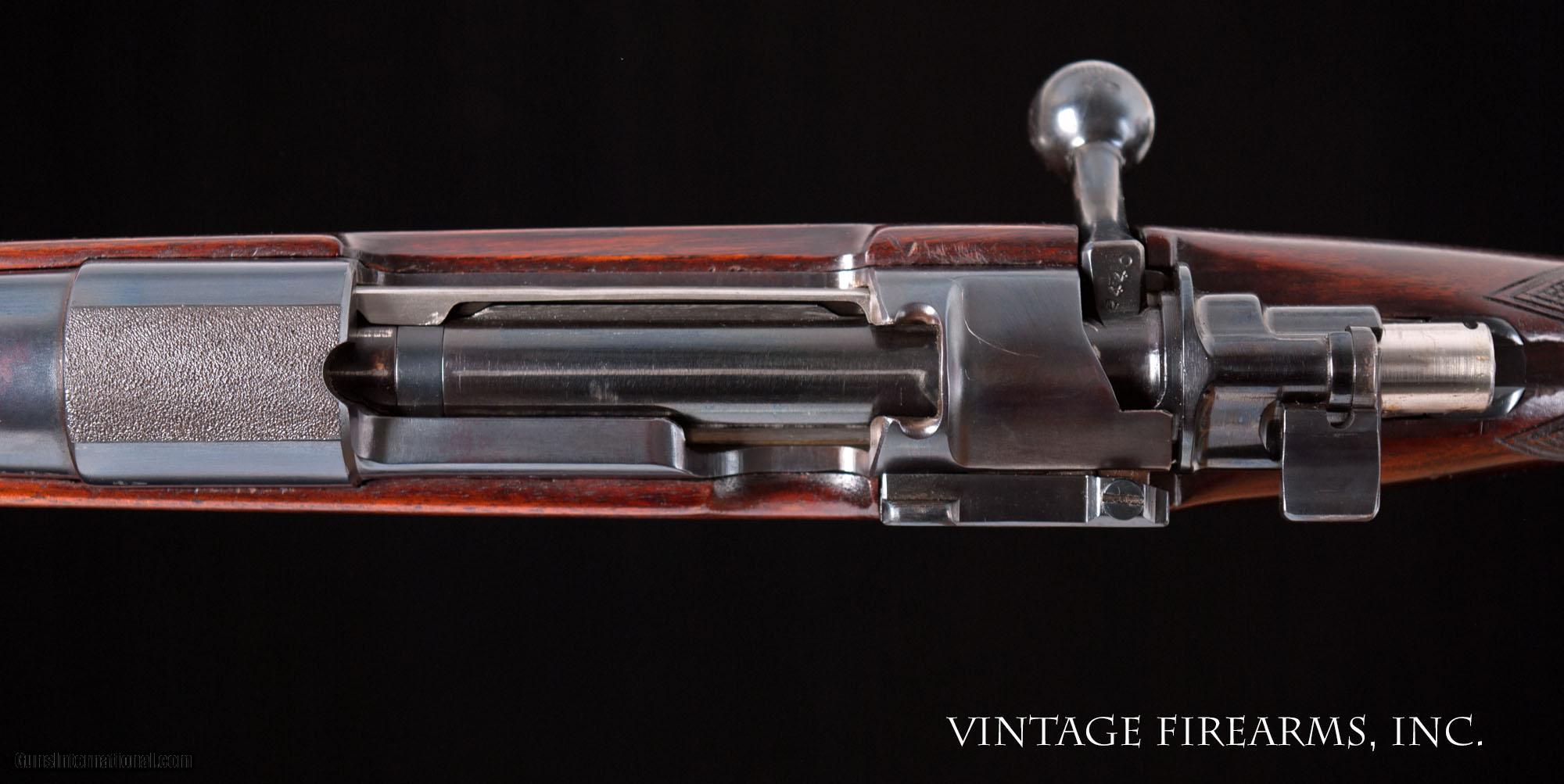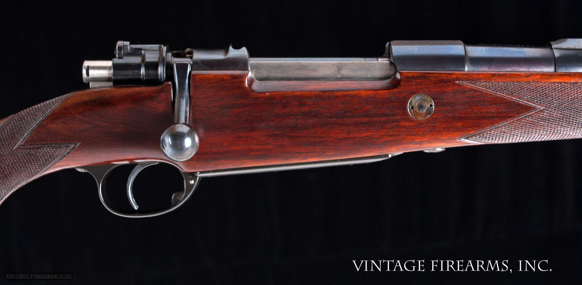 Description: Holland & Holland Magazine Rifle .375 Magnum TAKEDOWN, DOCUMENTED, MAUSER ACTION, 99% General Specs: Holland & Holland, Year 1955, .375 Rimless Magnum, 8lbs 2oz, Bolt Rifle Serial Number: 2440 What a privilege to be able to bring to market a near new Holland & Holland Magazine Sporting Rifle built in 1955 on a Mauser action complete with full factory documentation, original factory leather case, accessories, and in near new condition. This fine rifle, sn2440, chambered for the world renowned .375 Holland & Holland Magnum Rimless cartridge, is the epitome of class and prestige in the world of dangerous game and hunting the dark continent. Equally at home in pursuit of North America’s largest game animals, including the great bears, moose, and elk, this rifle is one of a very small number built as a “take-down” style rifle so that it may travel in the beautiful leather case that H & H made specifically for this gun. This is a highly desirable rifle and in beautiful, factory original condition with only the slightest amount of wear on the gun, including the expanded magazine 4 cartridge capacity floor plate. The gun shows little to no use, and is essentially as new in all ways. The factory pad is rock hard and if you would like we will install a genuine Silvers pad from England on the gun so the recoil pad is functional. We have the exact same pad as the original in stock. There have been no alterations to the gun since it left the factory. The factory supplied leather case is in excellent condition and comes with what looks to be a Huey Case Co. protective canvas cover. The factory supplied cleaning accessories, maker’s label, cartridge charge cards, etc. are all intact and in the case. The top exterior of the case is embossed with the original owner’s name “Major J.G. Defina”. We are offering this treasure at a very affordable price considering its pristine condition, desirable features, and today’s replacement costs. Thanks for looking! Barrels Barrel Length: 24" Hykro steel Chokes: factory Bores: mint bore Bore Diameter: 0.375 % Blue: 99% factory original Sights: 1 standing; 1 folding rear Action Action: converted Militry mauser Case Color: screws and grip cap Screws: excellent Trigger Type: single, crisp Trigger Guard Color: 99.5% factory Stock Type: dark European walnut LOP: 14 5/8" LOP To End Of Wood: 13 3/4" DAH: 2 5/8" DAC: 1 5/8" Cast: 5/16" off Checkering Condition: excellent factory Butt Treatment: silvers pad rock hard ****There are more photos upon request. We have closeups of all the interior metal and wood of the rilfe when it is taken apart, in addition to closeups of interior of case, etc. Please email us to request the full round of photos.***** We offer a 30 day mechanical warranty on this fine shotgun. Call us for full details. PLEASE SEE MY OTHER FINE VINTAGE FIREARMS. Just open one of my ads and click on the line that says “see all items from this seller” and a very nice list of fine sporting and collectible arms will appear. I have many more fine sxs shotguns not yet listed. Thanks for looking! We employ a full time gunsmith on premises and can perform alterations to suit your needs within a few weeks of purchase. Payment Methods: Money Order, Certified Check, Personal Check, Wire Transfer Inspection Period / Return Policy: Three Days from the date the item was received. Sales Tax: 6% Michigan Only Shipping & Insurance: Ground $160.00 We ship internationally! Item Condition: Used Requires FFL?: Yes If you have any questions about this item or payment, please email or call us directly, at #616-292-6240. Thanks! Jay Shachter, Vintage Firearms, Inc We employ a full time gunsmith on premises and can perform alterations to suit your needs within a few weeks of purchase. Common requests are: -stock bending to suit your particular requirements -addition of any specified butt pad to increase length of pull -alteration of chokes to suit your shooting preferences -lengthening of chambers and forcing cones -darkening stock color with penetrating stains -restoring any part of the gun including rust blue, charcoal blue, bone and charcoal case color, wood restoration and checkering recuts. If you like one our guns but it needs "tweaked", let us know and we can quote you a time and price. Some enthusiasts like the guns "as found" and others want them "just so". We often list guns as found and let the particular buyer choose how they want their gun to fit or look. SOLD Curio/Relic: Yes |