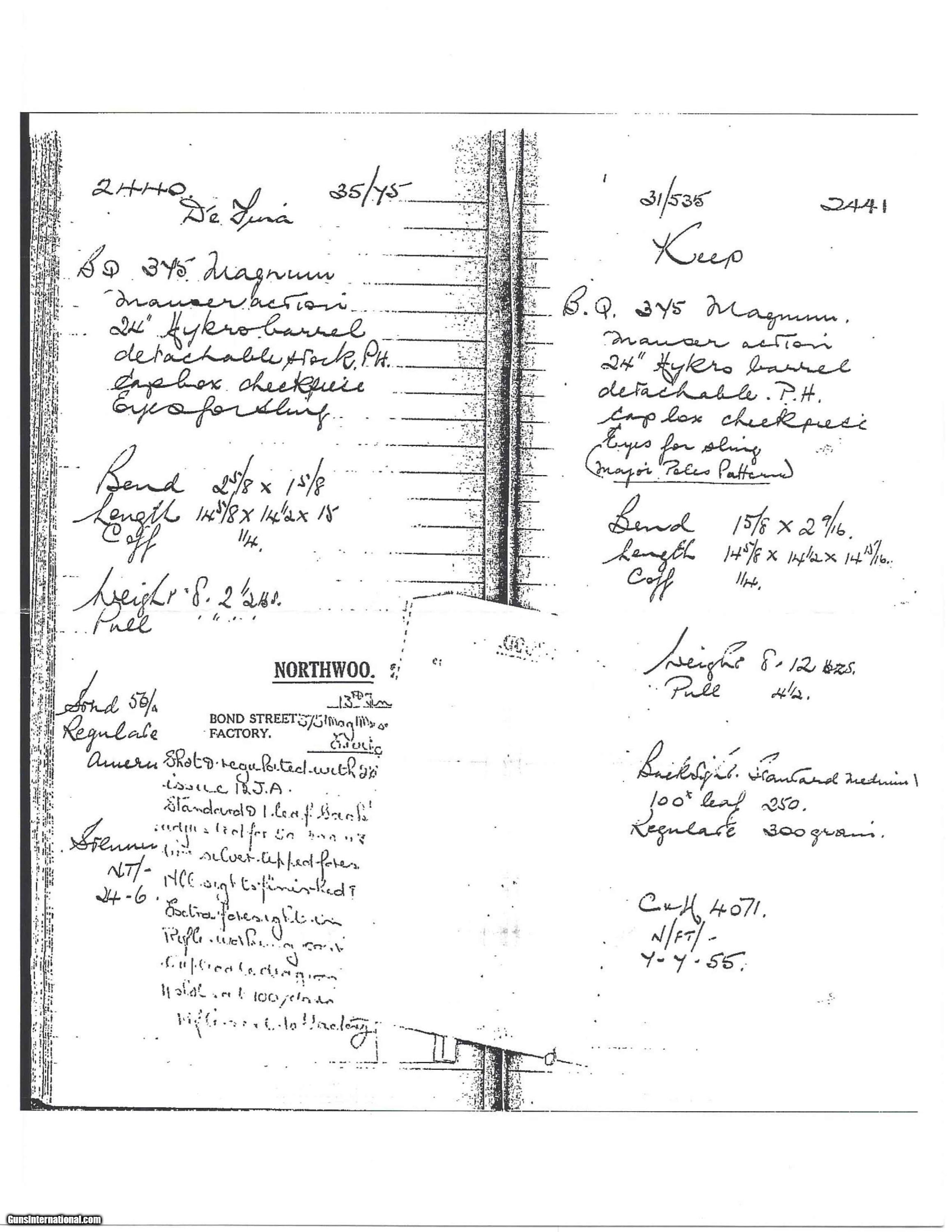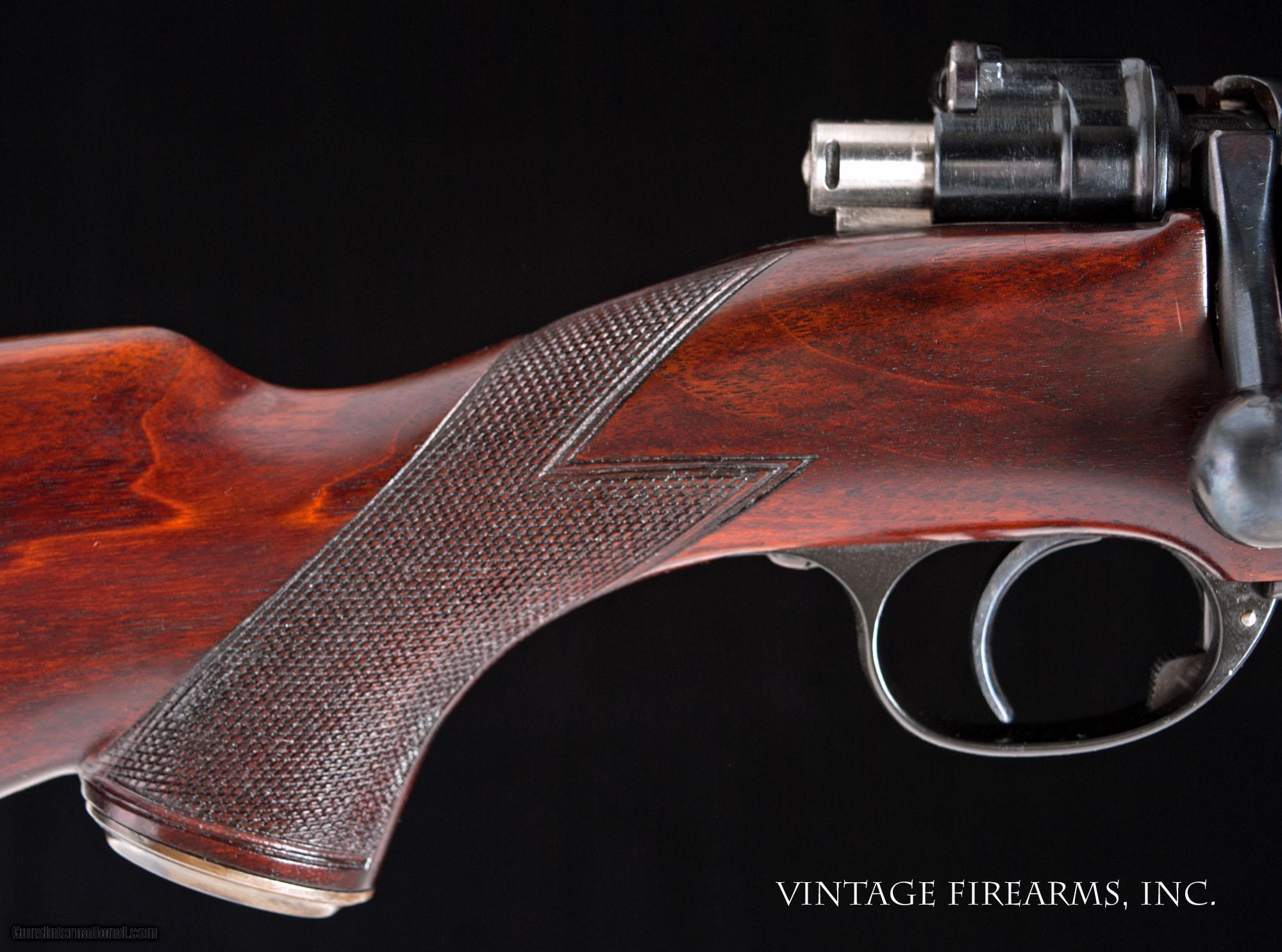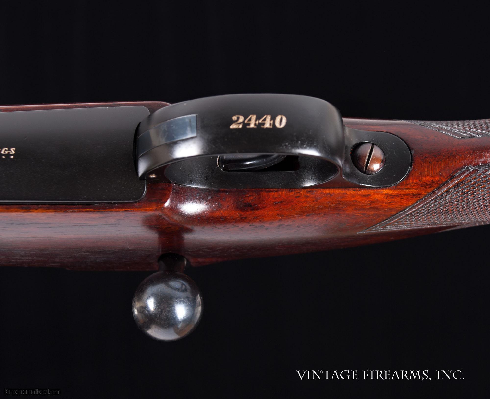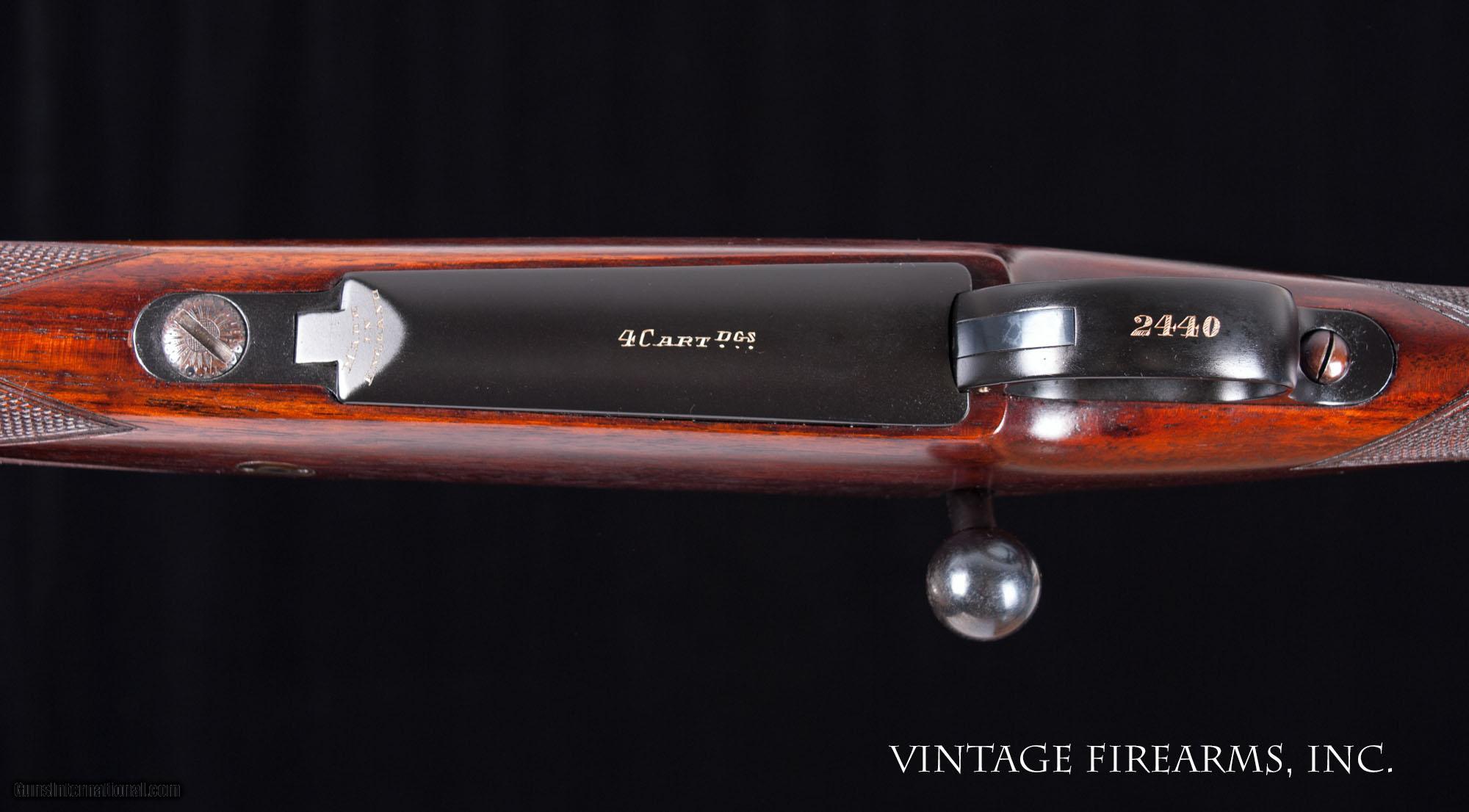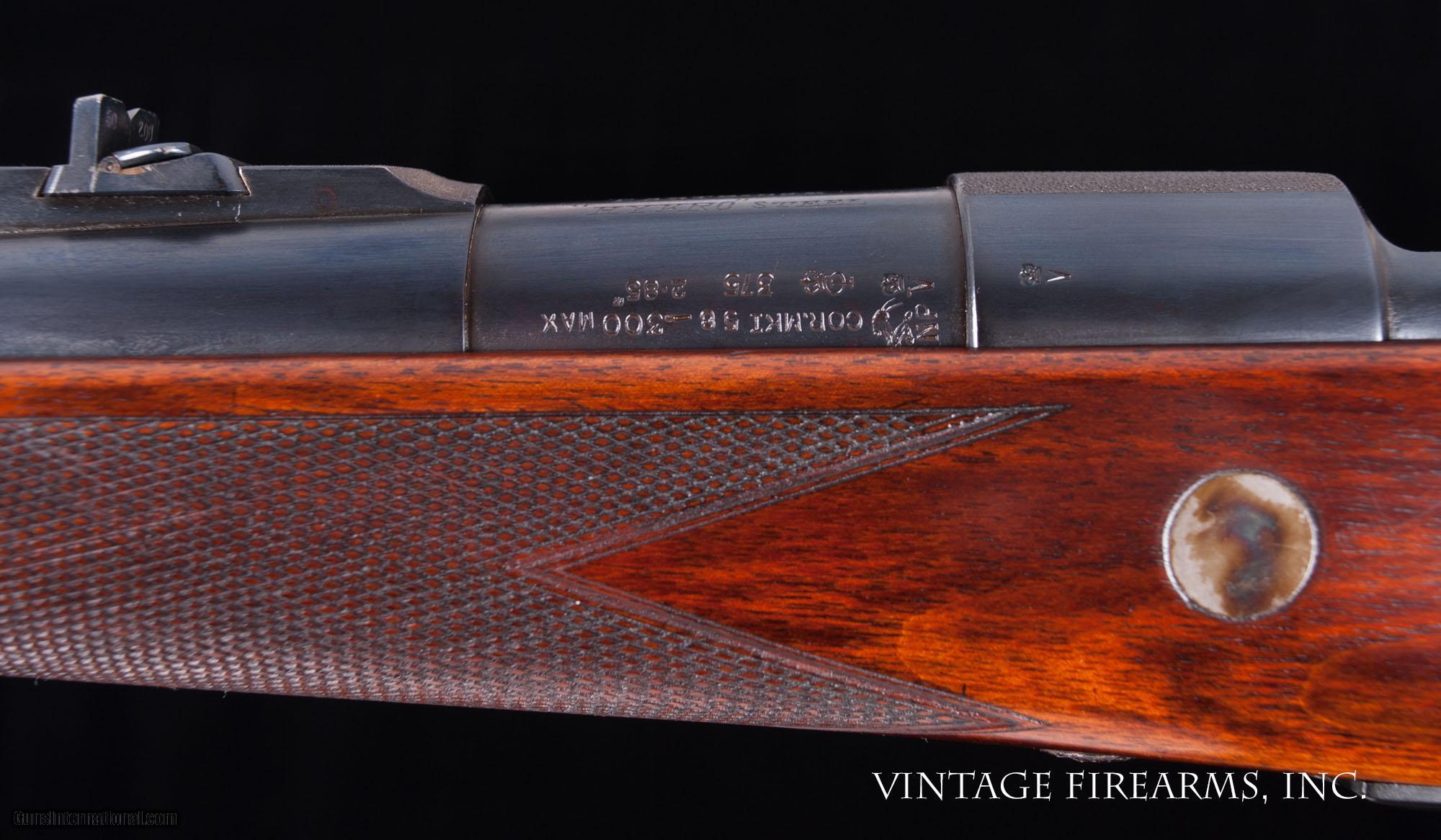 Description: Holland & Holland Magazine Rifle .375 Magnum TAKEDOWN, DOCUMENTED, MAUSER ACTION, 99% General Specs: Holland & Holland, Year 1955, .375 Rimless Magnum, 8lbs 2oz, Bolt Rifle Serial Number: 2440 What a privilege to be able to bring to market a near new Holland & Holland Magazine Sporting Rifle built in 1955 on a Mauser action complete with full factory documentation, original factory leather case, accessories, and in near new condition. This fine rifle, sn2440, chambered for the world renowned .375 Holland & Holland Magnum Rimless cartridge, is the epitome of class and prestige in the world of dangerous game and hunting the dark continent. Equally at home in pursuit of North America’s largest game animals, including the great bears, moose, and elk, this rifle is one of a very small number built as a “take-down” style rifle so that it may travel in the beautiful leather case that H & H made specifically for this gun. This is a highly desirable rifle and in beautiful, factory original condition with only the slightest amount of wear on the gun, including the expanded magazine 4 cartridge capacity floor plate. The gun shows little to no use, and is essentially as new in all ways. The factory pad is rock hard and if you would like we will install a genuine Silvers pad from England on the gun so the recoil pad is functional. We have the exact same pad as the original in stock. There have been no alterations to the gun since it left the factory. The factory supplied leather case is in excellent condition and comes with what looks to be a Huey Case Co. protective canvas cover. The factory supplied cleaning accessories, maker’s label, cartridge charge cards, etc. are all intact and in the case. The top exterior of the case is embossed with the original owner’s name “Major J.G. Defina”. We are offering this treasure at a very affordable price considering its pristine condition, desirable features, and today’s replacement costs. Thanks for looking! Barrels Barrel Length: 24" Hykro steel Chokes: factory Bores: mint bore Bore Diameter: 0.375 % Blue: 99% factory original Sights: 1 standing; 1 folding rear Action Action: converted Militry mauser Case Color: screws and grip cap Screws: excellent Trigger Type: single, crisp Trigger Guard Color: 99.5% factory Stock Type: dark European walnut LOP: 14 5/8" LOP To End Of Wood: 13 3/4" DAH: 2 5/8" DAC: 1 5/8" Cast: 5/16" off Checkering Condition: excellent factory Butt Treatment: silvers pad rock hard ****There are more photos upon request. We have closeups of all the interior metal and wood of the rilfe when it is taken apart, in addition to closeups of interior of case, etc. Please email us to request the full round of photos.***** We offer a 30 day mechanical warranty on this fine shotgun. Call us for full details. PLEASE SEE MY OTHER FINE VINTAGE FIREARMS. Just open one of my ads and click on the line that says “see all items from this seller” and a very nice list of fine sporting and collectible arms will appear. I have many more fine sxs shotguns not yet listed. Thanks for looking! We employ a full time gunsmith on premises and can perform alterations to suit your needs within a few weeks of purchase. Payment Methods: Money Order, Certified Check, Personal Check, Wire Transfer Inspection Period / Return Policy: Three Days from the date the item was received. Sales Tax: 6% Michigan Only Shipping & Insurance: Ground $160.00 We ship internationally! Item Condition: Used Requires FFL?: Yes If you have any questions about this item or payment, please email or call us directly, at #616-292-6240. Thanks! Jay Shachter, Vintage Firearms, Inc We employ a full time gunsmith on premises and can perform alterations to suit your needs within a few weeks of purchase. Common requests are: -stock bending to suit your particular requirements -addition of any specified butt pad to increase length of pull -alteration of chokes to suit your shooting preferences -lengthening of chambers and forcing cones -darkening stock color with penetrating stains -restoring any part of the gun including rust blue, charcoal blue, bone and charcoal case color, wood restoration and checkering recuts. If you like one our guns but it needs "tweaked", let us know and we can quote you a time and price. Some enthusiasts like the guns "as found" and others want them "just so". We often list guns as found and let the particular buyer choose how they want their gun to fit or look. SOLD Curio/Relic: Yes |