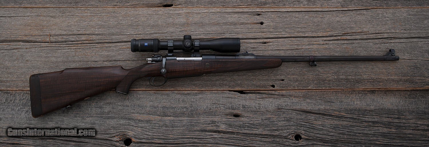 Description: Holland & Holland - Mauser - .375 H&H Mag caliber - Item Number: HOL3961 Rifle type: Bolt Action Action: Bolt Action Barrel length: 25 Sights: 1 Stand. Bar, 1 Fold. Leaf / Blade Front Mounts: H&H Claw Scope: Zeiss Power: 1.5x - 6x Weight: 10 lbs, 12 oz Overall condition: Very Good Stock condition: Very Good Metal condition: Very Good Stock: Original finish Metal: Original finish Type of Case: Aluminum case Finish: Blue Type of Butt: Purdey Pad Pad thickness: 1.25 " Manufactured in: England Lop: 14 5/8 " Hand: Right Comments : Very good condition with some light handling marks. Barrel band and gold oval. R-104 F5 SOLD |