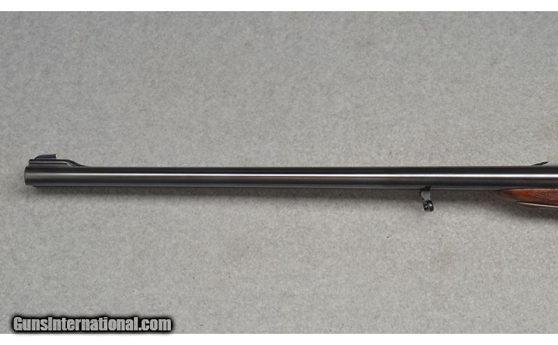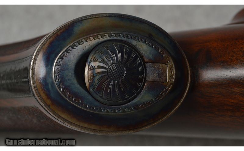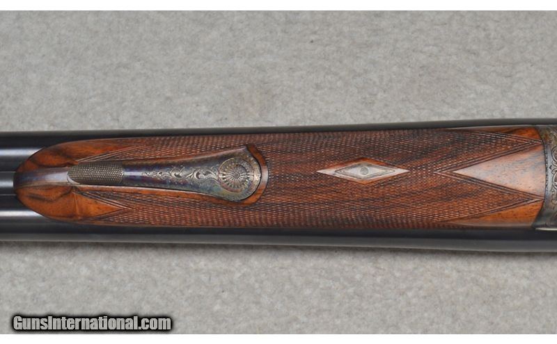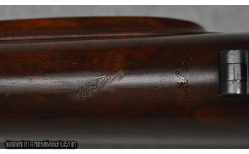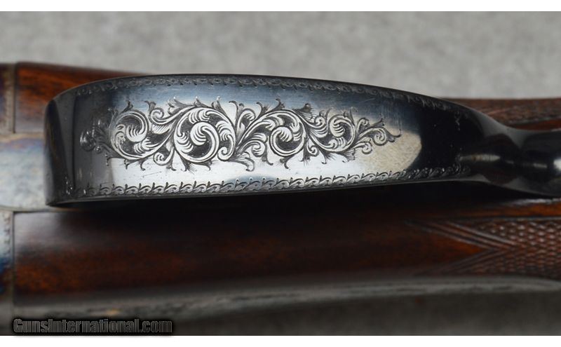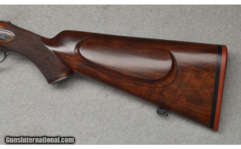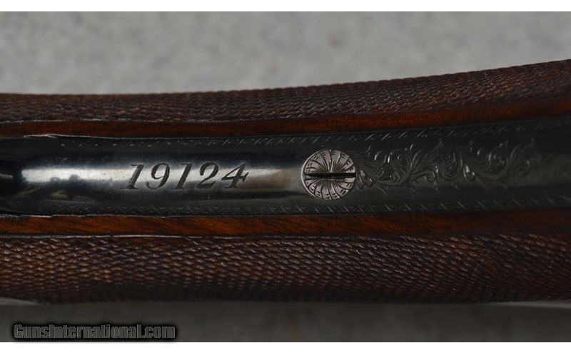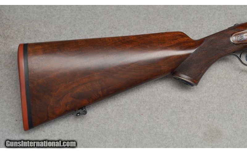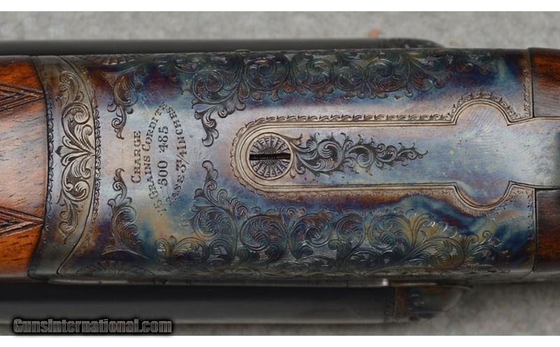 Description: Holland & Holland No.2 Model chambered in .500/.465 (Nitro Express) is in excellent condition. The barrels respectively signed "HOLLAND & HOLLAND 98, NEW BOND STREET, LONDON" and "WINNERS OF ALL THE FIELD RIFLE TRIALS LONDON". The case hardened treble grip action has blued removable firing pin bushings, engraved loading data on the underside, blued toplever, an automatic safety with gold inlaid "SAFE". It has a casehardened trigger plate, blued trigger guard, case hardened pistol grip cap, walnut pistol grip stock with a raised cheekpiece, checkered grip and foregrip. It has been expertly redone with blue and casehardened finish with a later scroll engraving. It has small handling marks and the replacement wood has sharp checkering and minimal handling marks. SN: 19124 None SOLD Metal Condition: Excellent Wood Condition: Excellent Bore Condition: Clean and shiny Barrels: 26 Triggers: Double trigger Stock Dimensions: LOP 15 1/4 Fore End: Wooden with a checkered pattern Butt Pad: Rubber Weight: 11 lb 1 oz Sights: Matted ramp mounted bead Item Location: Fort Worth, TX |