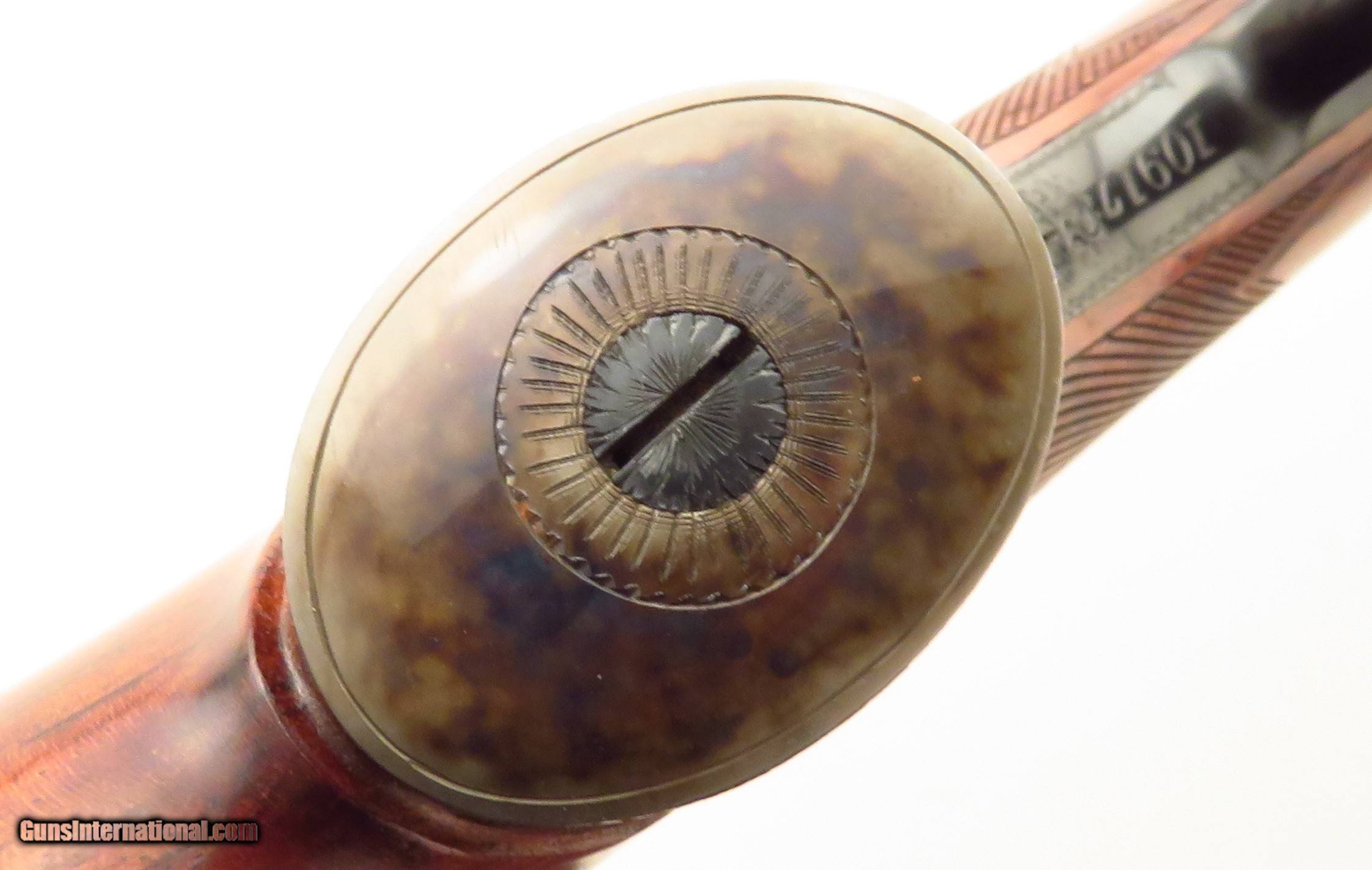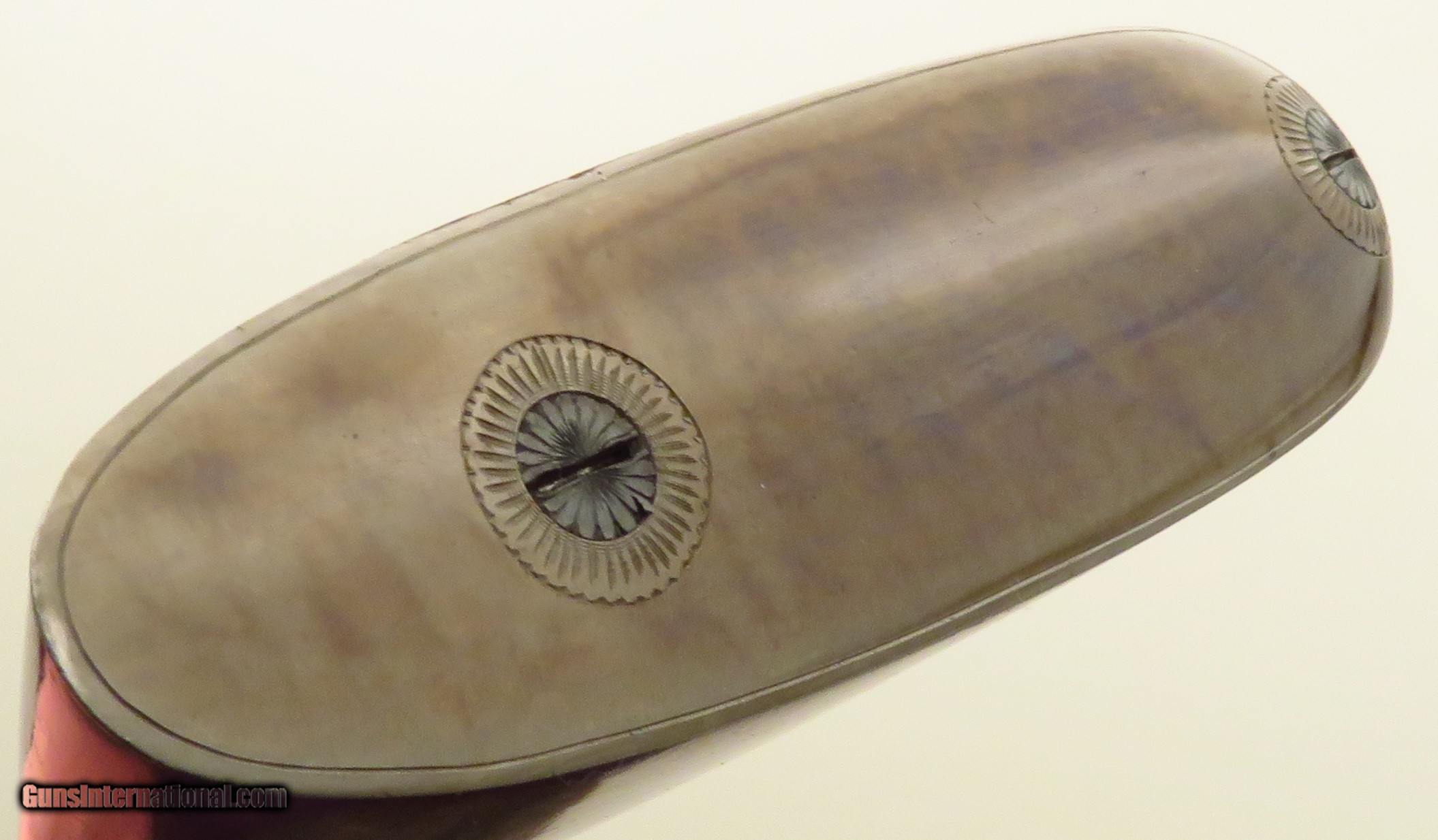Description: Pair Holland & Holland rook rifles restored and rebored to .38 Long Colt (see related note). Imported by Cape Outfitters, serials 10917 and 10918 have 26-inch tapering octagon barrels (.670-inch at the muzzle flats, beaded blade front sights, matted ribs, drift-adjustable rear sight assemblies with one fixed and two folding leafs, ejector). Features include rust blue and color case, manual safeties and engraving with gold accents (gun number, “safe”). STOCKS: Forends are accented with ebony tips and dressed with wrapping flat-diamond checkering. Butts have color case plates (widow's peaks) and grip caps. DIMENSIONS: Individual weight is 5.0 pounds and lengths-of-pull are 14.7 inches. CONDITIONS as restored and rebored: Gun 1 - The bore is outstanding. Ejector and other mechanics operate properly. Barrel finish is approximately 95 percent with softened markings. Balance of blue is at least 95 percent. Colors are bright. Wood is approximately 97 percent with faint indications of handling. Gun 2 - As Gun 1 with wood of approximately 95 percent. AMMUNITION: Approximately 700 rounds of Western 150-grain jacketed round nose ammunition is included. CASE: What is thought to be the original case is present. Interior has been restored. Labels are intact with earlier caliber information. Exterior is as rough and cratered as Nancy Pelosi's neck skin due to improper storage. SAFETY NOTES: Bore dimensions are .345-inch (lands) and .350-inch (grooves). Rifles were not remarked with current caliber after reboring. Consigner states both are chambered for .38 Long Colt and were used as such. The included ammunition was provided by the consignor as part of the package. Each rifle was test fired with .38 Long Colt ammunition with no indication of case expansion, primer issues or difficulty with ejection. That said, as with all unmarked firearms it is recommended that these be examined and/or chamber cast by a qualified, professional gunsmith prior to loading or firing. The price is firm and layaway is available. Price: $10,000.00 Shipping: $250.00 Contact Seller |