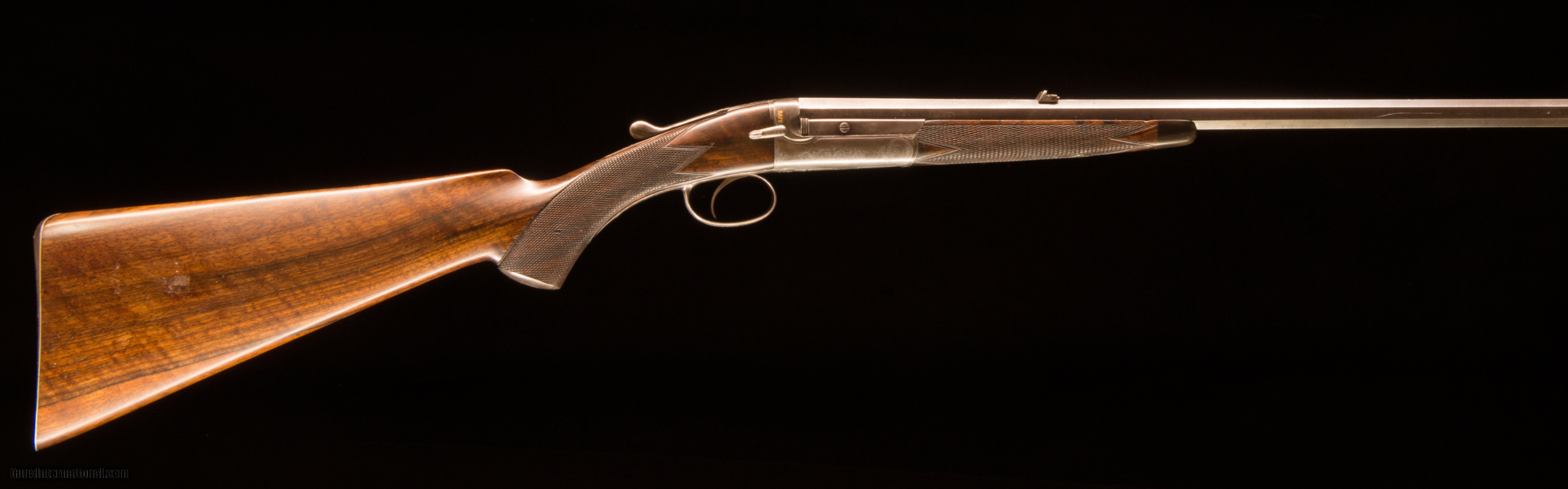 Description: Drillings, Double Rifles, and Rifles - This is a little gem! Very nice condition and bore! A .297/.250 \'THE ROSS\' 1882 PATENT LEVER-COCKING SINGLE-BARRELLED HAMMERLESS EJECTOR ROOK RIFLE, serial serial no. 13176, 25in. lined octagonal nitro barrel with matt top-flat, open sights and two folding leaf sights with white metal inlaid sight lines and marked for 50, 100 and 150 yards, engraved \'HOLLAND & HOLLAND. 98, NEW BOND ST. LONDON. 250 SEMI SMOOTH BORE\' on the right, the left with \'WINNER OF ALL THE \'FIELD\' RIFLE TRIALS 1883. PATENT No. 1294.\', H.W. Holland patent lever-cocking action, patent no. 1294 of 17th March 1882, carved teardrop fences, removable striker disc, manual side lever safety with engraved \'SAFE\' detail, non-selective ejector mechanism, border and acanthus scroll engraving, 14 1/2in. figured pistolgrip stock with steel pistolgrip-cap and buttplate, Hackett snap fore-end with horn finial, weight 5lb. 4oz., in its canvas and leather case, the lid exterior marked \'J.O. JOHNSON\' Holland and Holland tell us this was completed in April 1889 for \'J.O. Johnson\' *** Note: To see this gun with high resolution photos and a zoom-in feature, go to the vintagedoubles main site and search for the gun ID: 3494 or browse the main site to see our full gun collection. SOLD Antique: Yes Manufacturer: Holland & Holland Round action top lever single shot rifle in excellent condition ~ Rooks look out! Model: Round action top lever Serial Number: 13176 Caliber Info: .297 Ejectors: No Barrels: 25 Barrel Type: Steel Action: top lever with Purdey double under bite Gauge Info: Caliber LOP: 14 3/4 Weight: 5 lb. 4 oz. Choke Left: NA Choke Right: NA Proof:Nitro: .297/250 ROSS Minimum Wall Thickness Left: NA Minimum Wall Thickness Right: NA |