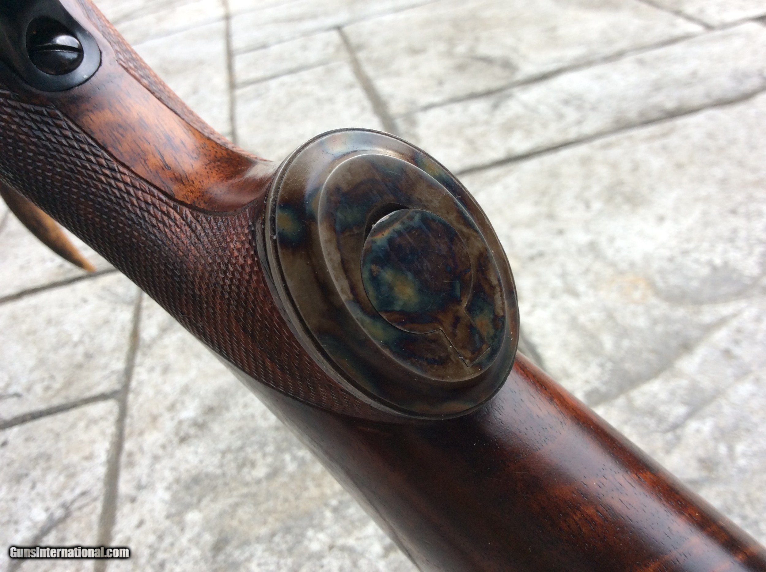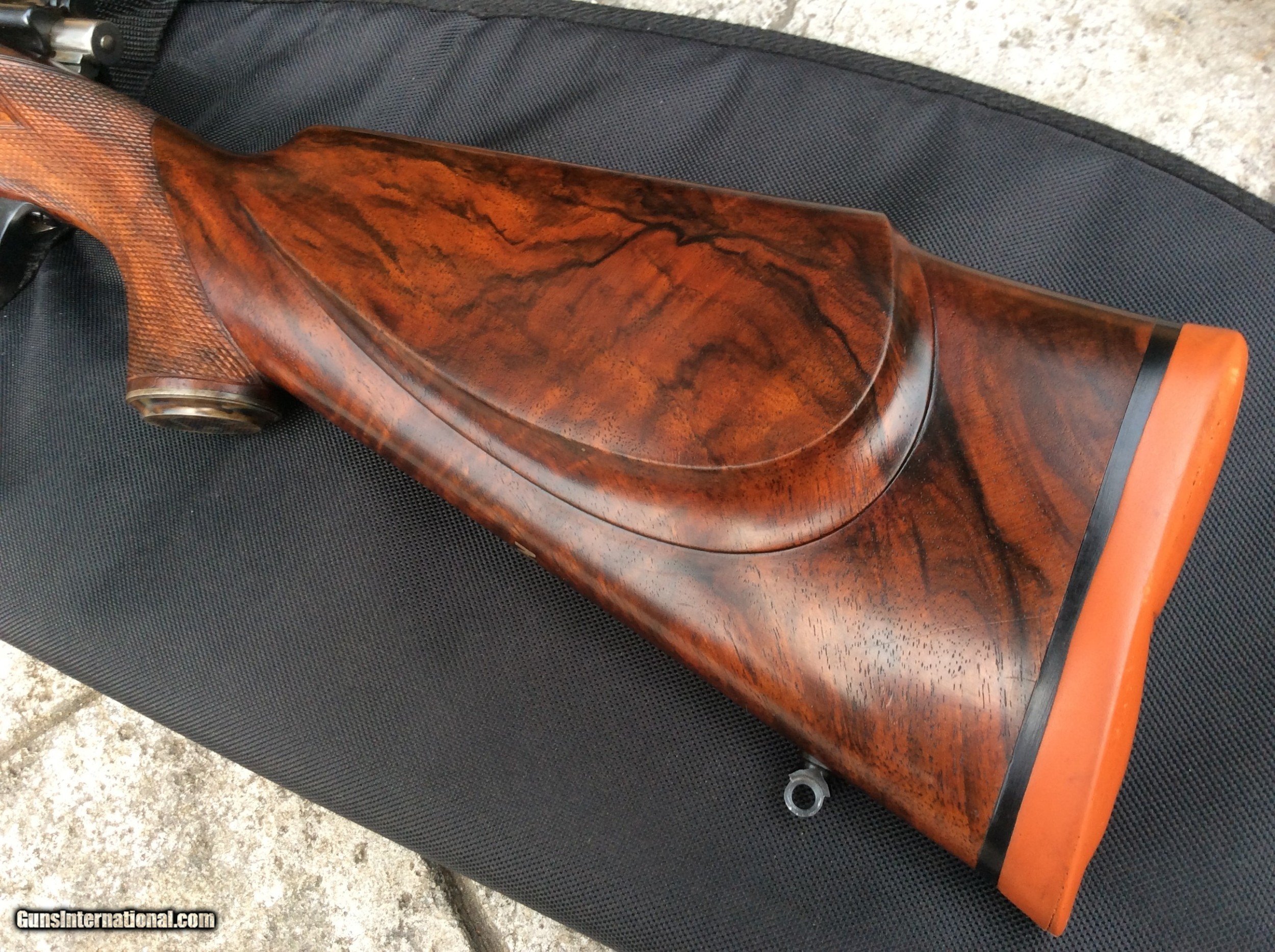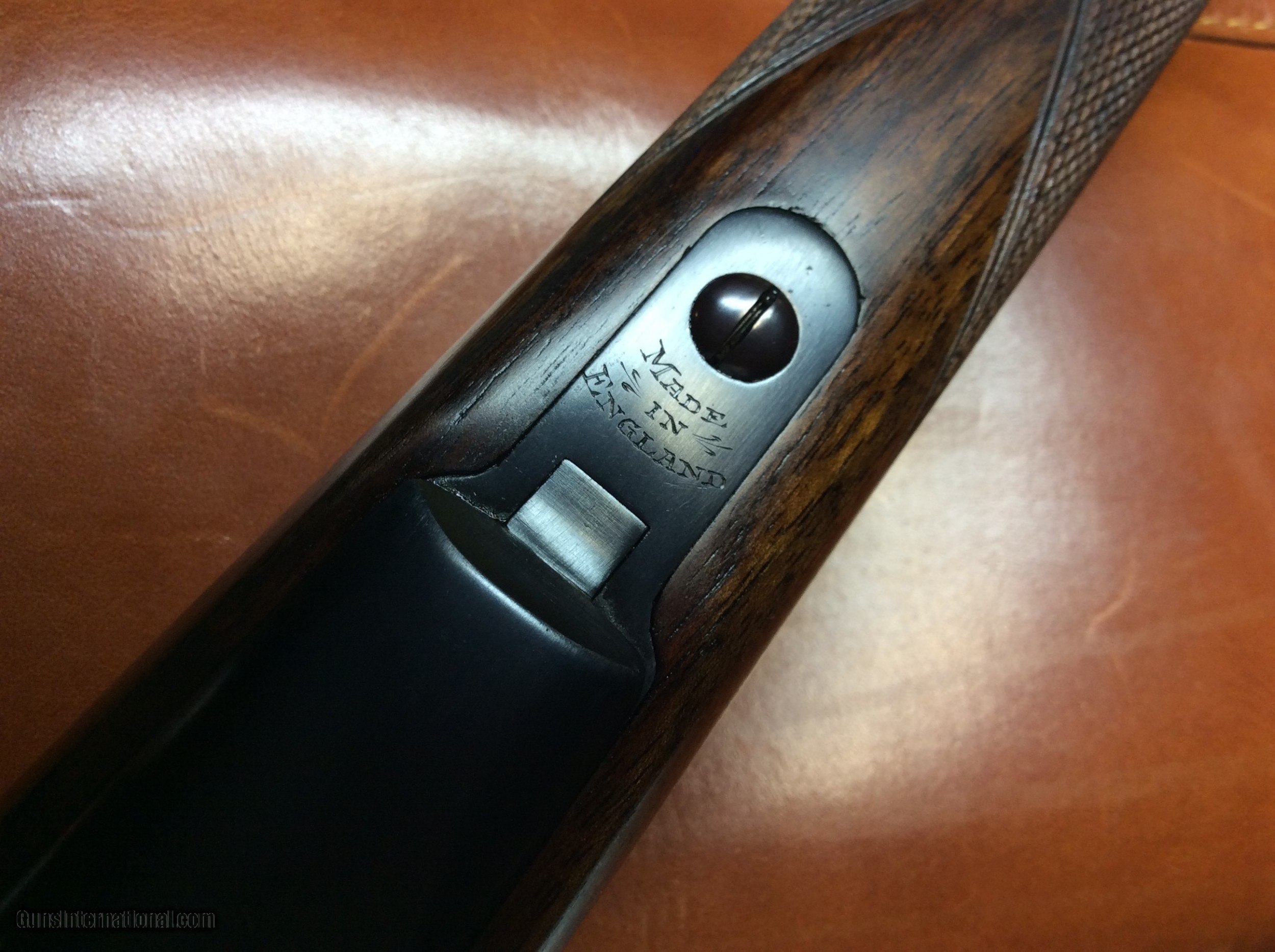 Description: Beautiful Holland & Holland Bolt Action Magazine Rifle chambered in the highly respected .308 Norma Magnum caliber, considered by most reloaders as superior to the popular .300 Win Mag. Single Square Bridge Oberndorf Mauser action. 25” ported barrel with barrel band sling swivel, island rear sight (folding leaf) and ramp front sight (fine bead) with folding hood. Gorgeous piece of wood with 13 9/16” LOP to Silvers rubber recoil pad. Case colored steel trapdoor grip cap holding spare front sight. Weight 8 lbs 3 ounces. Vintage c. early 1970's based on serial number and 13 Bruton Street London address. Excellent overall condition (wood, metal & mechanicals) with excellent bore. Comes with a set of RCBS FL reloading dies & 50 pcs new unfired Norma brass. SOLD |