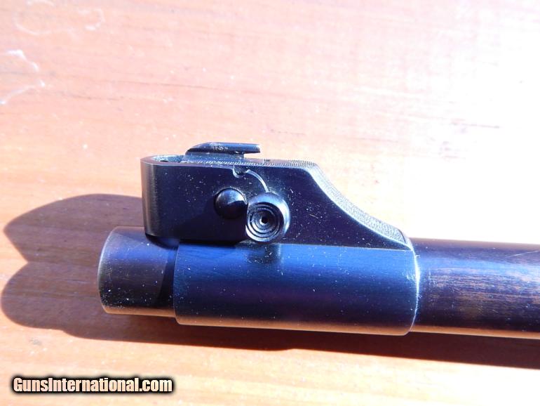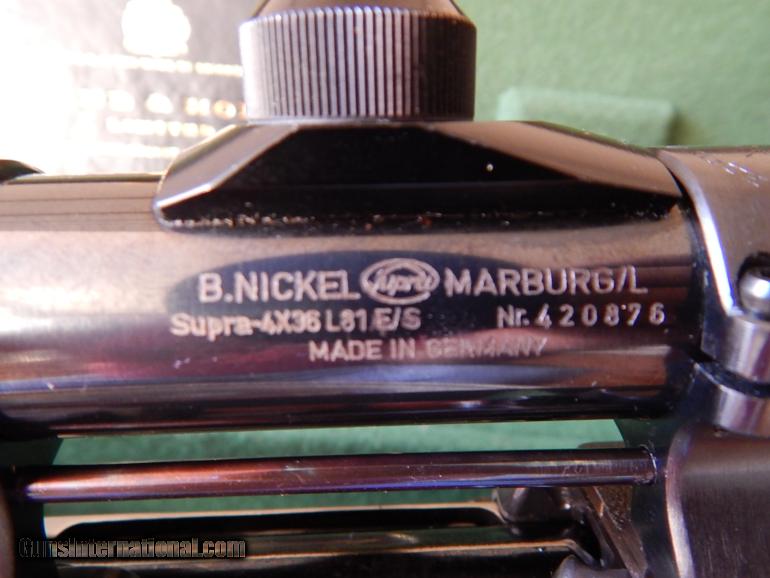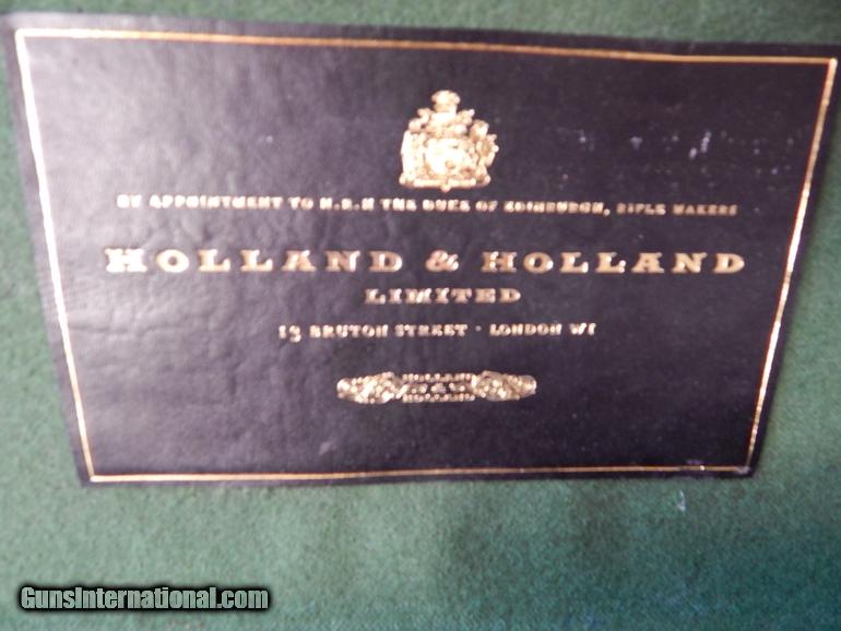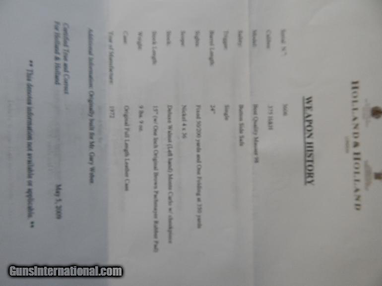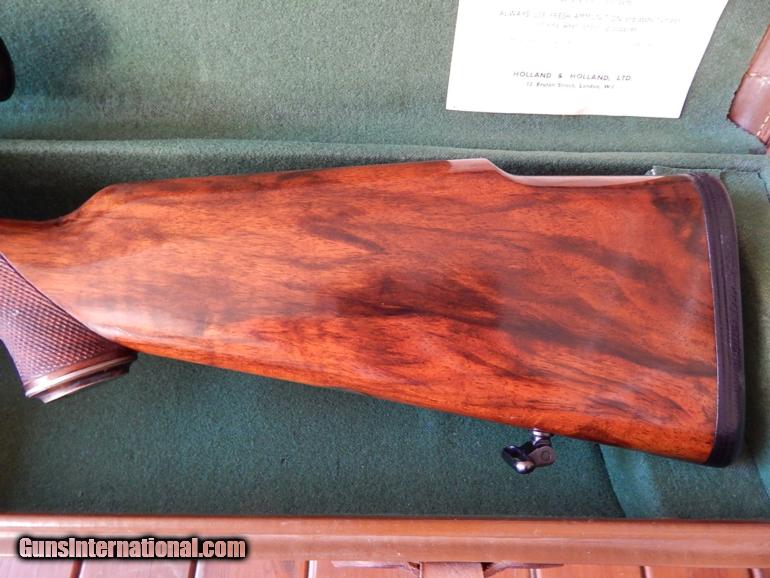 Description: Holland & Holland .375 H&H take down dangerous game magazine rifle with case. Produced in 1972, this bolt action take down rifle has a factory installed 4x Nickel's scope and Holland & Holland's patent quick disconnect scope mounting system. Rear scope ring is engraved Holland and serialized to the rifle. Optics of the Nickel's 4x scope are crystal clear. The barrel is 24" and has a fixed rear sight blade for 50/200 yards and one folding blade at 350 yards. Bore condition is mint. The barrel has a fold up hooded front sight and barrel banded sling swivel stud. Deluxe walnut left handed Monte Carlo stock with cheek piece. Case colored trap door grip cap with extra front sight blade enclosed. Stock has a sling swivel stud and is adorned with a very nice beaded black leather recoil pad with the length of pull measuring 15". Weight without the scope is 8 pounds 5 ounces and 9 pounds 8 ounces with scope. This take down rifle is easily dissembled with the turn of the front action screw. The rifle resides in a nice leather case complete with supporting letter from Holland & Holland. All FFL rules apply and rifle must ship to a FFL dealer. Buyer pays shipping and insurance. FOB shipping point. Any questions call me. SOLD |