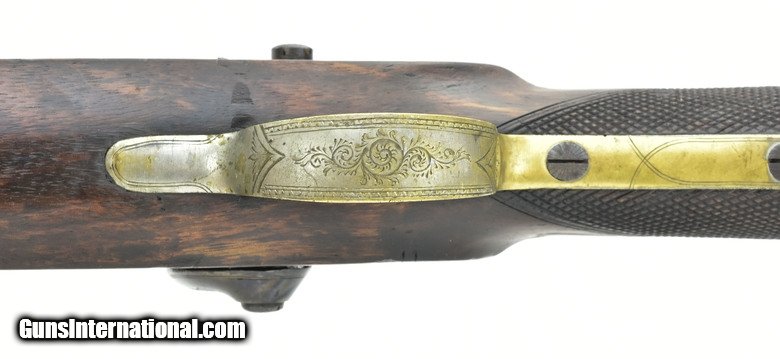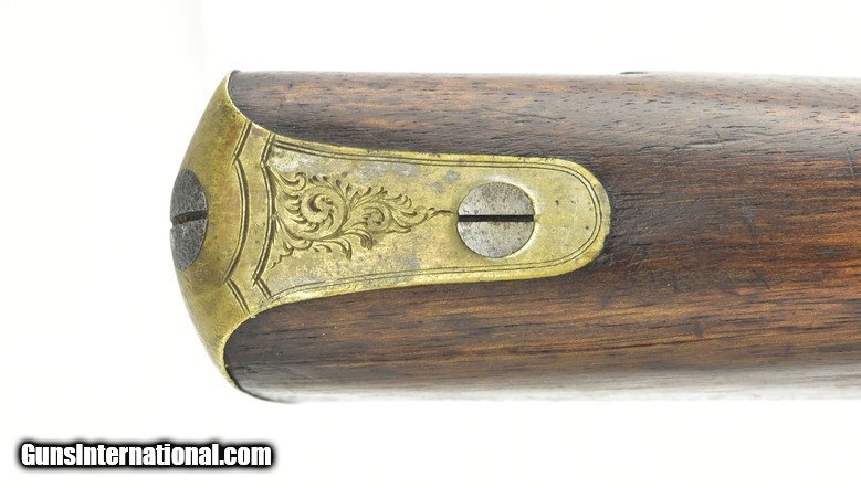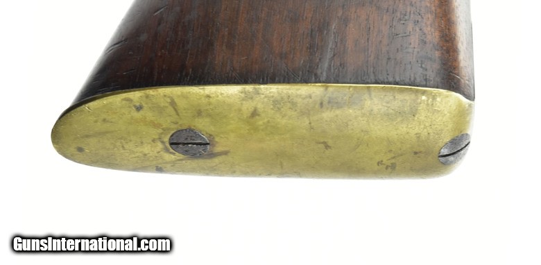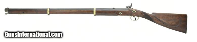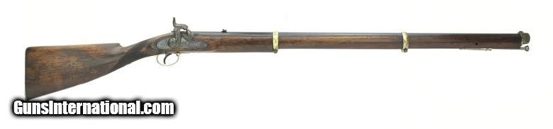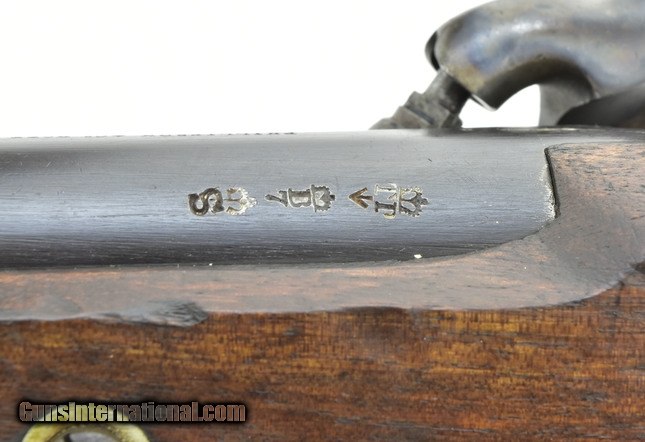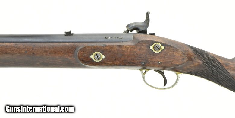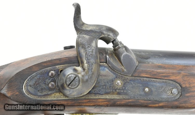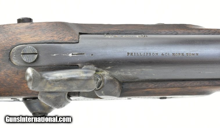 Description: Hollis and Son Smooth Bore Dangerous Game .75 caliber musket. Made by Hollis and Sons, London and Birminghan. Retailed by Phillipson and Co., Hopetown, South Africa. Marked “Phillipson & Co. / Hopetown” on lock and top of barrel. 36” Round barrel with excellent bore. Case hardened lock and hammer with strong colors. Approximately 98% blue barrel. Stock with Hollis makers mark is near excellent. Brass furniture with original patina. Two-leaf rear sight graduated 100 and 200. A fine piece ready for your next safari! Trigger guard, butt plate, lockplate, and hammer are finely engraved. This is one of the most unusual early dangerous game guns that we have handled and is in near excellent condition! Would be a centerpiece for any collection of big game rifles! SOLD Antique: Yes |