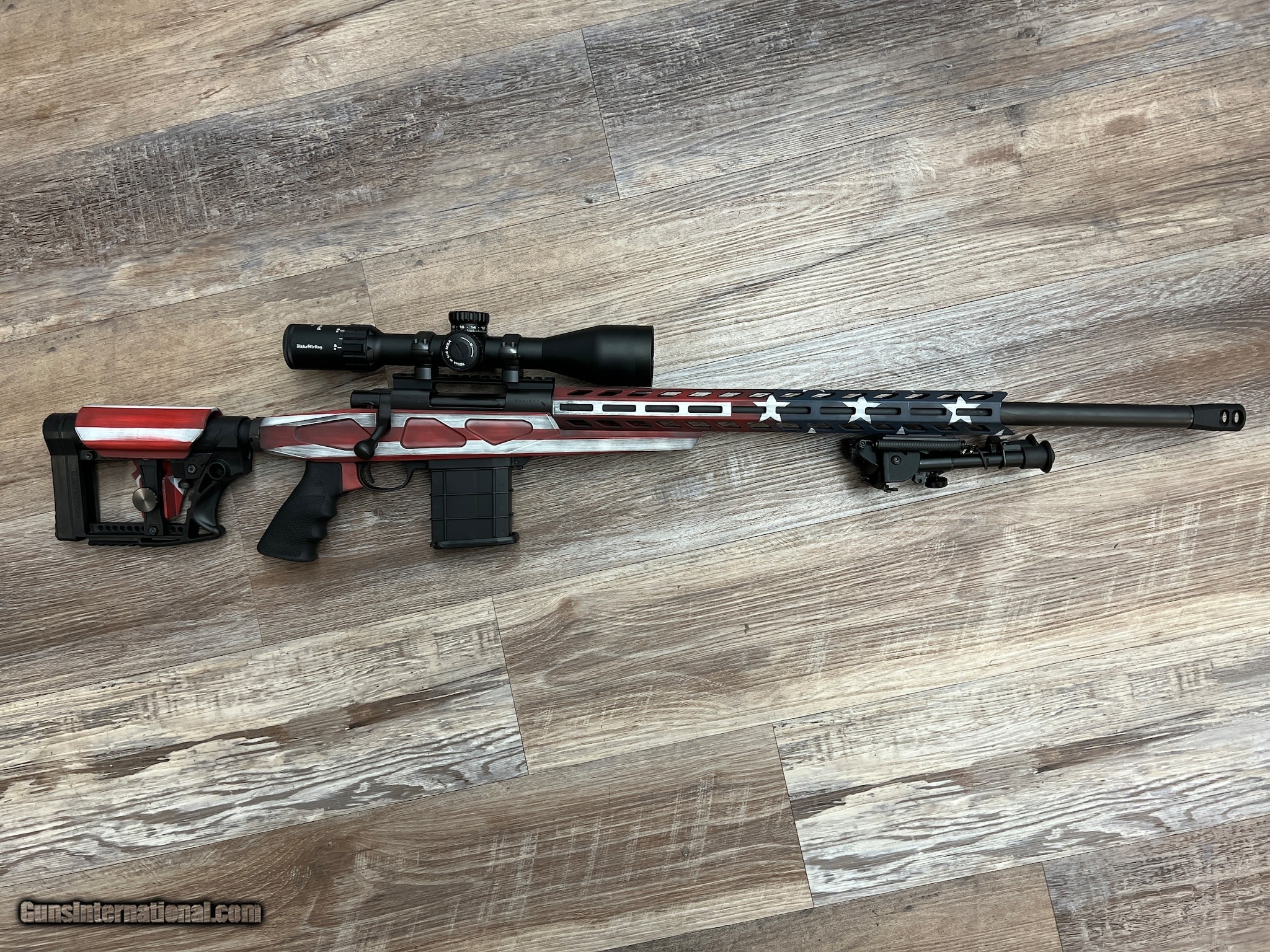 Description: Guns Listing ID: 1076331 This bolt action rifle has a 25in barrel with a bi-pod and one 10rd magazine. It has a 4-16 scope and the original box. NEVER FIRED! SOLD Manufacturer: HOWA Model: 1500 AMERICAN FLAG Caliber Info: 6.5MM CREEDMOOR Condition: Used - Non-Certified Barrels: 25 BARREL Finish: AMERICAN FLAG |