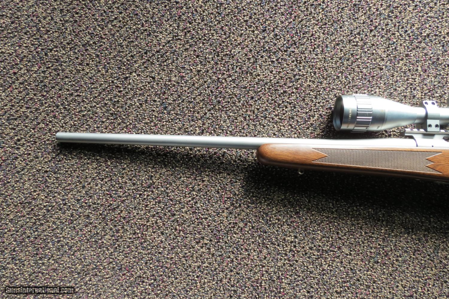 Description: Howa Hunter package in 270 Winchester. Stainless Steel action with 22" stainless steel barrel. One piece high grade checkered pistol grip walnut stock with Decelerator recoil pad. sling swivels, Hinged floor plate. 3.5-10x44 Nikko scope, rings and one piece picatinny rail base. Rifle in very nice condition. Dent in stock shown in picture. Shipping?insurance $35 SOLD |
