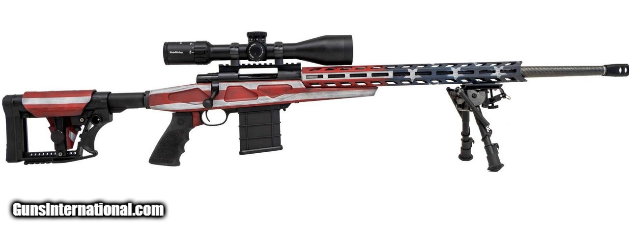 Description: Manufacturer: Legacy Sports International / HOWA Rifles Model: M1500 APC SKU: HCRACF308USA Caliber: .308 Win Rate of Twist: 1 in 10" Capacity: 10 Round Detachable Magazine Barrel Length: 24" Carbon Fiber Heavy Barrel, Threaded Muzzle Threads: 5/8x24 Sights: None, Nikko Stirling Diamond 30mm 4-16x50 Long Range Scope Stock: LUTH-AR / Aluminum Chassis Black Overall Length: 44.5" - 47.5" Free-Float M-LOK Handguard Grip: Hogue Finger Groove Pistol Grip Finish: USA Flag Finish Weight: 11 lbs 2 oz All items are factory new in box unless otherwise stated. Based on the information available to us, the above specifications describe this item to the best of our knowledge. For further information, please contact or visit the manufacturer's . SOLD |