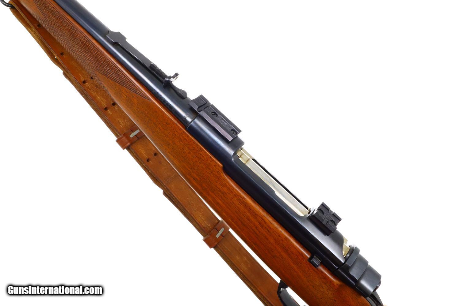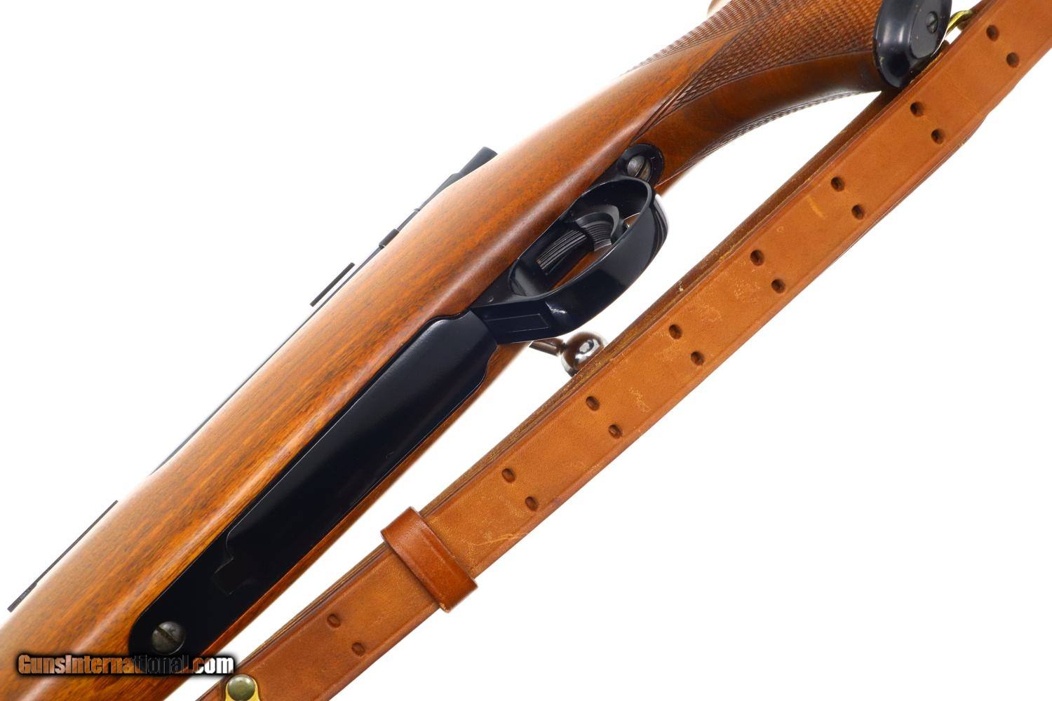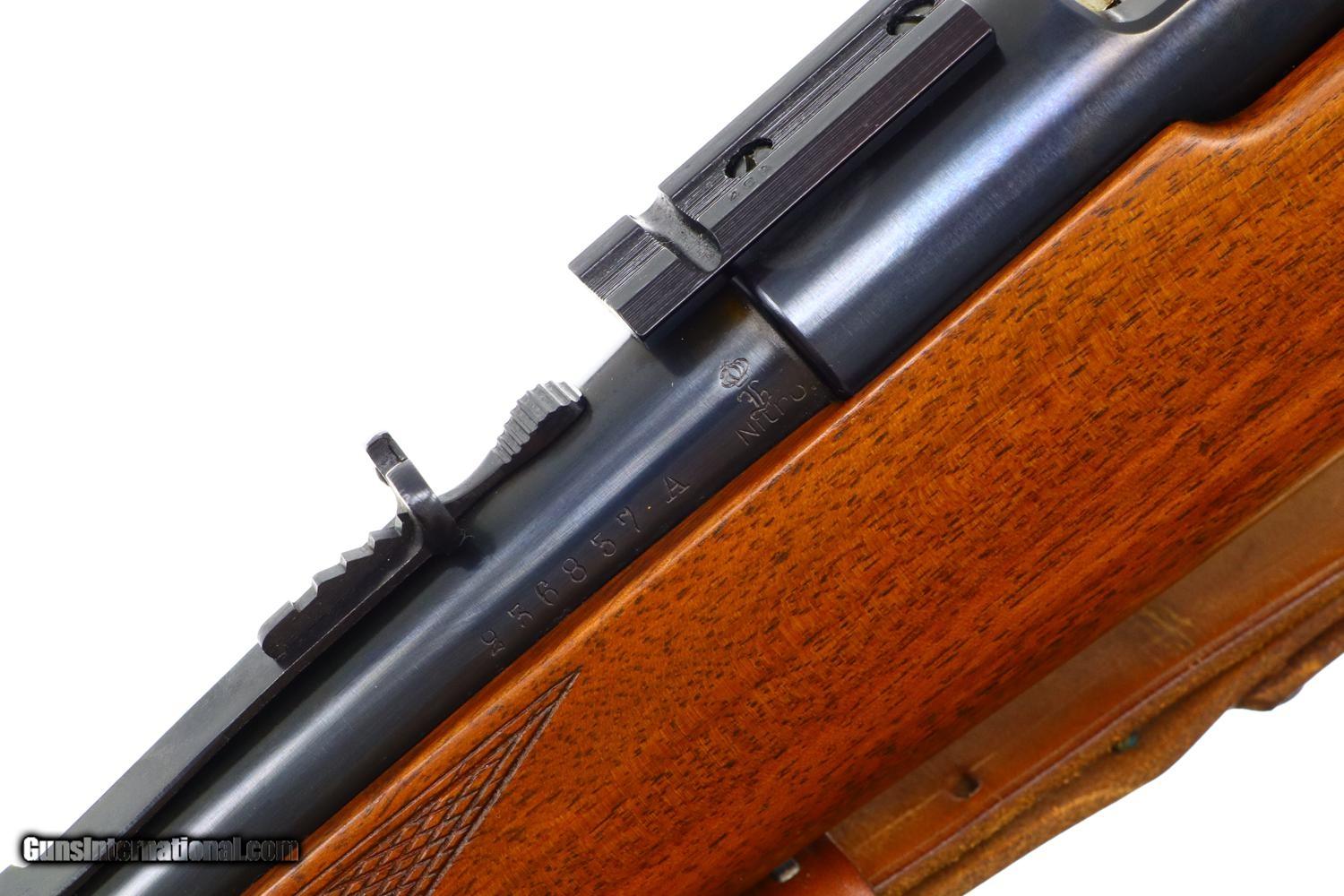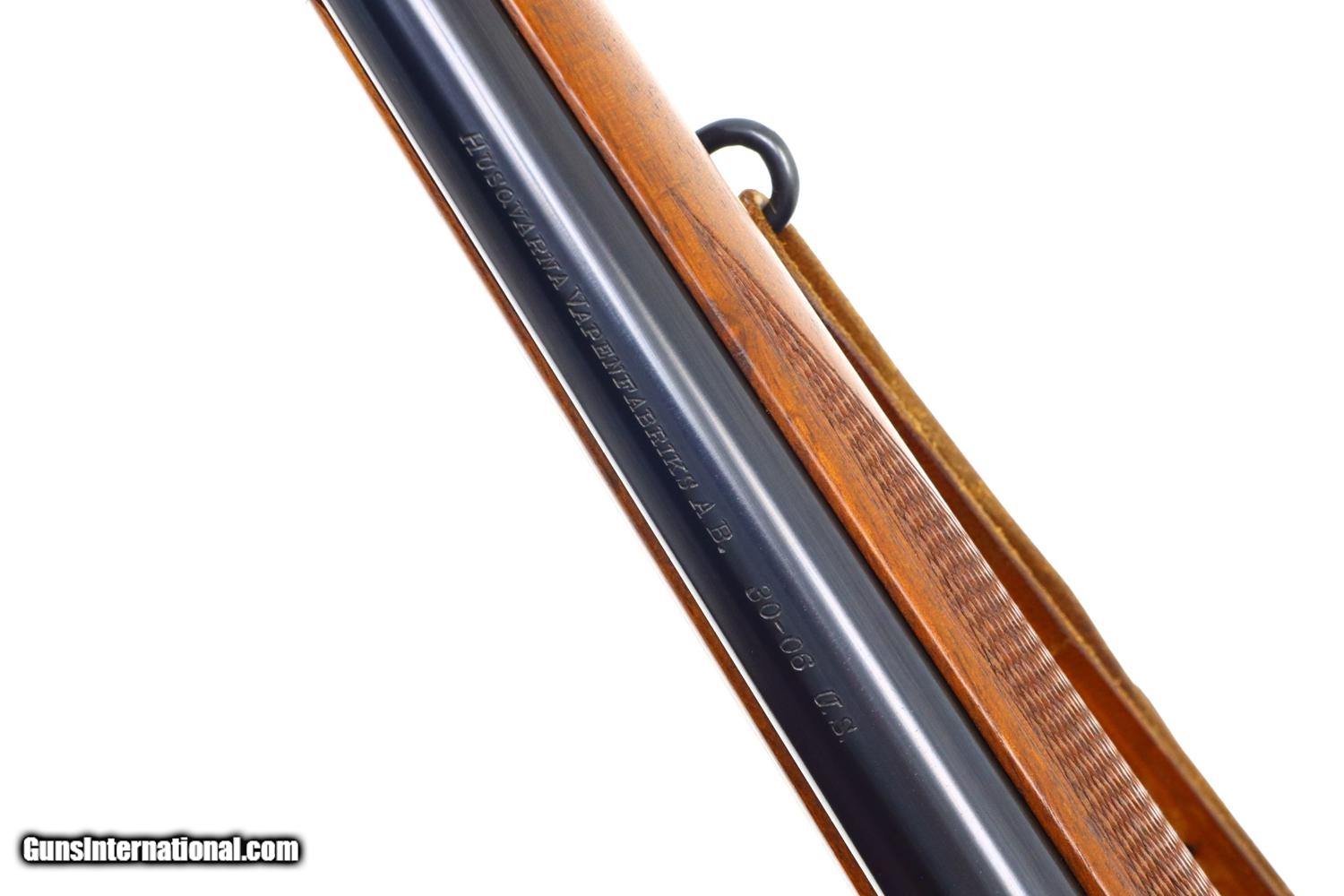Description: Synopsis: Attractive Mannlicher carbine in .30-06 made by Husqvarna in Sweden! Description: Unusual and attractive Mannlicher style carbine made by Husqvarna, likely 1960s, with a 21.75 in. barrel having a ramped bead front sight with protective hood and buckhorn rear sight. Manufacturer address and caliber marked on top of barrel with the SN and proofing on left side near unmarked receiver. Usual turned down bolt and sliding safety. Alloy trigger guard with military style release, the trigger comfortably widened by added shoe. Added White Line recoil pad. Complete with a mounted Weaver K6 power scope and military style sling. Condition: EXC+ with added trigger shoe and recoil pad. Comparable condition scope with bright, crisp optics. EXC sling with a few aging cracks. Mirror bore. Perfect manual mechanics. A great looking little Mannlicher carbine chambered for the classic .30-06 cartridge made by Husqvarna in Sweden. ~~Insured shipping fee of $75; most packages shipped using FedEx 2nd Day.~~ SOLD Manufacturer: Husqvarna Serial Number: 236837A Caliber Info: 30-06 US |
