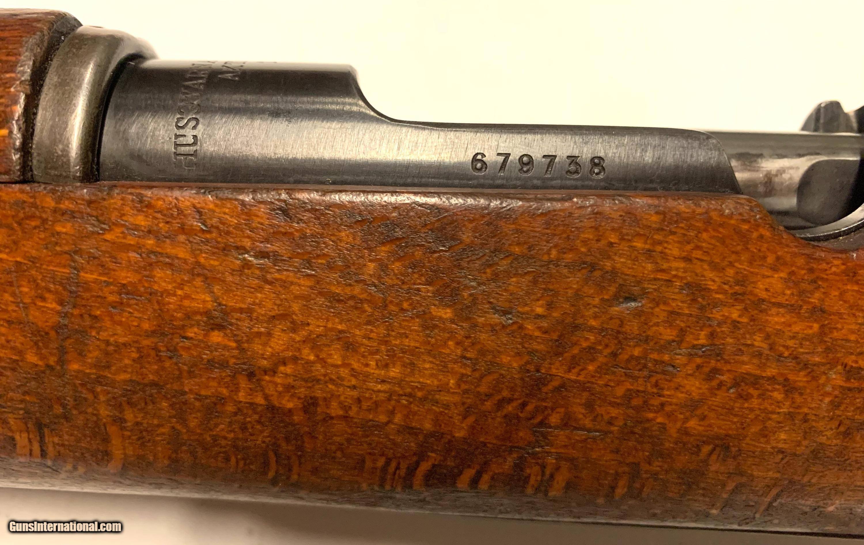 Description: Husqvarna Model 38 bolt action rifle in 6.5x55 Swedish. This rifle is matching numbers and has a 25" barrel with a shiny bore. It is import marked near the muzzle, and includes a flash suppresor, sight hood, and sling. This rifle is dated 1943 and is in very good condition. The wood shows some minor dings typical of a WW2 era service rifle, and the metal is nearly flawless. Very nice example of an M38. Serial number 679738 Shipping, handling and insurance varies on each firearm from $55.00 to $100 depending size, weight and zip code. To be determined after sale. SOLD Curio/Relic: Yes Rifle Caliber: 6.5x55mm Swedish Manufacturer: Husqvarna Model: M38 Serial Number: 679738 Barrel Length: 25 Bore: Rifled Chambers: 1 Ejectors: 1 Condition: Very Good Metal Condition: Good Wood Condition: Good Bore Condition: Shiny Barrels: 1 Action: Bolt Triggers: 1 Finish: Blued Sights: Iron Manufacture Date: 1943 Item Location: New Jersey |