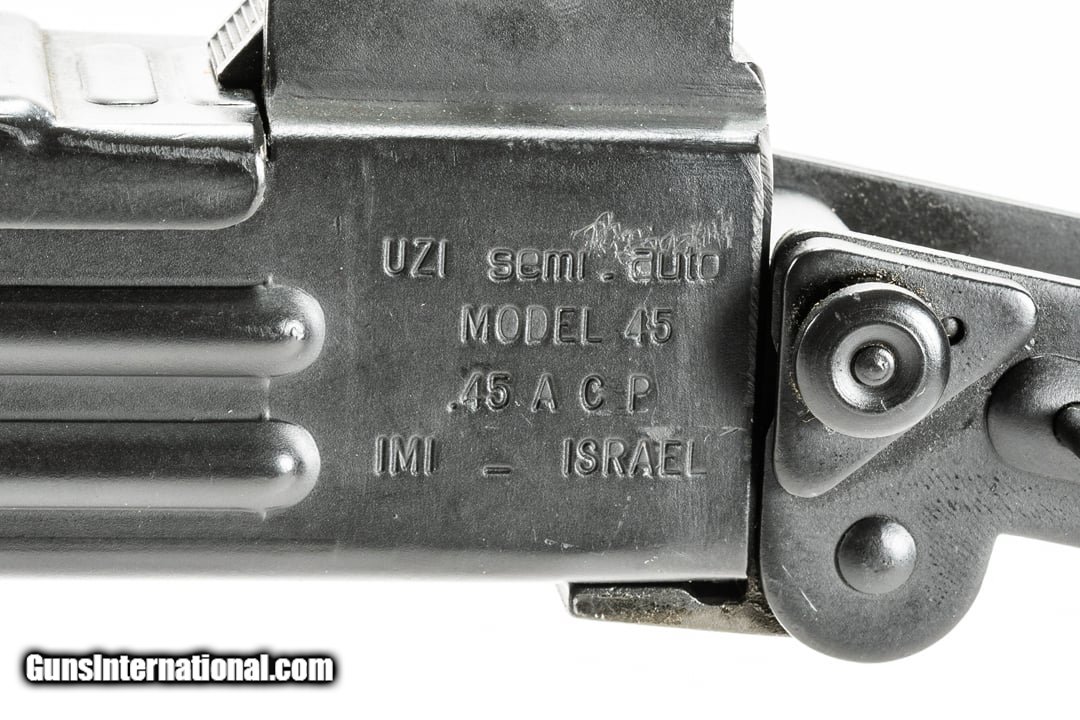 Description: Guns Listing ID: 1313584 Manufacturer: Israel Military Industries (IMI) Model: Uzi Model 45 Condition: Very good Caliber: 9mm Action: Semi-Auto Barrel Length: 16 inch Overall Length: 24.5\" (with stock extended: 31.625\") Capacity: 25rd Features: Made in Israel, pre 1994 assault weapons ban and pre 1989 import ban, collapsible stock Inventory: Original hard plastic case, (3) 25-rd metal magazines, fake/dummy 3\" barrel, original .45ACP barrel • Please be aware that we have not test fired this gun. Unless otherwise stated, expect this firearm to fire and function safely. SOLD Manufacturer: IMI Model: Preban Uzi Model 45 Converted to 9mm w/ Original .45ACP Barrel Caliber Info: 9MM LUGER (9X19 PARA) Condition: Used - Non-Certified Barrels: 16 BARREL Finish: BLACK |