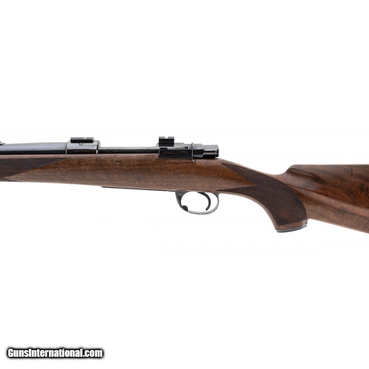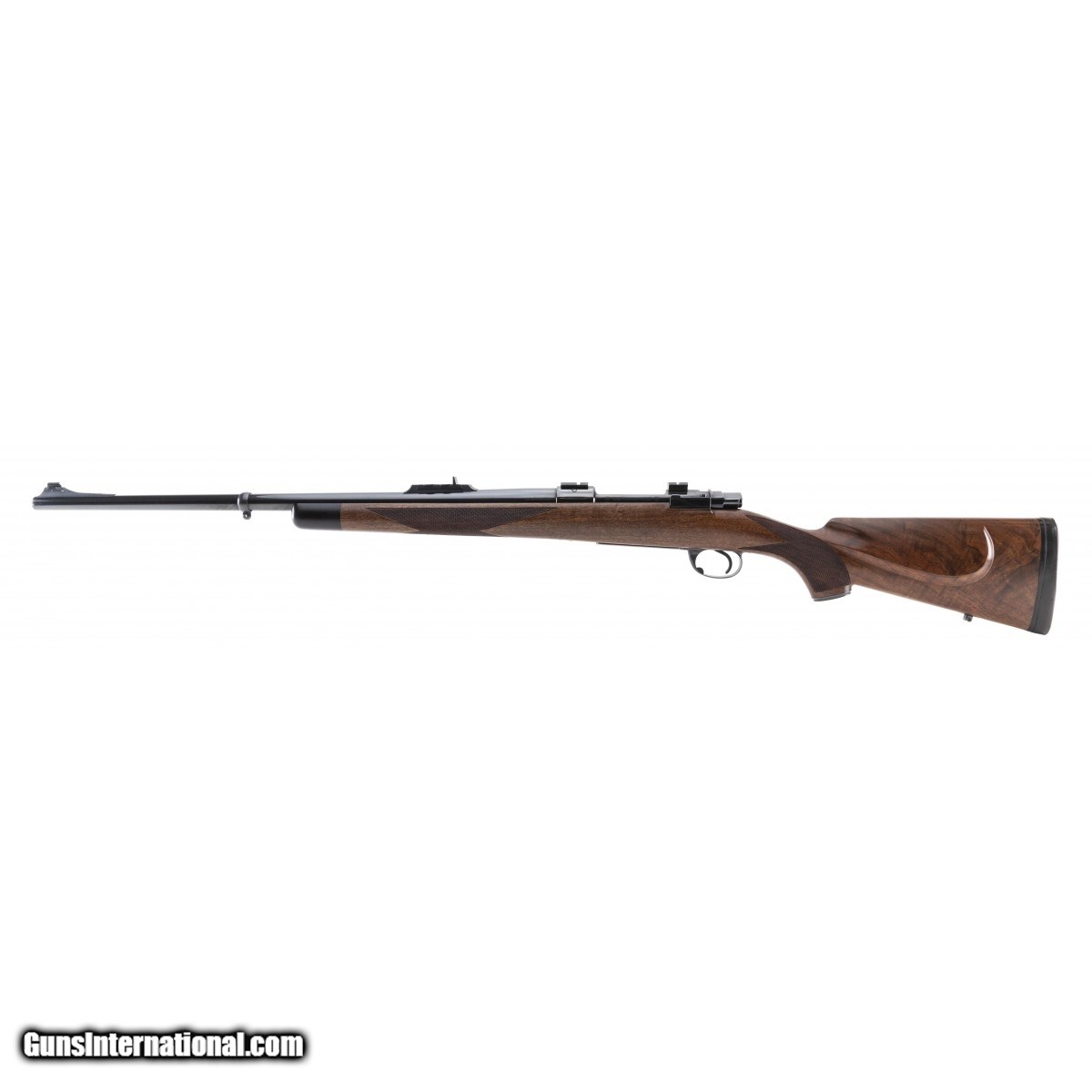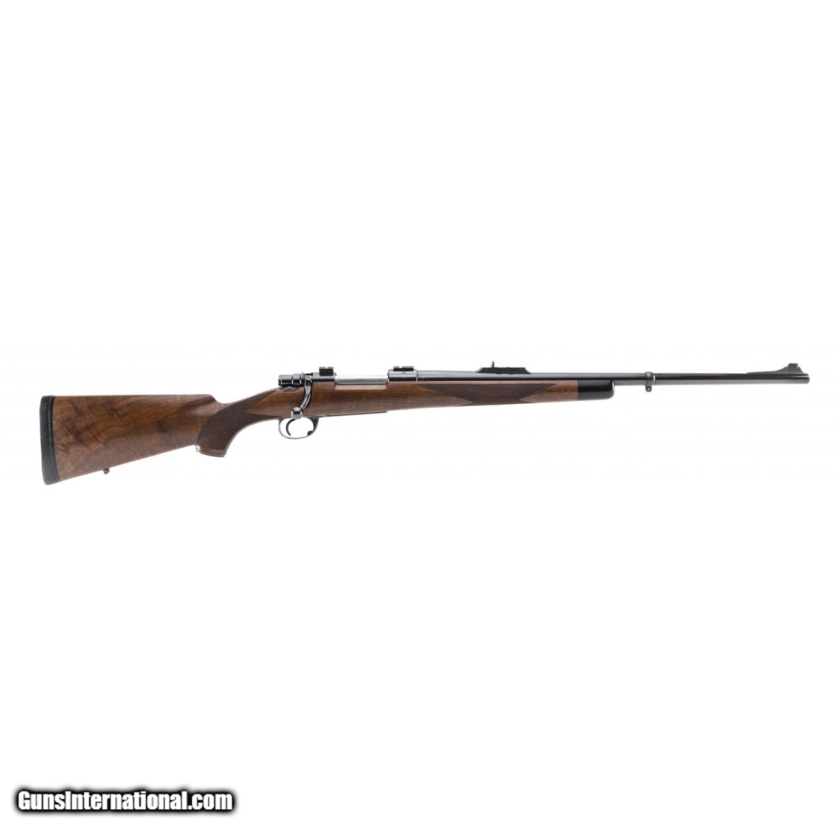 English made Deluxe Express rifle built on a Mauser action. Has a 3-leaf express sight, barrel band swivel mount and skeletonized pistol grip cap. The stock is of fancy figured walnut. A classic dangerous game rifle, in excellent condition.