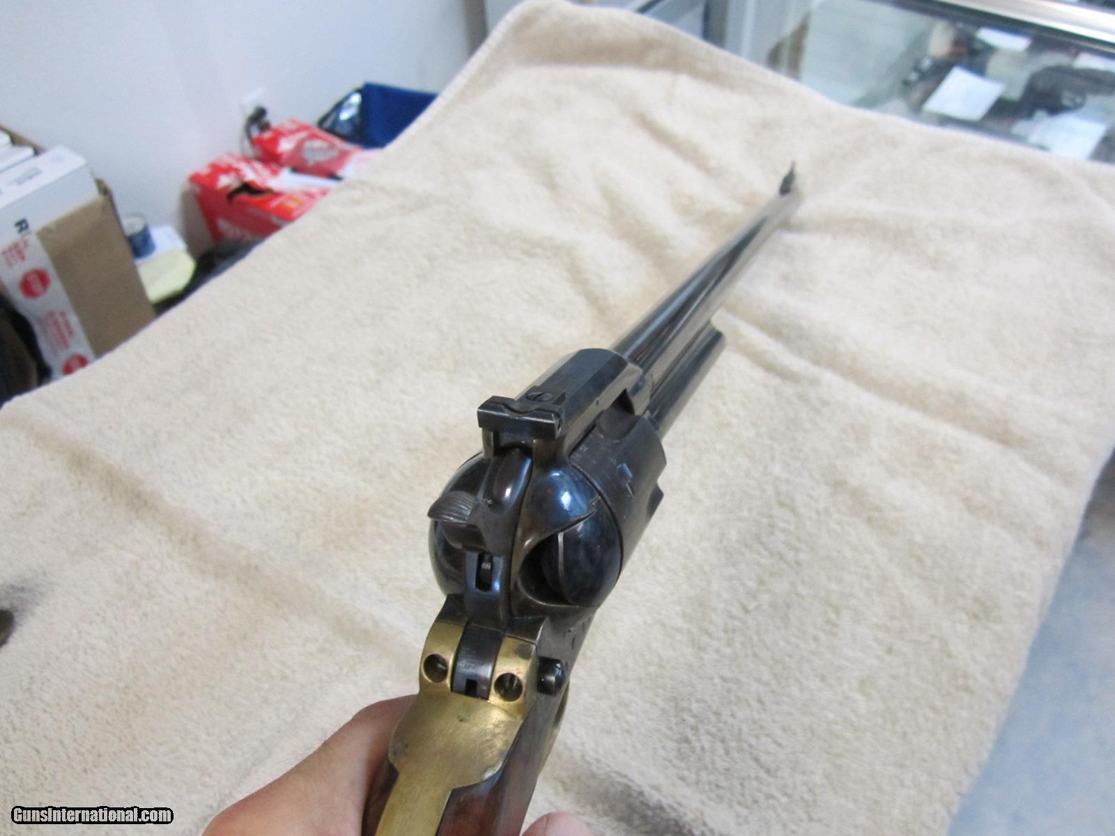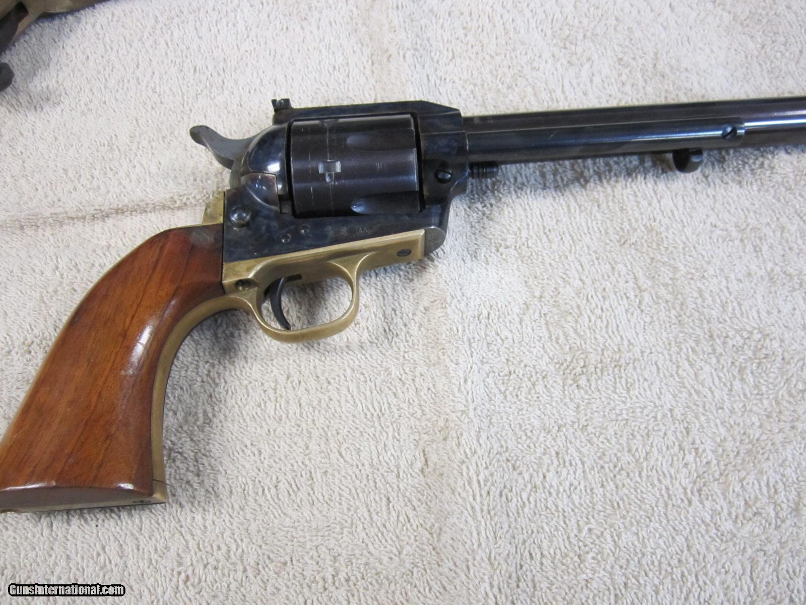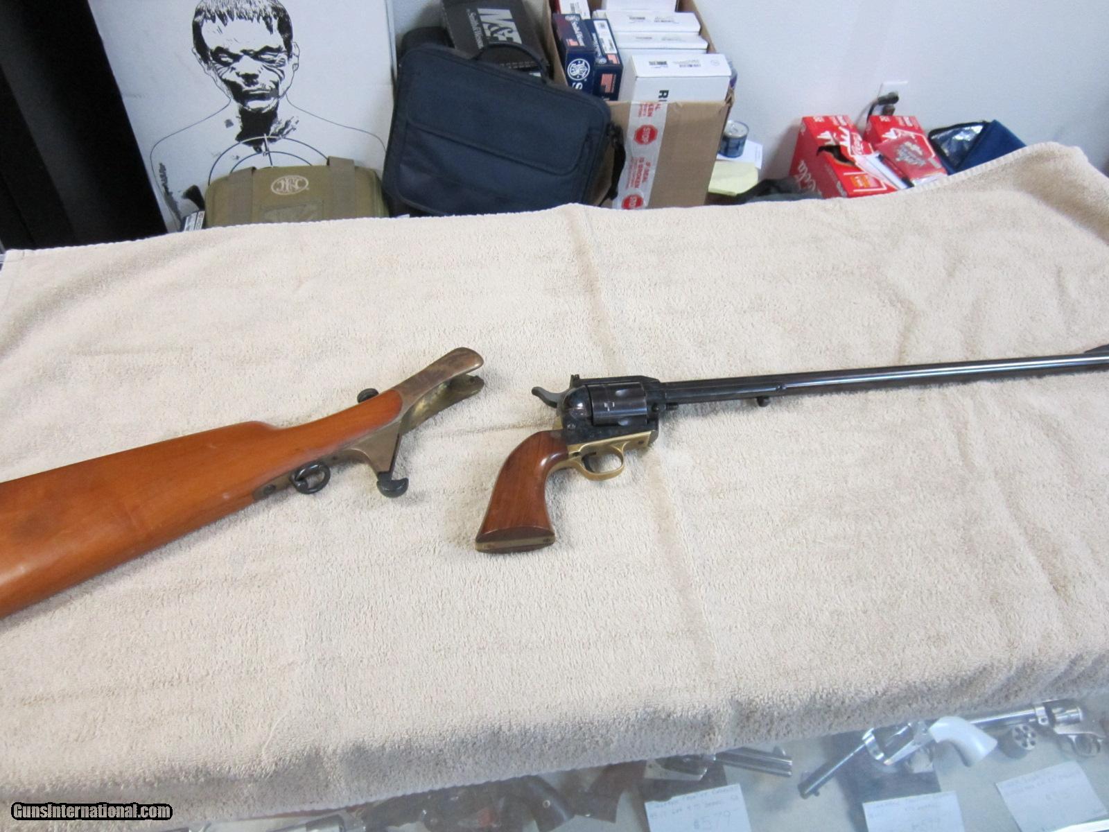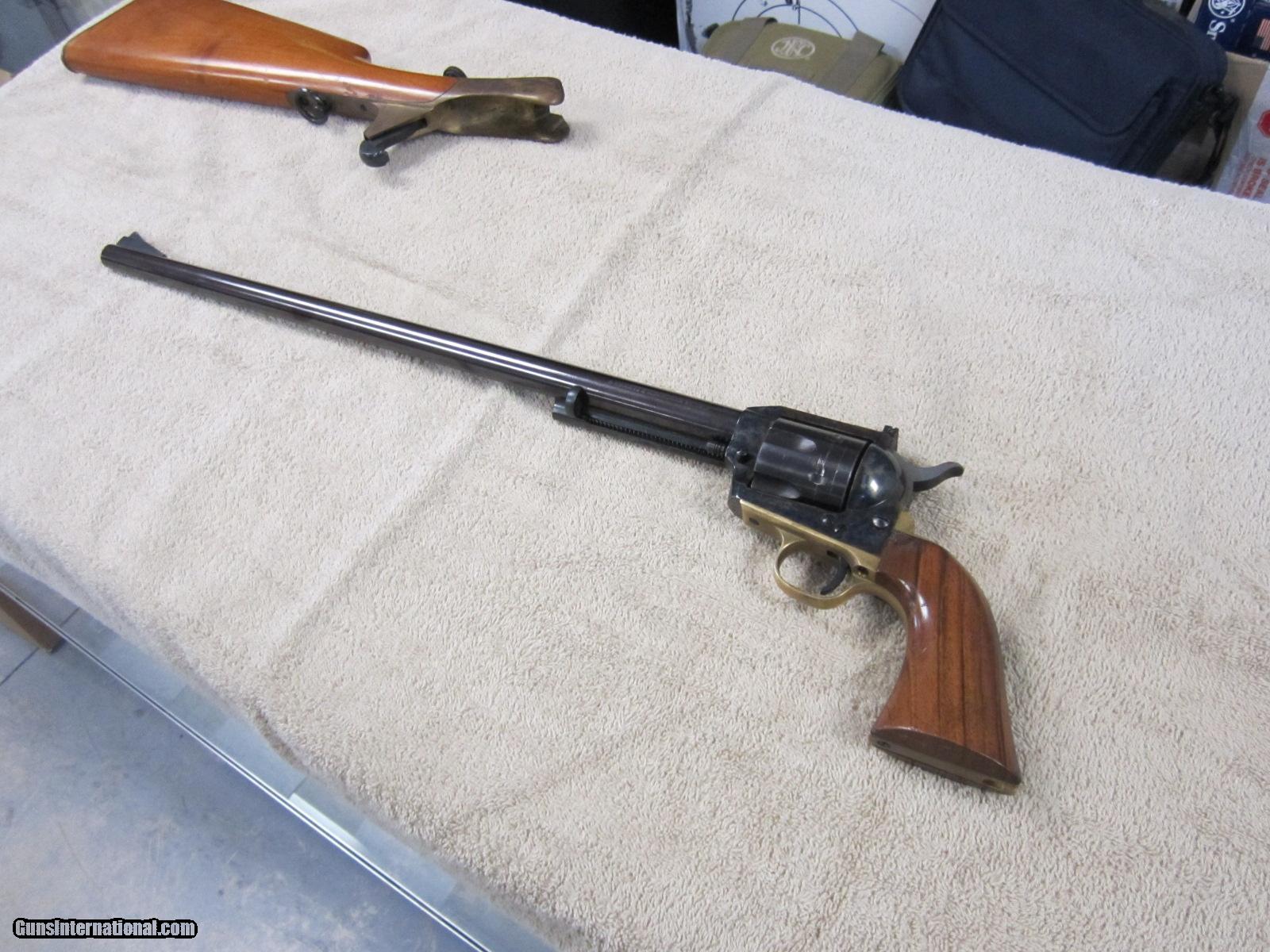 Description: This is a Iver Johnson Cattlemans Model rifle that has a 18' barrel and is chambered in .44 Magnum and was manufactured by Uberti. Great looking pice that has the detachable stock and case hardened frame. Very unique rifle. Shipping and insurance is $35.00. SOLD Manufacturer: Uberti Model: Cattleman Caliber Info: .44 Magnum Condition: used Item Location: Parker Az |
