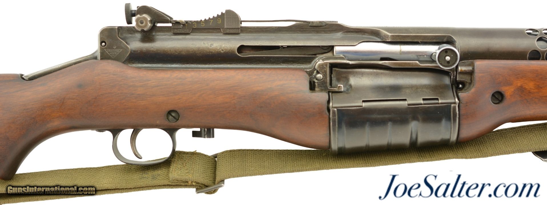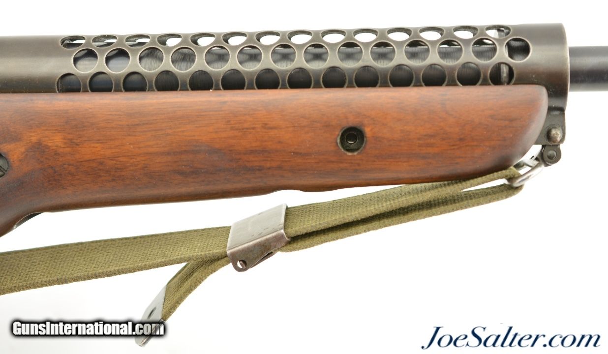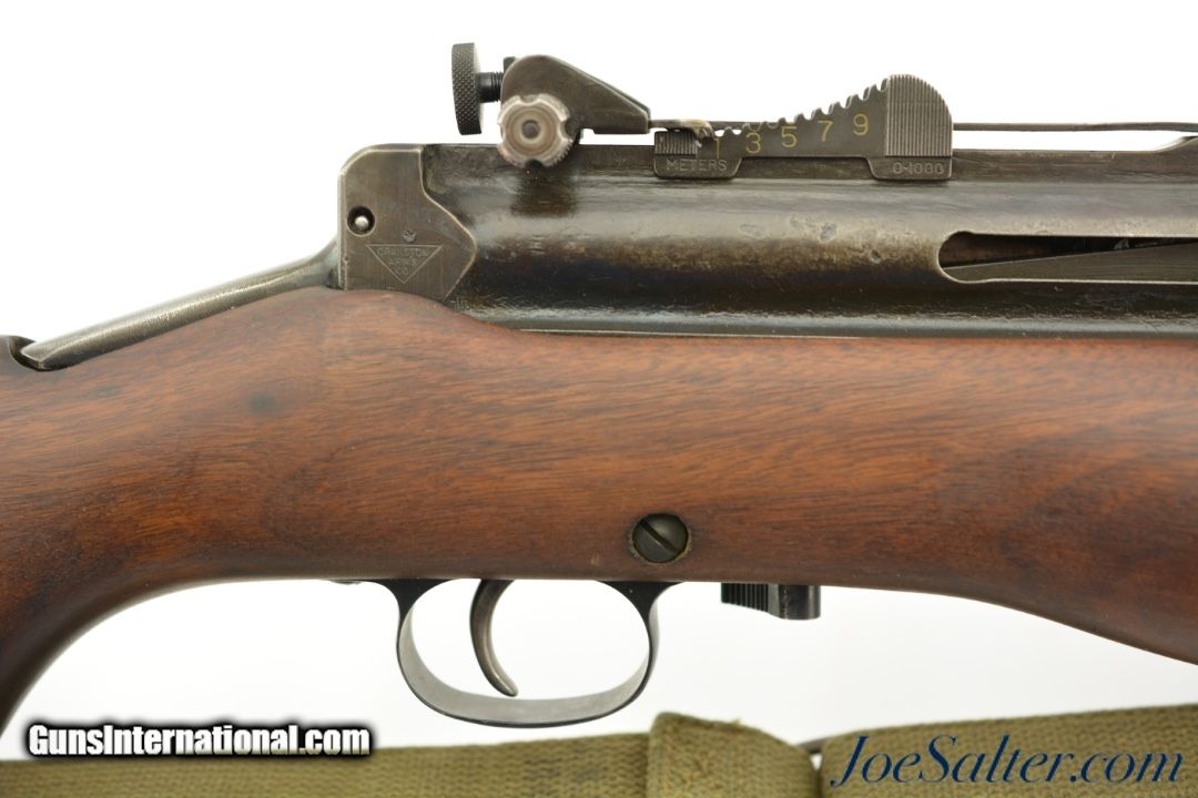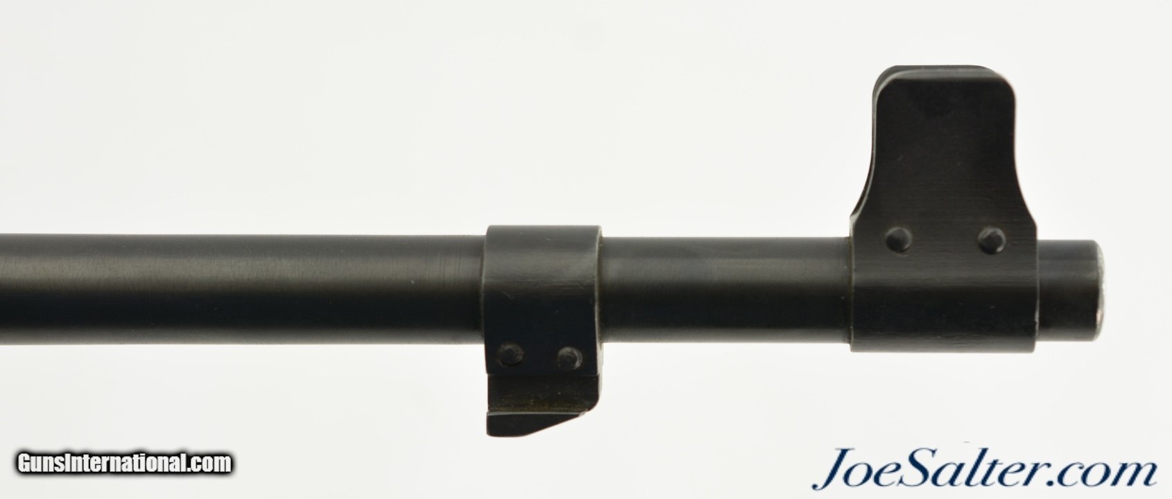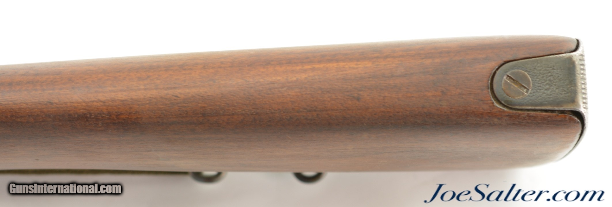 Description: Serial #9689, .30-06, 22" barrel with an excellent, bright bore. This is a handsome rifle that retains 85-90% of a professionally applied added blue finish that has silvered along the receiver and edges of the ventilated handguard, and also intentionally polished to bright on the bolt handle, breech end of the barrel (not visible when the barrel is dismounted), and muzzle crown. The right side of the receiver has the small Dutch colonial five-pointed star acceptance stamp above the "CRANSTON / ARMS / CO.", which is still quite sharp and clear. The barrel barrel bushing caliber marking is no longer visible and there are machining marks present on the face, but the underside of the barrel breech still has the "I (sword) O" proof applied to all of the Netherlands contract rifles. White paint has been added to the front sight blade for visibility, and a target aperture disk has been fitted to the rear sight. The walnut forend and buttstock are of the early "solid" type without laminated sections behind the rotary magazine, and have been nicely refinished to excellent condition with scattered minor handling marks throughout. Lastly, a 1948-dated MRT M1 canvas sling is installed. Also included with the rifle are an information packet with laminated disassembly instructions, and a 90 minute informational DVD from Joe Scott. The rifle is in very good-near fine condition, mechanically excellent, and would make a a great shootable addition to any collection. FFL or C&R; SOLD Curio/Relic: Yes |