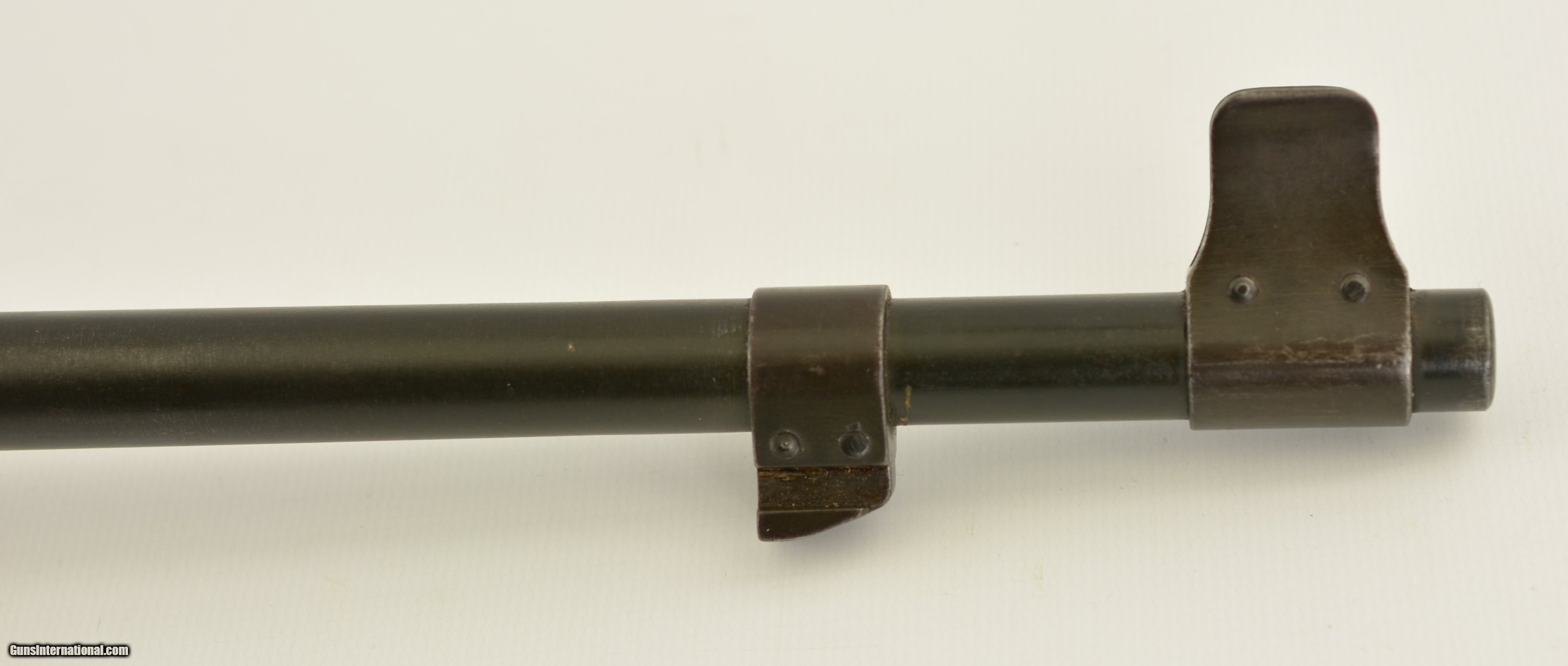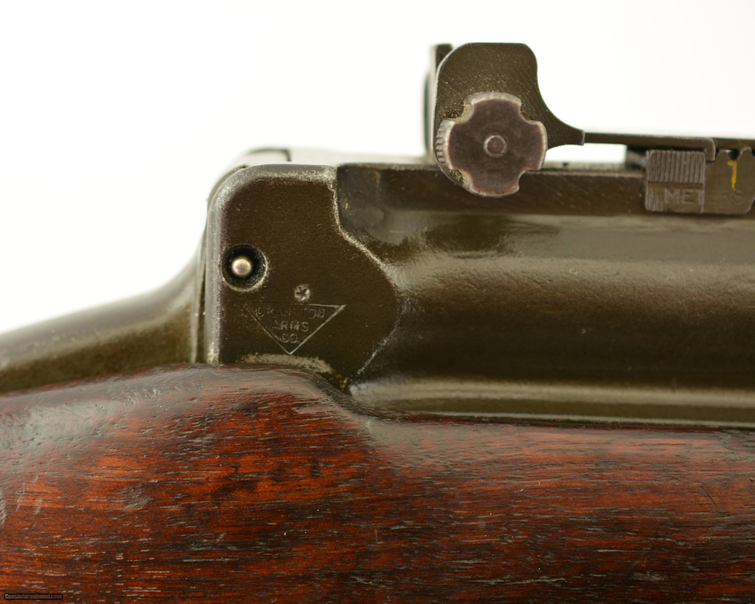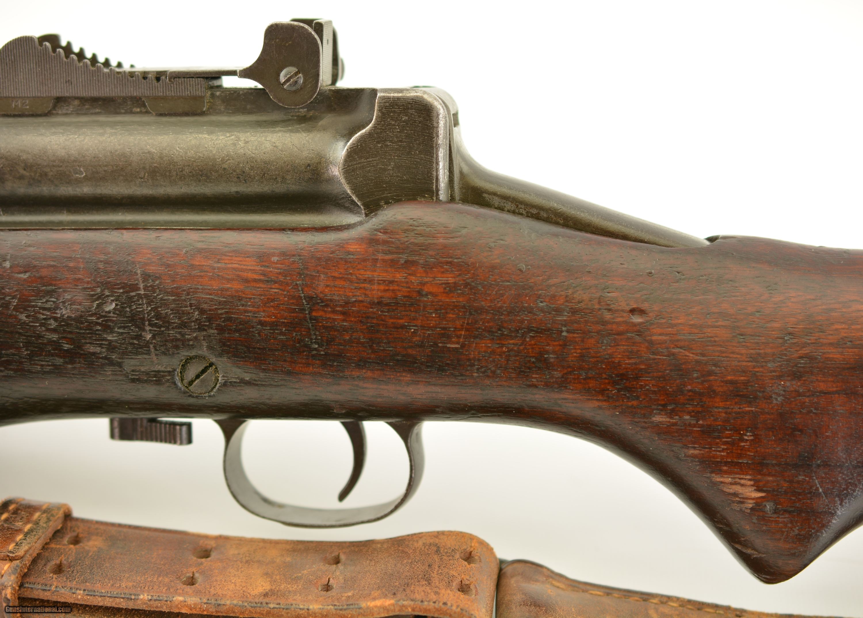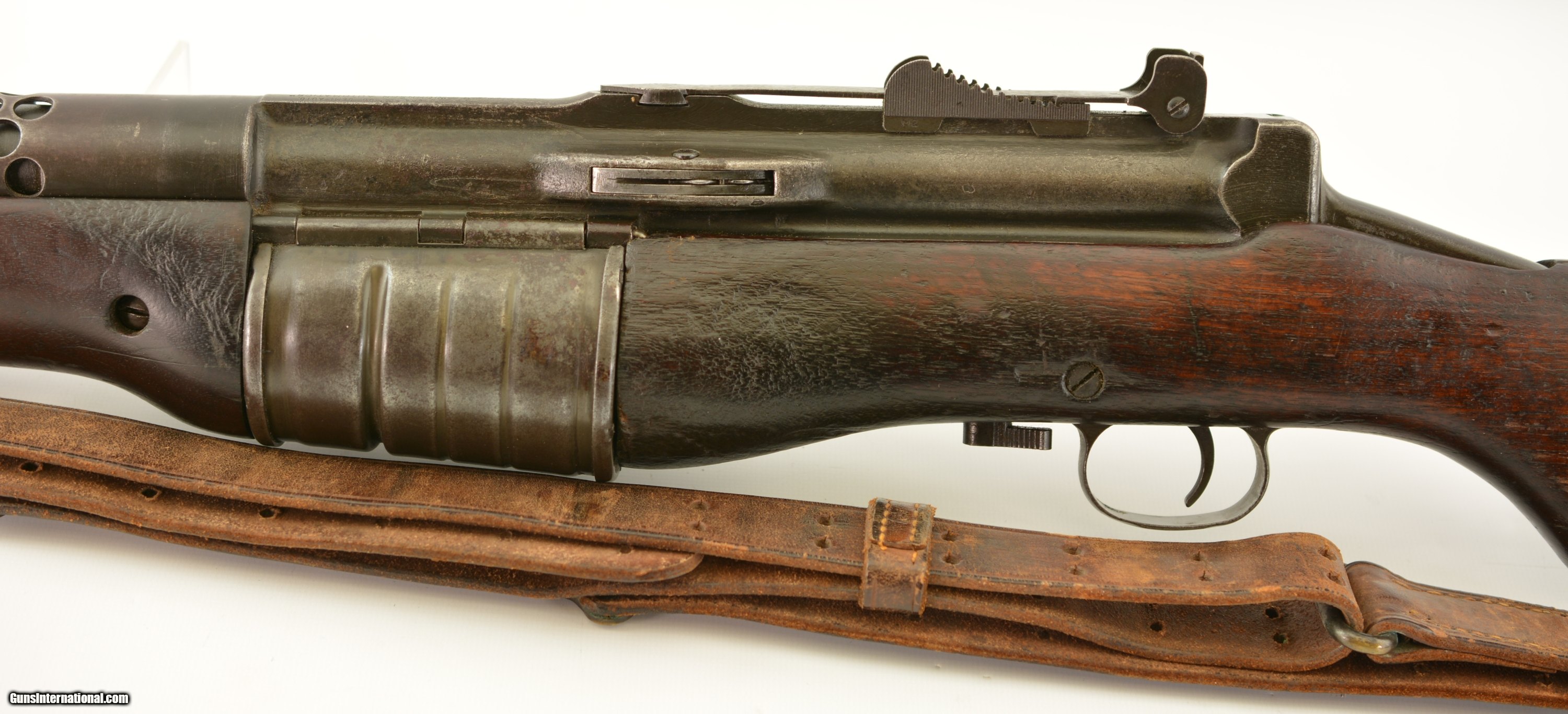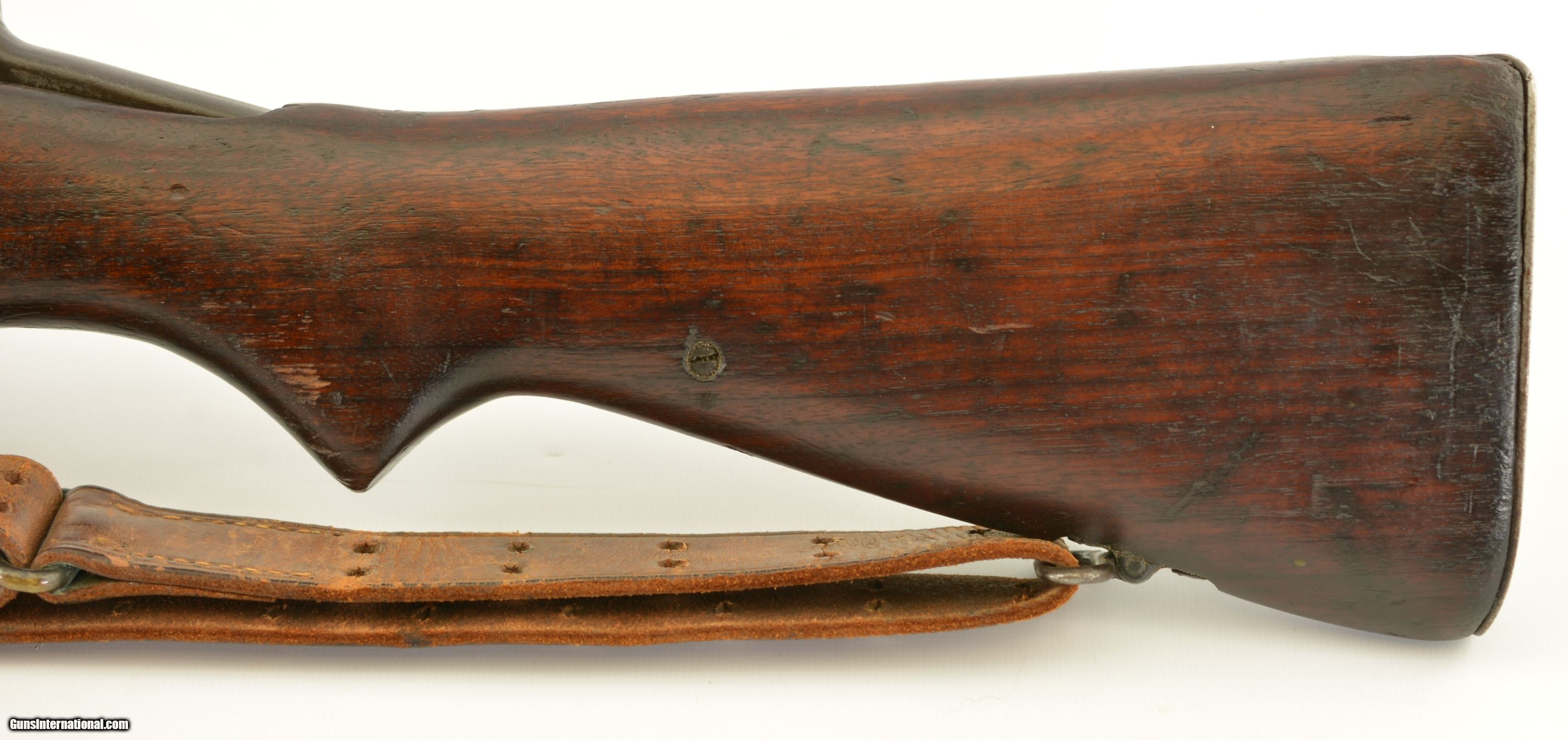 Description: Serial #A0470, .30-06, 22" barrel with an excellent, bright bore. This is a handsome rifle that retains 75-80% of the original parkerized finish that has silvered at the muzzle, and along the projecting edges. Wear can be seen on the bearing surfaces of the receiver around the ejection port, and there is mottled freckling on the left side of the receiver and rotary magazine housing. The right side of the receiver has the small Dutch colonial five-pointed star acceptance stamp above the triangular Cranston Arms Co. logo. There is further freckling and gray fading present on the ventilated handguard, as well as a dark plum-brown patina on the top and rear portions. The walnut forend and buttstock are in good condition with numerous minor handling marks, as well as several long scratches in the wood at the butt. A period M1907 style leather sling, heavily flaked, but still intact and serviceable, is installed. The rifle is mechanically excellent, and this is a very nice example of a desirable 1941 Johnson that rates very good plus overall. FFL or C&R SOLD Curio/Relic: Yes Manufacturer: Johnson Model: 1941 Serial Number: A0470 Caliber Info: .30-06 Gauge Info: .30-06 |
