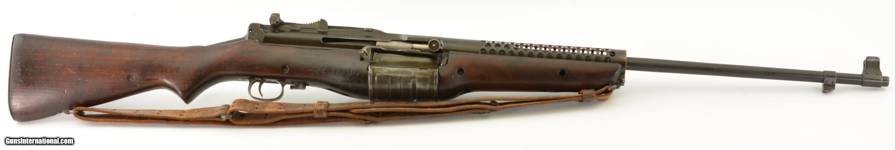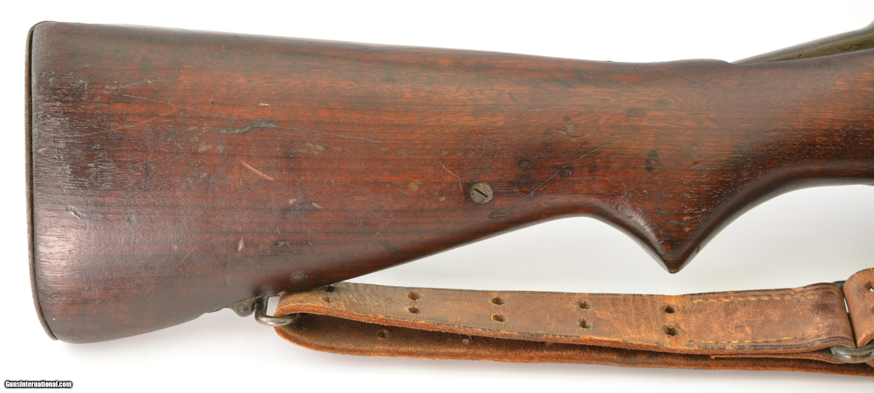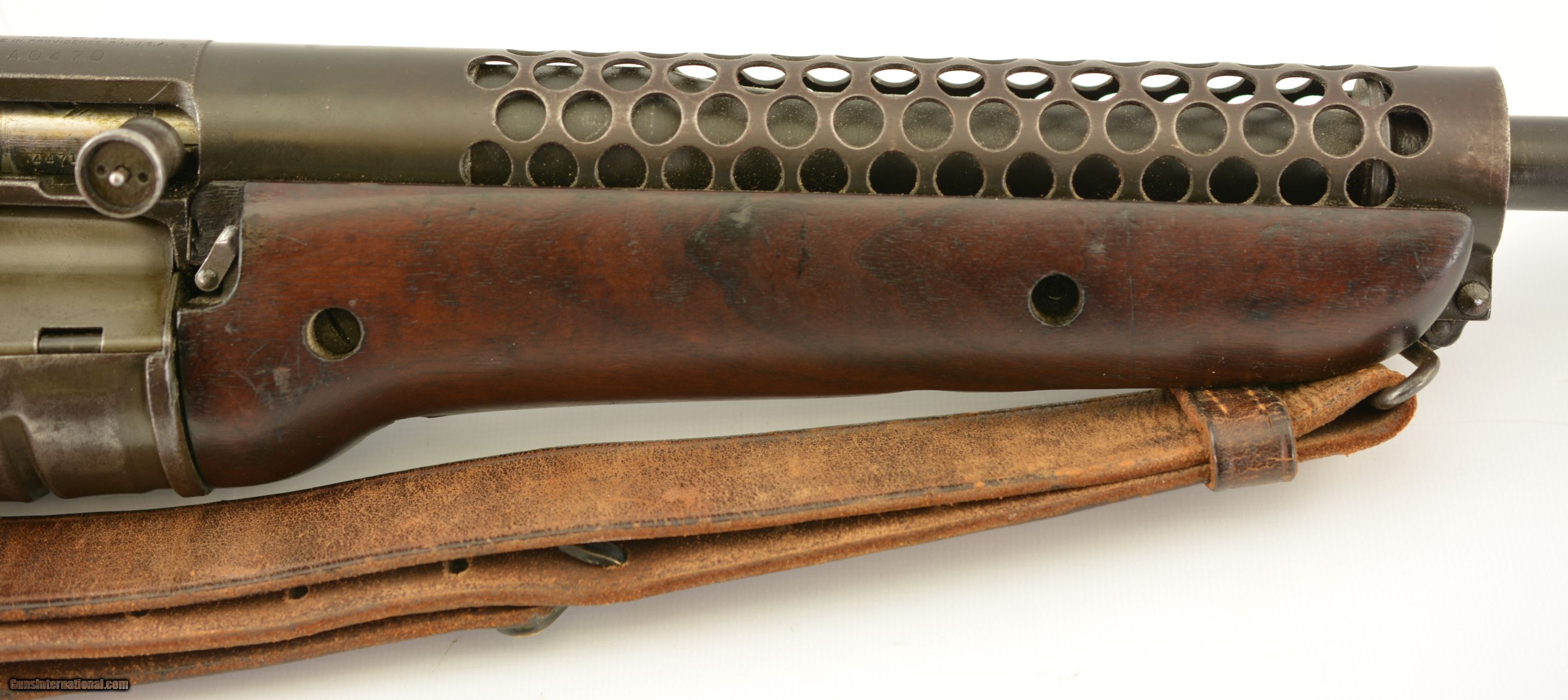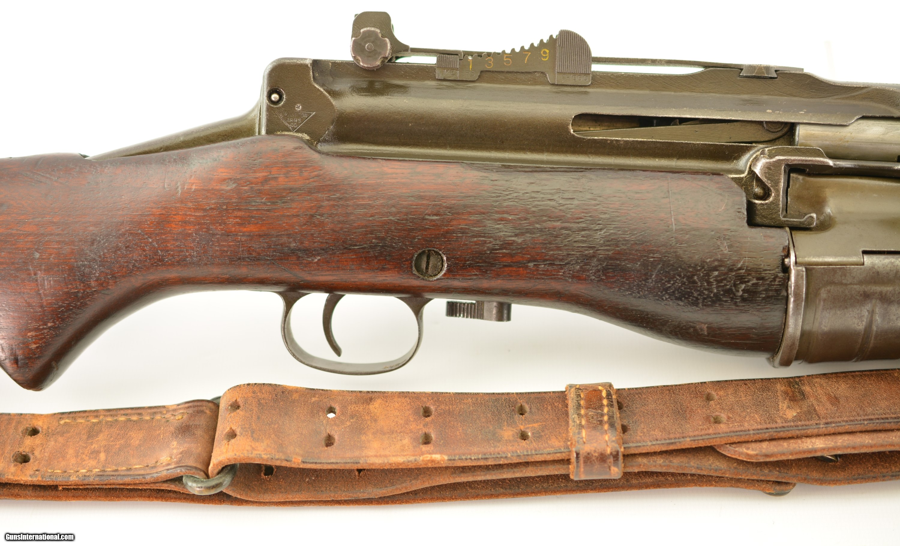 Description: Serial #A0470, .30-06, 22" barrel with an excellent, bright bore. This is a handsome rifle that retains 75-80% of the original parkerized finish that has silvered at the muzzle, and along the projecting edges. Wear can be seen on the bearing surfaces of the receiver around the ejection port, and there is mottled freckling on the left side of the receiver and rotary magazine housing. The right side of the receiver has the small Dutch colonial five-pointed star acceptance stamp above the triangular Cranston Arms Co. logo. There is further freckling and gray fading present on the ventilated handguard, as well as a dark plum-brown patina on the top and rear portions. The walnut forend and buttstock are in good condition with numerous minor handling marks, as well as several long scratches in the wood at the butt. A period M1907 style leather sling, heavily flaked, but still intact and serviceable, is installed. The rifle is mechanically excellent, and this is a very nice example of a desirable 1941 Johnson that rates very good plus overall. FFL or C&R SOLD Curio/Relic: Yes Manufacturer: Johnson Model: 1941 Serial Number: A0470 Caliber Info: .30-06 Gauge Info: .30-06 |