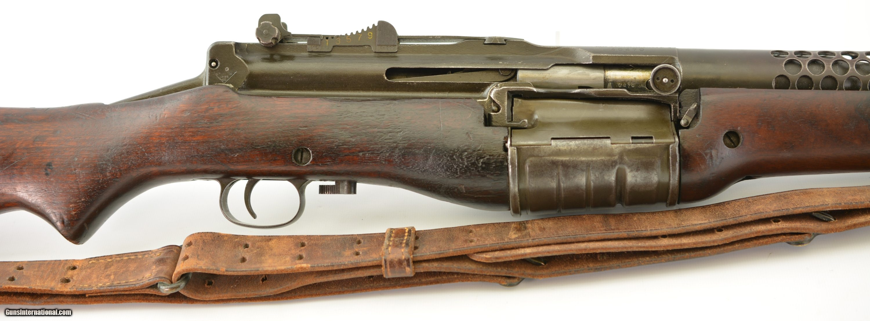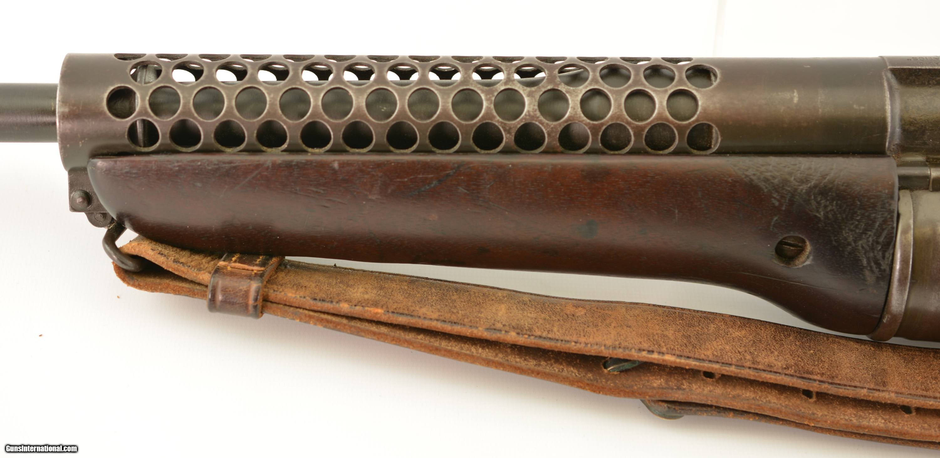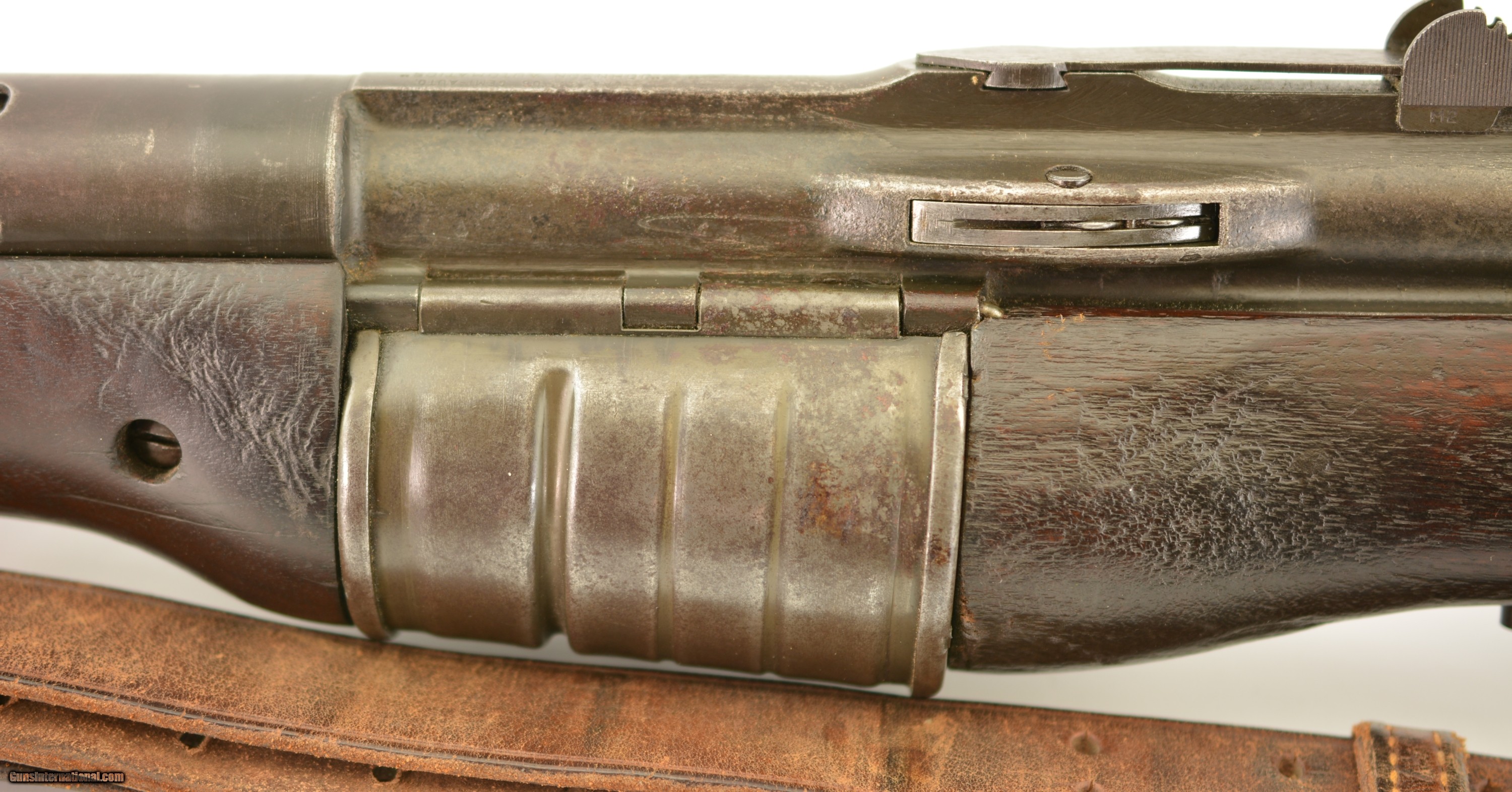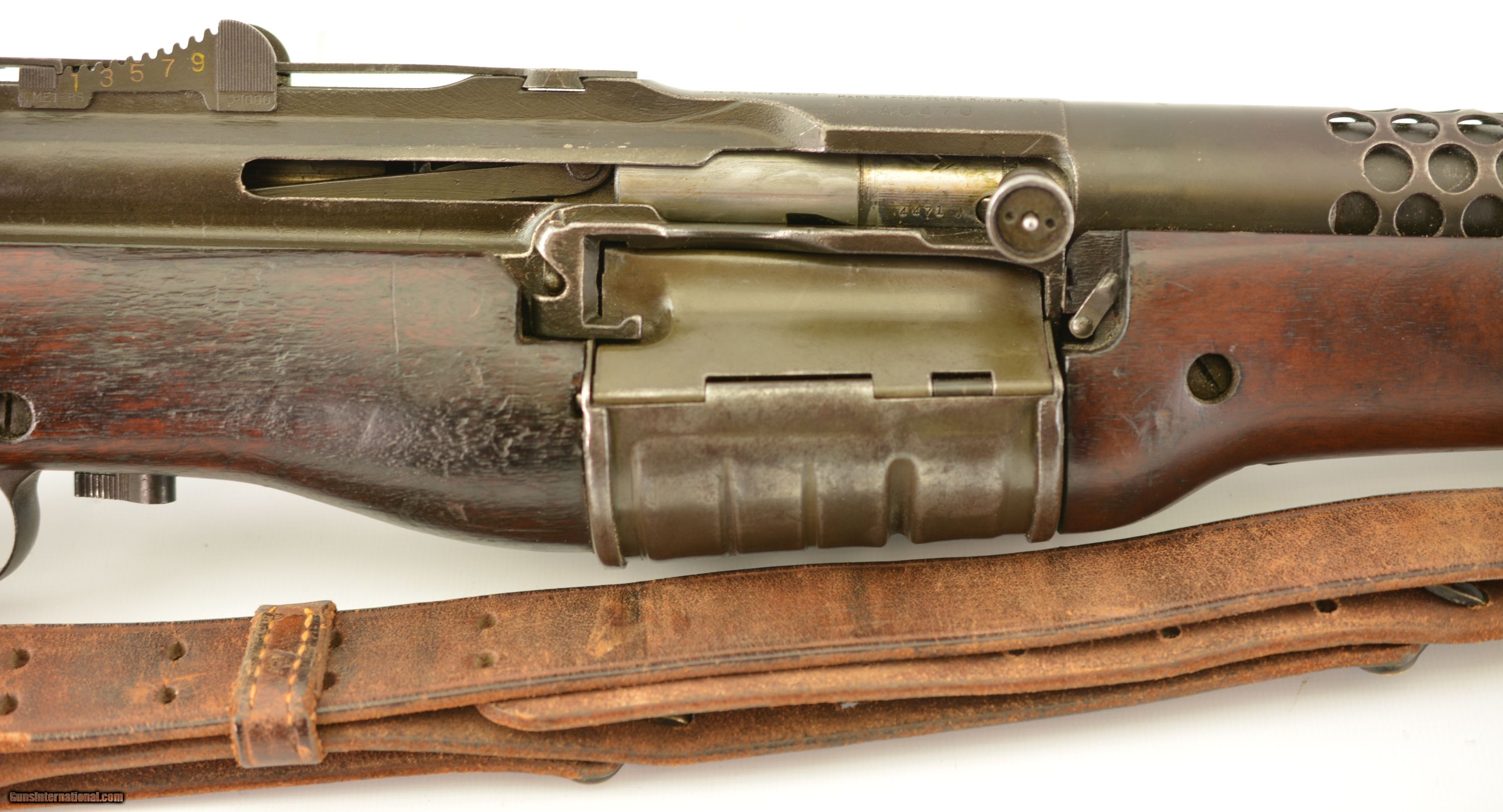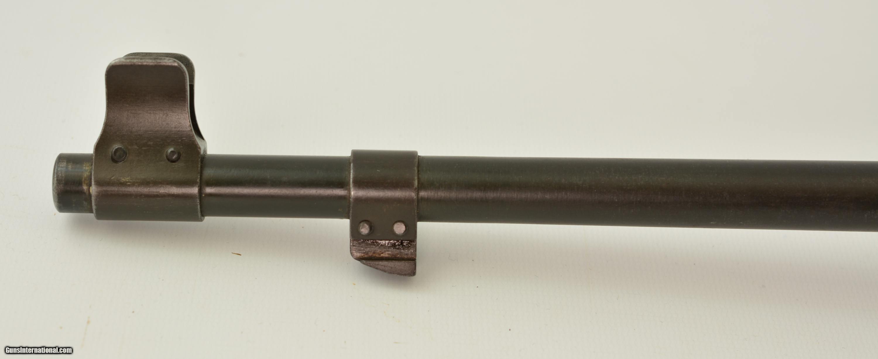 Description: Serial #A0470, .30-06, 22" barrel with an excellent, bright bore. This is a handsome rifle that retains 75-80% of the original parkerized finish that has silvered at the muzzle, and along the projecting edges. Wear can be seen on the bearing surfaces of the receiver around the ejection port, and there is mottled freckling on the left side of the receiver and rotary magazine housing. The right side of the receiver has the small Dutch colonial five-pointed star acceptance stamp above the triangular Cranston Arms Co. logo. There is further freckling and gray fading present on the ventilated handguard, as well as a dark plum-brown patina on the top and rear portions. The walnut forend and buttstock are in good condition with numerous minor handling marks, as well as several long scratches in the wood at the butt. A period M1907 style leather sling, heavily flaked, but still intact and serviceable, is installed. The rifle is mechanically excellent, and this is a very nice example of a desirable 1941 Johnson that rates very good plus overall. FFL or C&R SOLD Curio/Relic: Yes Manufacturer: Johnson Model: 1941 Serial Number: A0470 Caliber Info: .30-06 Gauge Info: .30-06 |