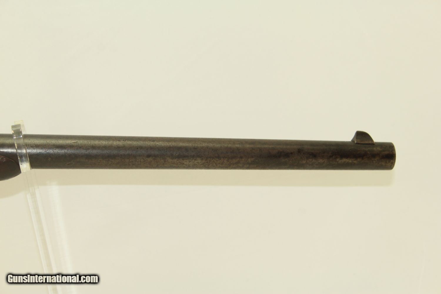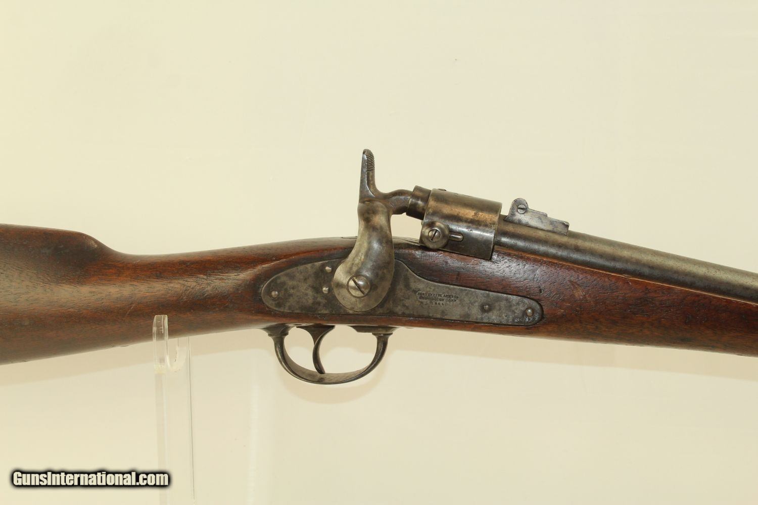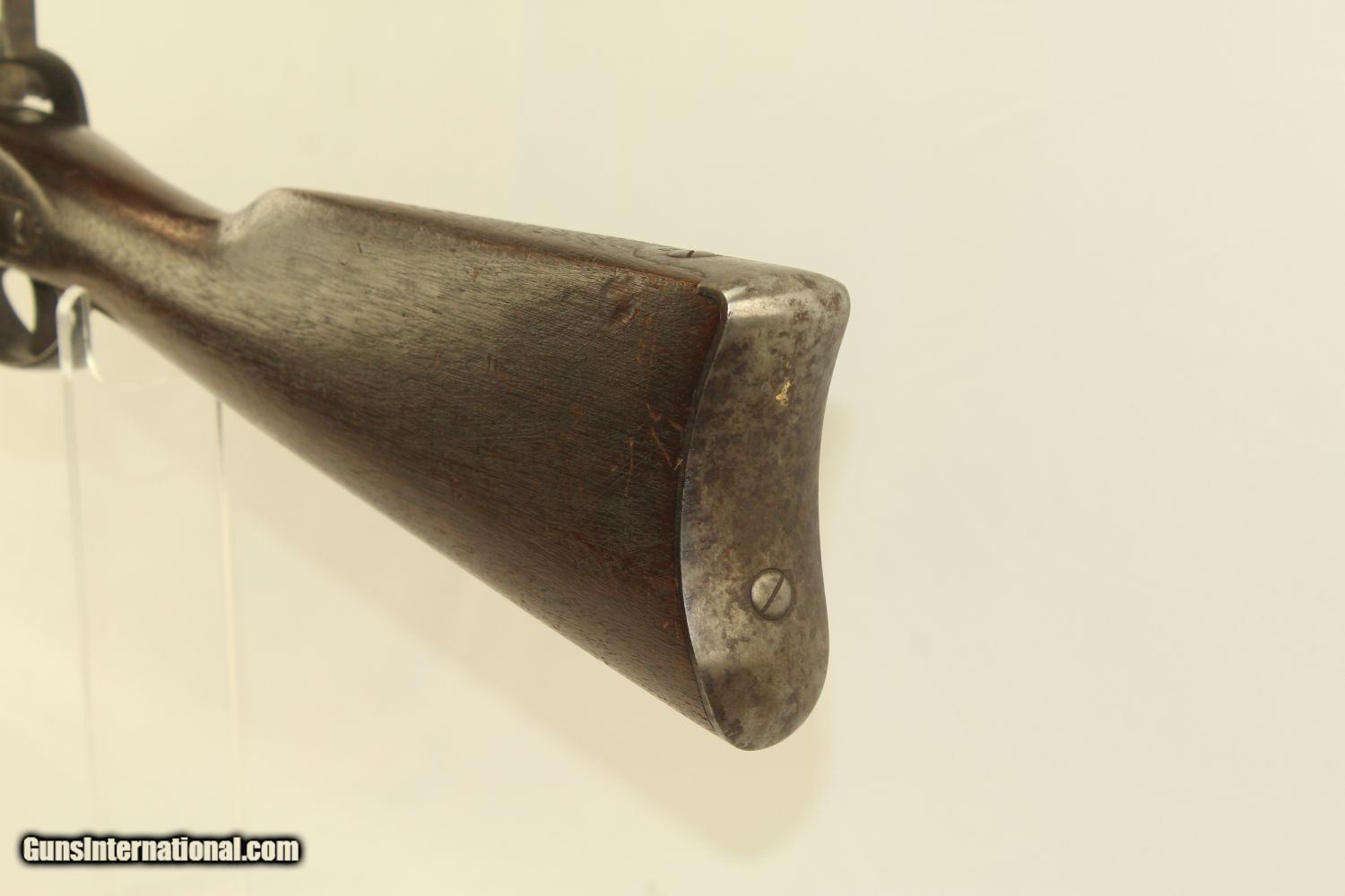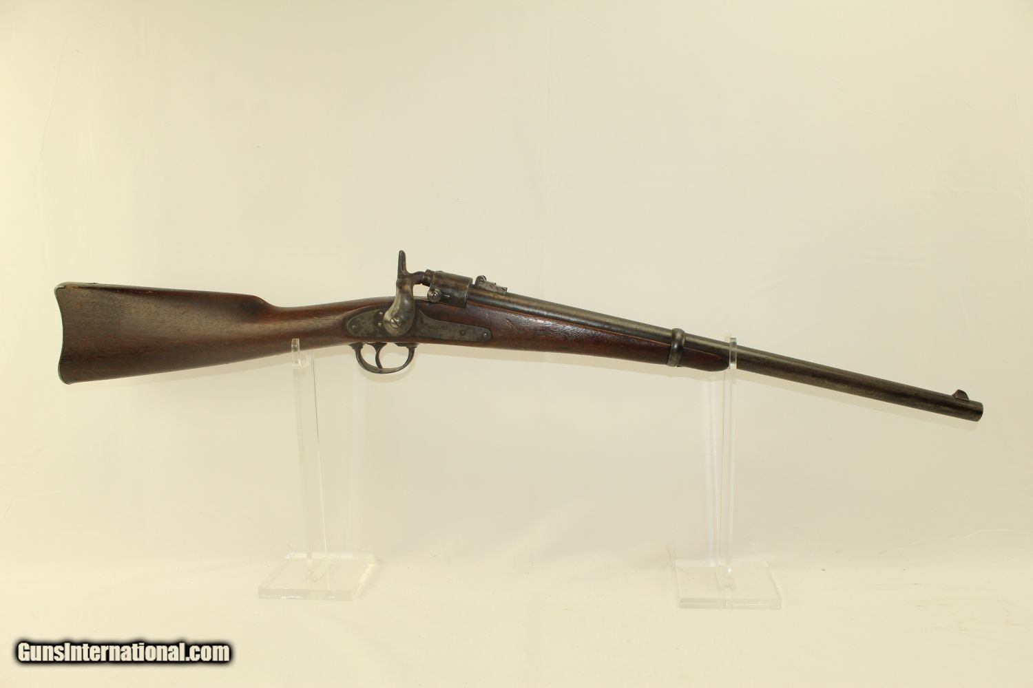 Description: Antique CIVIL WAR JOSLYN Cavalry .54 CARBINE Used by Many Union State Cavalries! Here we present an antique Joslyn Model 1864 Civil War Cavalry Breech Loading Saddle Ring Carbine, made circa 1864 in Stonington, Connecticut. Benjamin Franklin Joslyn was the inventor, holding over 25 firearms patents. 8,000 of these carbines were purchased by the Union during the American Civil War, and they all saw service, being heavily allocated to cavalry regiments such as the 4th and 8th Indiana, 19th New York, 13th Tennessee, 9th Pennsylvania, 3rd West Virginia, 2nd Wisconsin, 1st Nebraska, 1st Nevada and 11th Ohio. As a result of his success with the carbine, the federal government ordered 3,000 of his breech-loading actions in order to build the U.S. National armory made breech-loading rifles. These were made for the proprietary cartridge called the 50-60-450 Joslyn Rimfire. This pre-dates the Allin conversion and some of these 3,000 rifles are suspected to have been issued and used just before the end of the American Civil War. The lock is marked “JOSLYN FIRE ARMS CO/ STONINGTON CONN./1864”. There are faint cartouches on the stock. Inspector markings are found throughout. The overall condition is very good. The iron parts are dark with age. The markings are clear. The numbers match. The stock is in good shape with the kind of handling marks you would expect. The bore is dim with strong rifling. The action is excellent. Own the original! This is a legitimate antique and not a reproduction. Barrel is 22 inches. Caliber: .54 Overall condition as seen in photos. Very Fast. Very Safe. FREE SHIPPING WORLDWIDE. Delivered directly to your door by express mail! Guaranteed AUTHENTIC & Includes CERTIFICATE OF AUTHENTICITY. ancestryguns $2200 #190100 SOLD Antique: Yes |
