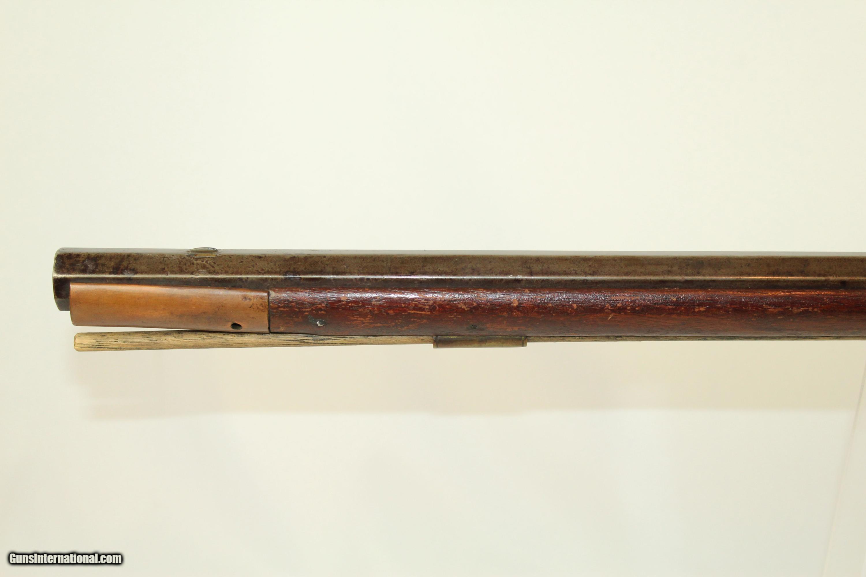 Description: “Van Teague” Antique Full Stock Kentucky Rifle American Long Rifle made Circa 1840 Here we present an antique Full Stock Percussion Rifle, made circa 1840. The American Longrifle, more commonly, but less correctly, known as the 'Kentucky rifle', was described by Captain John G. W. Dillin in the dedication to his seminal 1924 book, The Kentucky Rifle: “From a flat bar of soft iron, hand forged into a gun barrel; laboriously bored and rifled with crude tools; fitted with a stock hewn from a maple tree in the neighboring forest; and supplied with a lock hammered to shape on the anvil; an unknown smith, in a shop long since silent, fashioned a rifle which changed the whole course of world history; made possible the settlement of a continent; and ultimately freed our country of foreign domination. Light in weight; graceful in line; economical in consumption of powder and lead; fatally precise; distinctly American; it sprang into immediate popularity; and for a hundred years was a model often slightly varied but never radically changed.” This .44 caliber rifle is marked “Van Teague” at the toe of the butt stock. This may have been the maker or the original owner. The right side of the butt stock features a nice brass patchbox. It has a brass trigger guard and butt plate as well. There is a bit of decorative engraving on the top of the barrel, as well as possible maker marks that have worn over time. The overall condition is good. The metal surfaces are dark with age. The stock has been repaired around the wrist and lock. The bore is well-rifled and dark, with a bit of oxidation. The action is functional, with no half-cock. The set trigger does not function. Own the original! This is a legitimate antique and not a reproduction. Barrel is 38-1/4 inches in length. Caliber: .44 Overall condition as seen in photos. Very Fast. Very Safe. FREE SHIPPING WORLDWIDE. Delivered directly to your door by express mail! Guaranteed AUTHENTIC & Includes CERTIFICATE OF AUTHENTICITY. ancestryguns $1400 #10506 SOLD Antique: Yes |