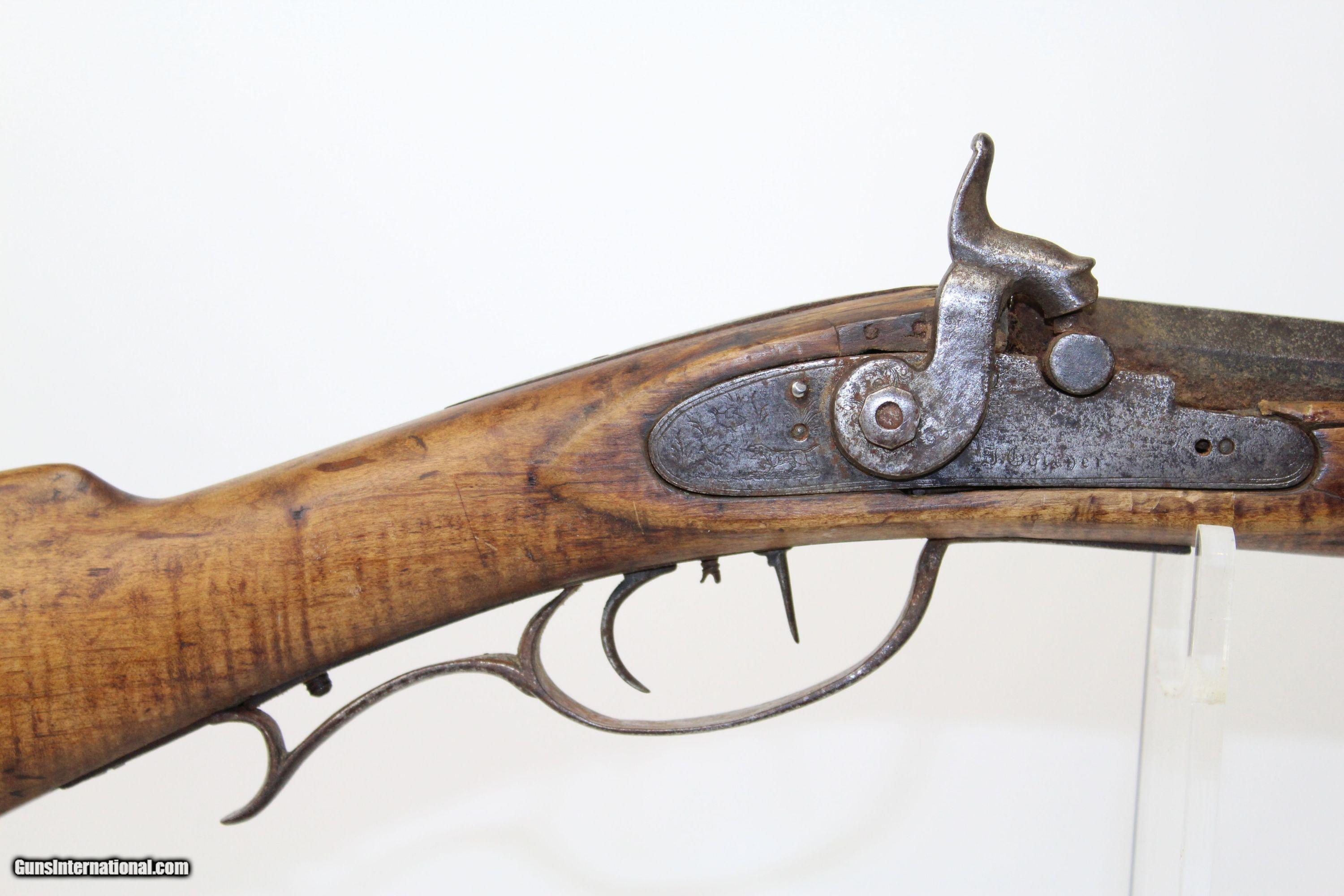 Description: Antique AMERICAN Full-Stock LONG RIFLE in Percussion With “J. GOLCHER” Lock with Hunting Scene Here we present an antique Kentucky Full-Stock Long Rifle, made circa 1840. The American Longrifle, more commonly, but less correctly, known as the 'Kentucky rifle', was described by Captain John G. W. Dillin in the dedication to his seminal 1924 book, The Kentucky Rifle: “From a flat bar of soft iron, hand forged into a gun barrel; laboriously bored and rifled with crude tools; fitted with a stock hewn from a maple tree in the neighboring forest; and supplied with a lock hammered to shape on the anvil; an unknown smith, in a shop long since silent, fashioned a rifle which changed the whole course of world history; made possible the settlement of a continent; and ultimately freed our country of foreign domination. Light in weight; graceful in line; economical in consumption of powder and lead; fatally precise; distinctly American; it sprang into immediate popularity; and for a hundred years was a model often slightly varied but never radically changed.” The lock is a “J. GOLCHER” marked example with a hunting scene with dog and bird. The overall condition is fair. The metal has a nice dark patina. The markings are visible. The bore is well-rifled and dusty. The action is functional. The rear trigger must be set first. Here is a great iconic American rifle to hang above the fireplace! Own the original! This is a legitimate antique and not a reproduction. Barrel is 37-1/2 inches. Caliber: .40 Percussion Overall condition as seen in photos. Very Fast. Very Safe. FREE SHIPPING WORLDWIDE. Delivered directly to your door by express mail! Guaranteed AUTHENTIC & Includes CERTIFICATE OF AUTHENTICITY. ancestryguns $800 #5470 SOLD Antique: Yes |