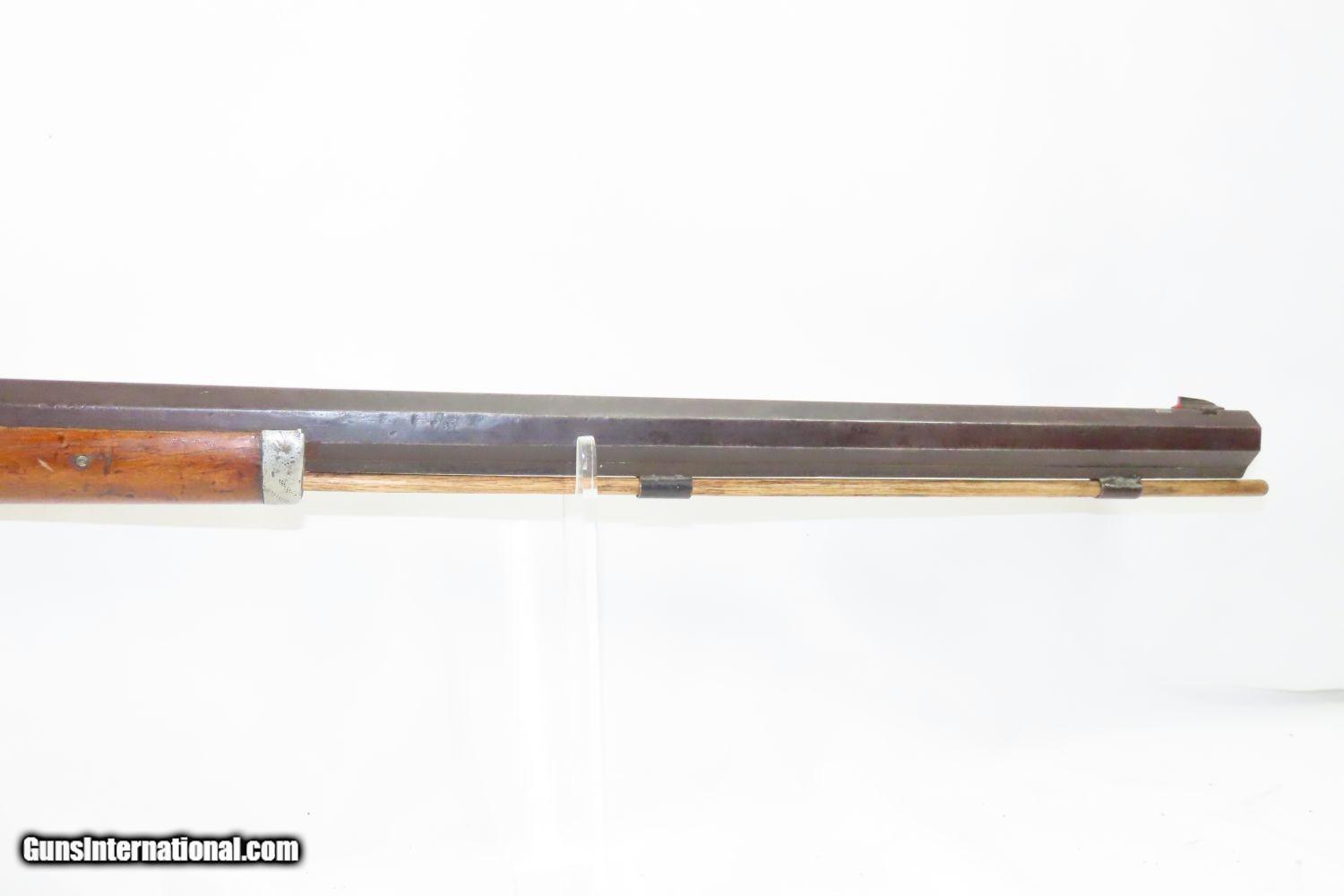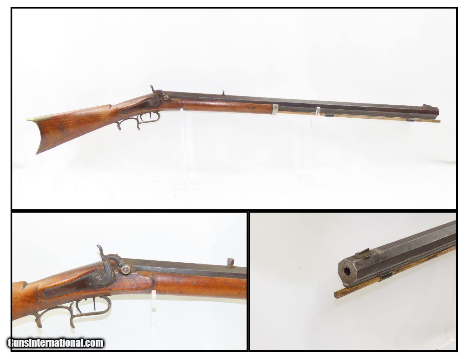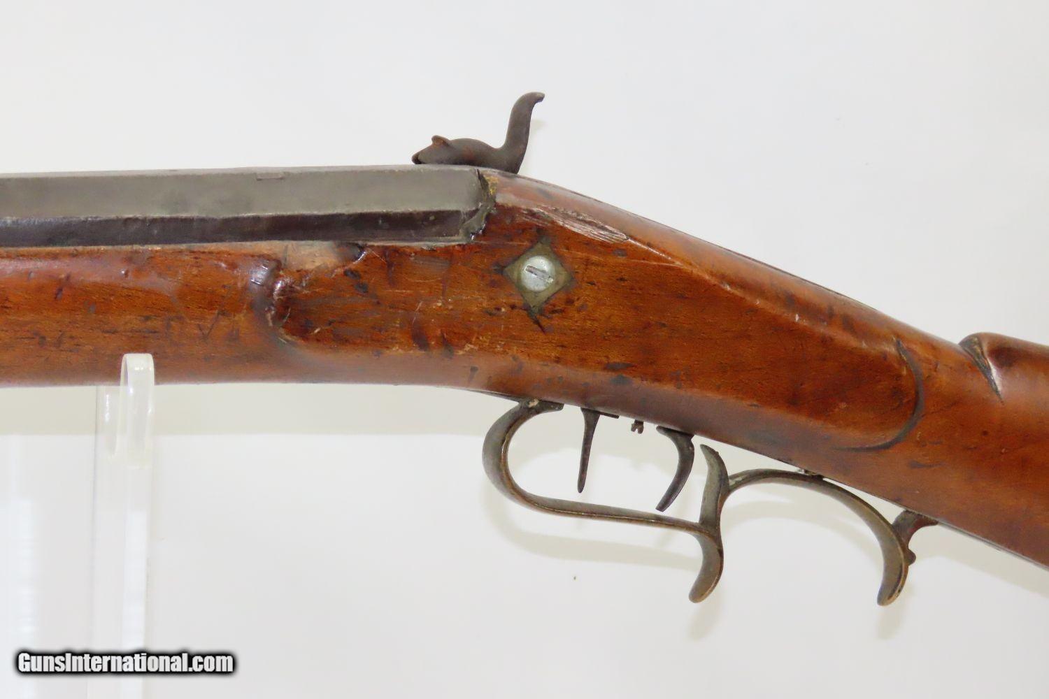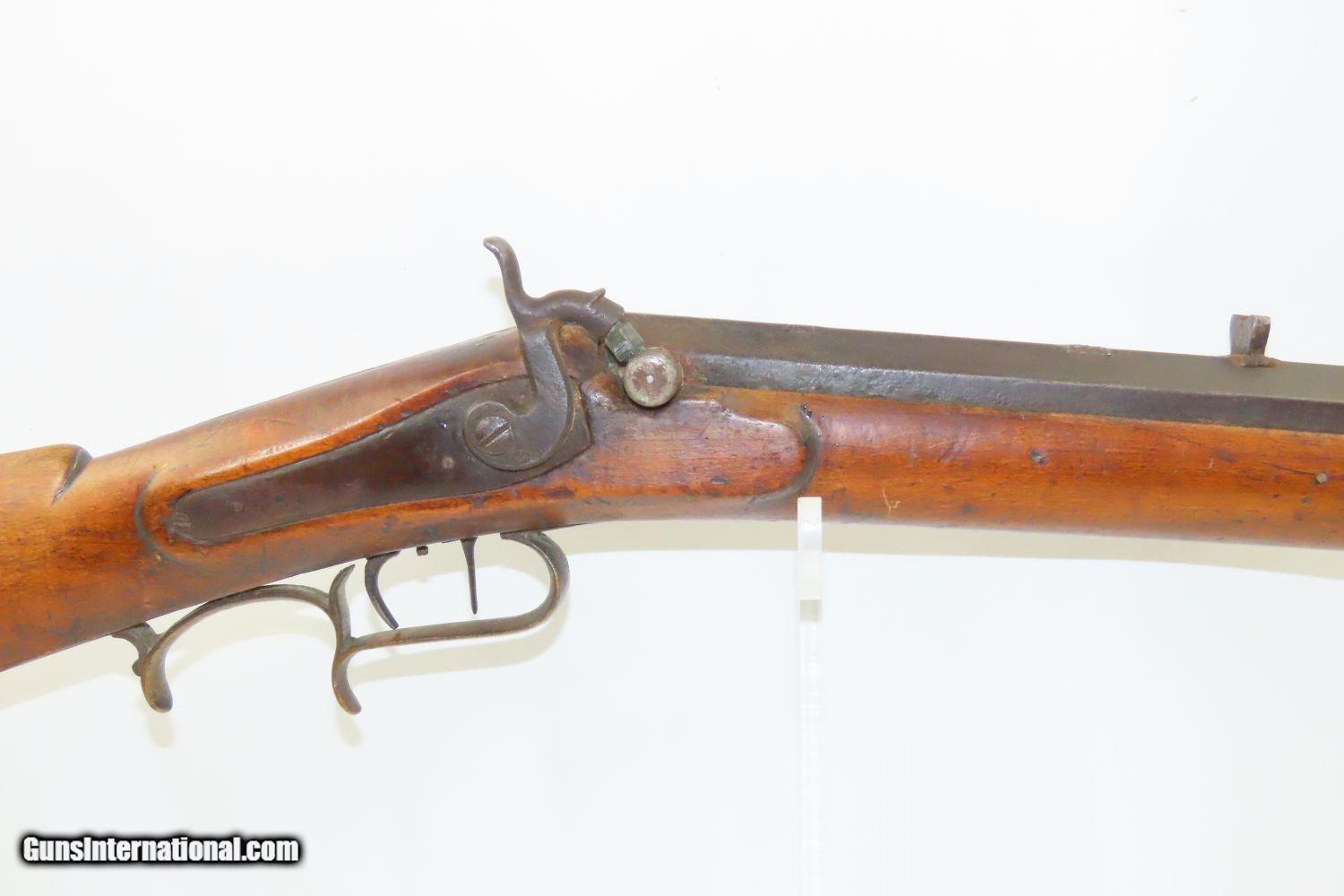 Description: Antique BACK ACTION Half Stock HEAVY BARREL Percussion .42 Cal. Long Rifle Kentucky Style Long Rifle Made Circa 1850! Here we present an antique Back Action Half Stock Heavy Barrel Percussion Long Rifle, made circa the mid-19th Century. Its stout octagonal barrel is in .42 caliber, large enough to take small to medium sized game or to defend the homestead against unwanted aggression. Rifle manufacture in the mid-to-late 19th Century was rapidly changing over from thousands of craftsmen all over the United States and on the Frontier making and selling their wares, to the large factories with standardized assembly lines and modern manufacturing techniques. Many makers’ names of the so-called Kentucky long rifles have been lost over time. This rifle is one such example. These locks were called “back action” because the mainspring hangs behind the tumbler. The back action is often used in double rifles and occasionally in single barrel shotguns where the need for strength requires as little steel as possible be removed from the bar of the action. This lock was popular on percussion guns made in St. Louis, New York, California, Ohio, England and Belgium. Back Action percussion locks were a “late” developed style of lock. Used primarily on the hardware store line of guns, these locks did, however, show up on some better pieces in the mid-to-late 1800′s. The overall condition is good. Strong action. Semi-bright bore. This example sports a solid stock all around! The barrel is massive, as this example weighs in at 13 lbs! Here is a hearty, antique back action rifle to add to the collection! Own the original! This is a legitimate antique and not a reproduction. Barrel is 32 inches. Caliber: .42 Percussion Overall condition as seen in photos. Very Fast. Very Safe. FREE SHIPPING WORLDWIDE. Delivered directly to your door by express mail! Guaranteed AUTHENTIC & Includes CERTIFICATE OF AUTHENTICITY. ancestryguns $1165 #210433 SOLD Antique: Yes |
